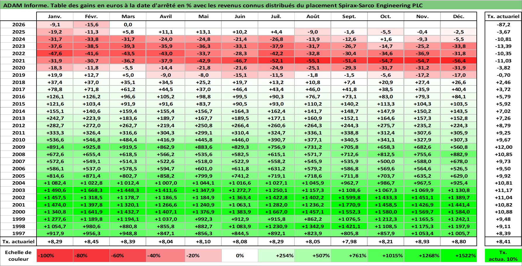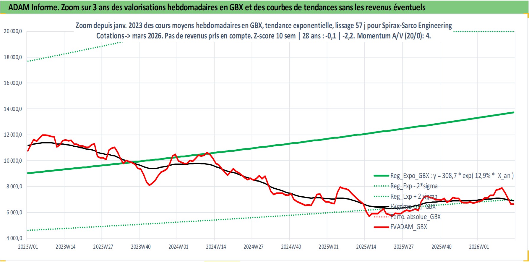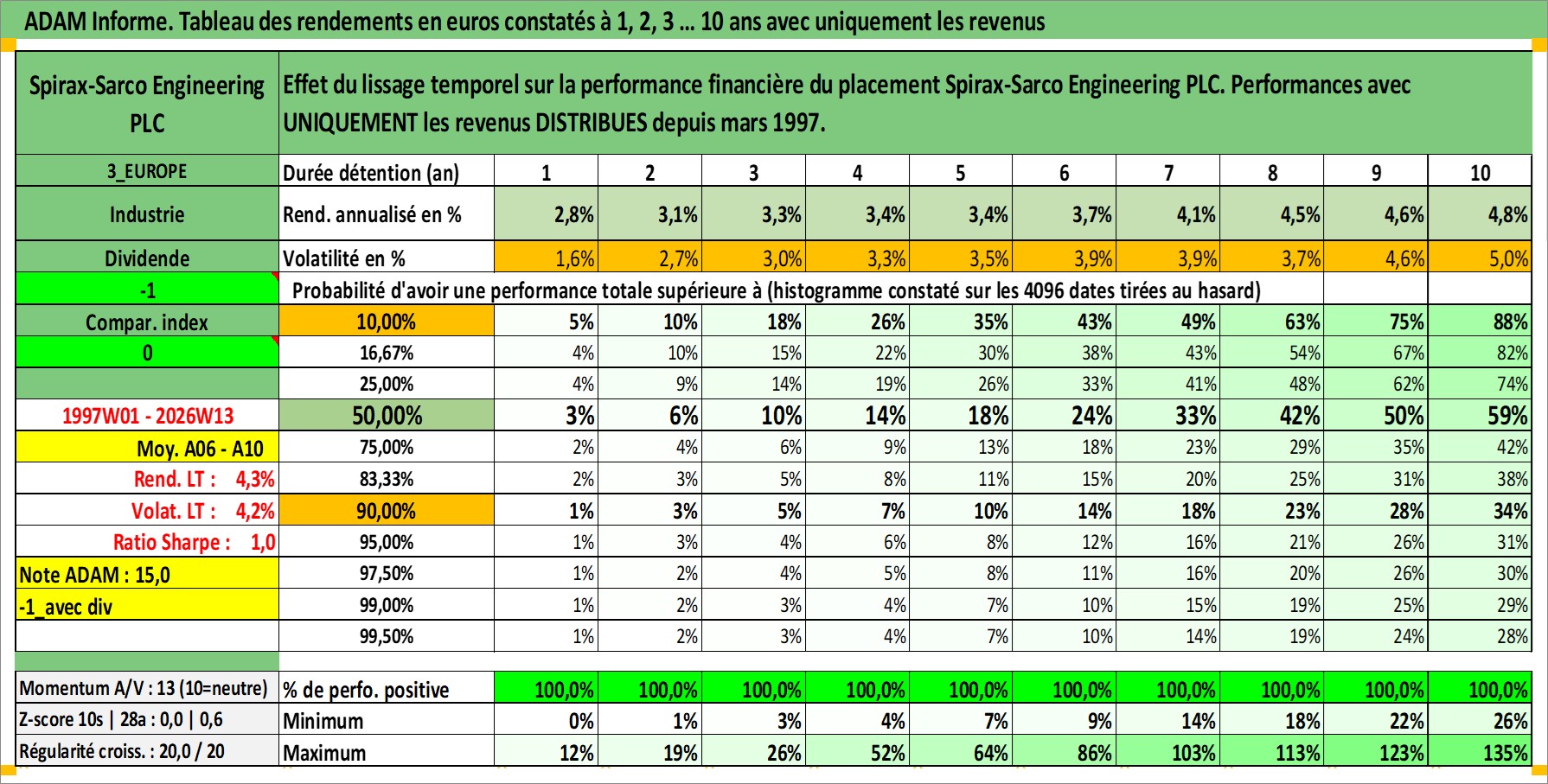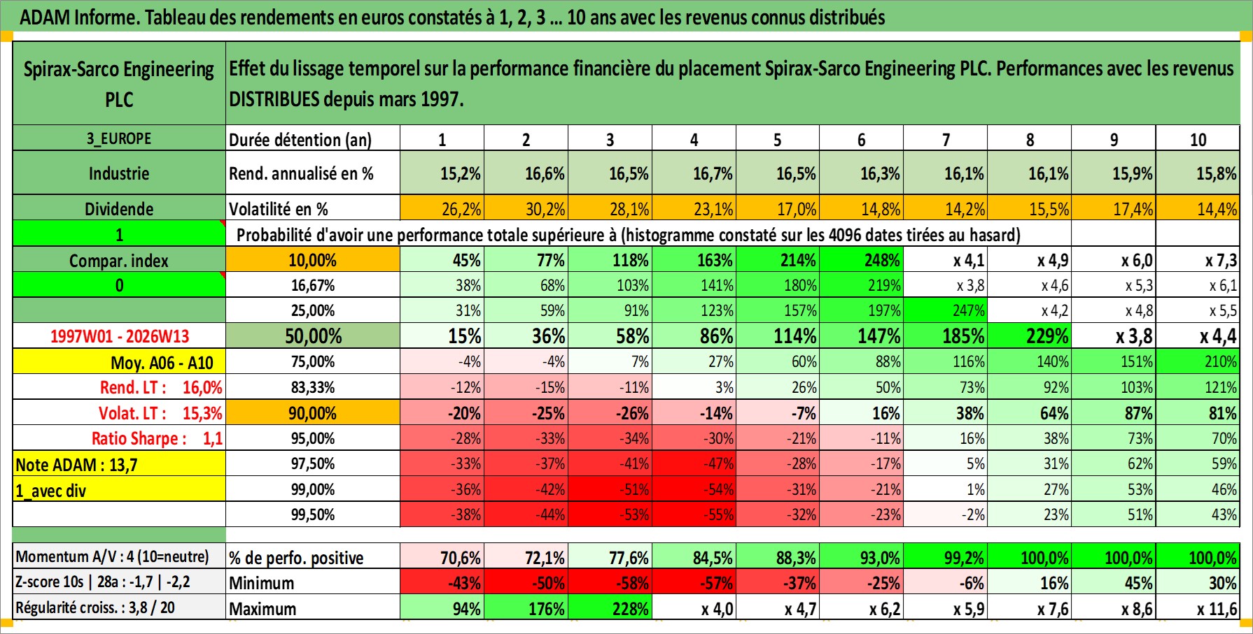 Site dédié aux investisseursPage dédiée sur site financeAnalyse des valorisations hebdomadaires de l'action Spirax-Sarco Engineering PLC. Cet actif est cote en GBX. Les valorisations sont en contrevaleur EURO et couvrent les semaines 1997W01 a 2026W13. Les revenus de cet actif financier sont pris en compte depuis la semaine 1997W12. La note ESG de cet actif n'est pas connue.