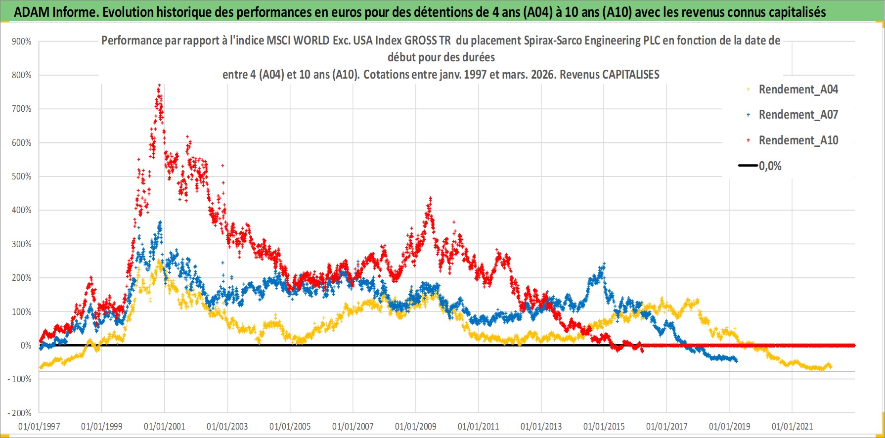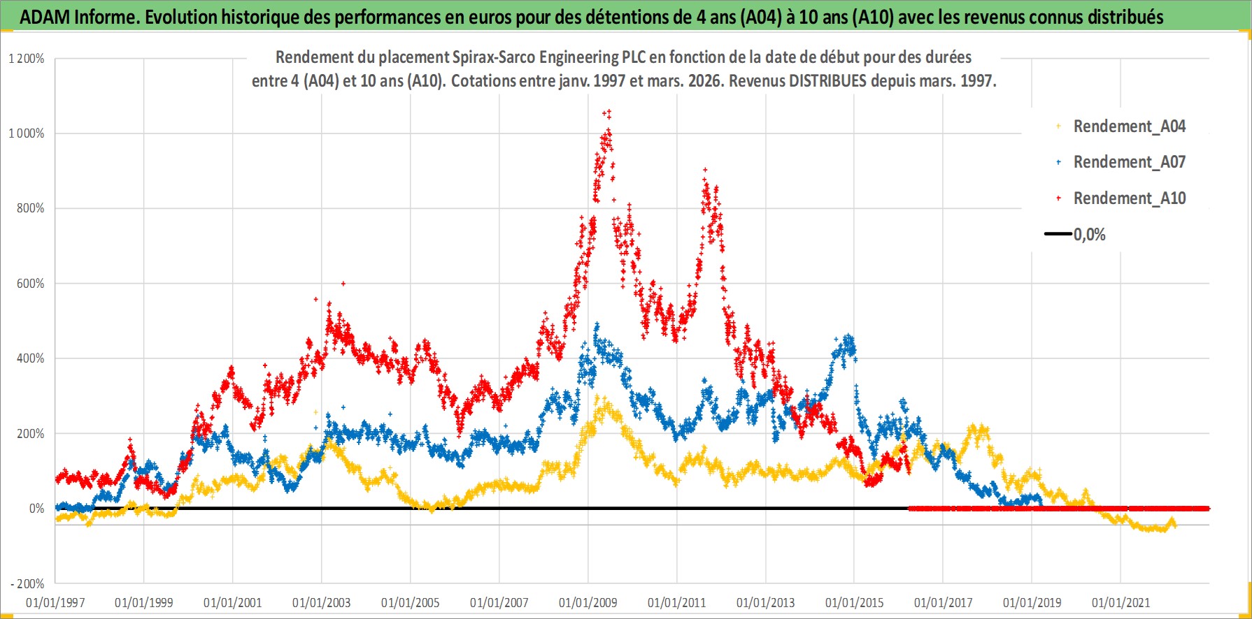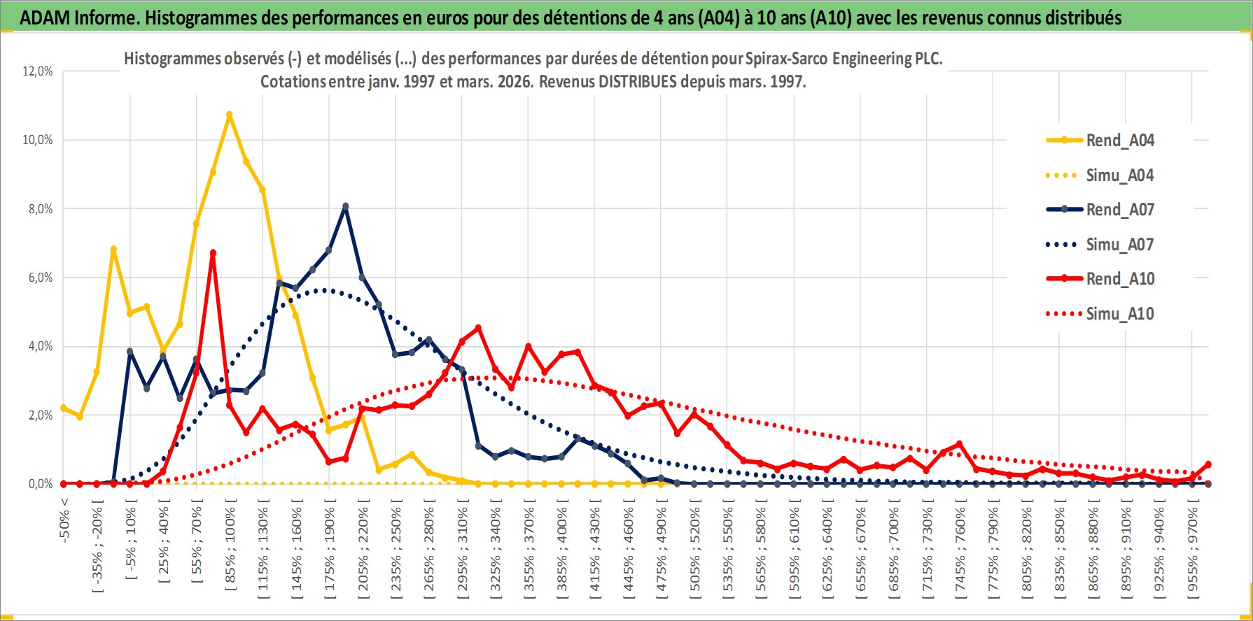 Site dédié aux investisseursPage dédiée sur site financeAnalyse des valorisations hebdomadaires de l'action Spirax-Sarco Engineering PLC. Cet actif est cote en GBX. Les valorisations sont en contrevaleur EURO et couvrent les semaines 1997W01 a 2026W13. Les revenus de cet actif financier sont pris en compte depuis la semaine 1997W12. La note ESG de cet actif n'est pas connue.