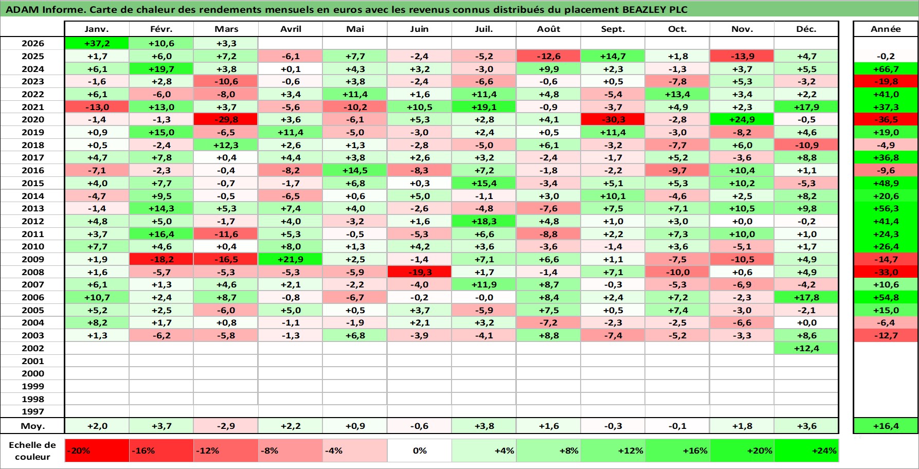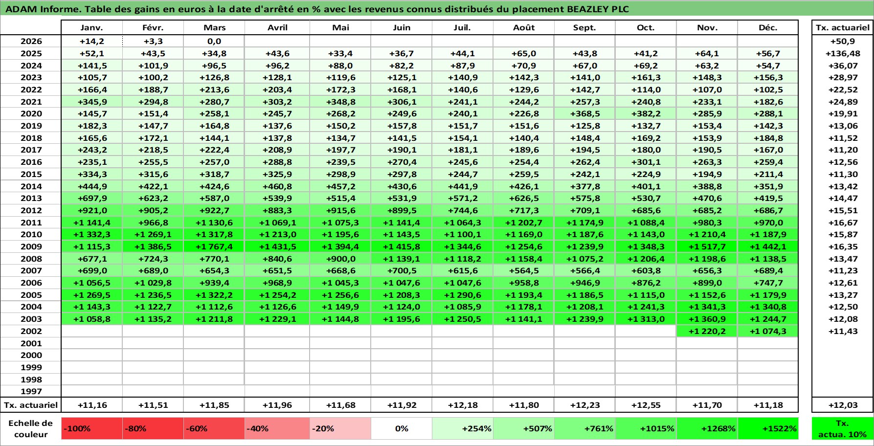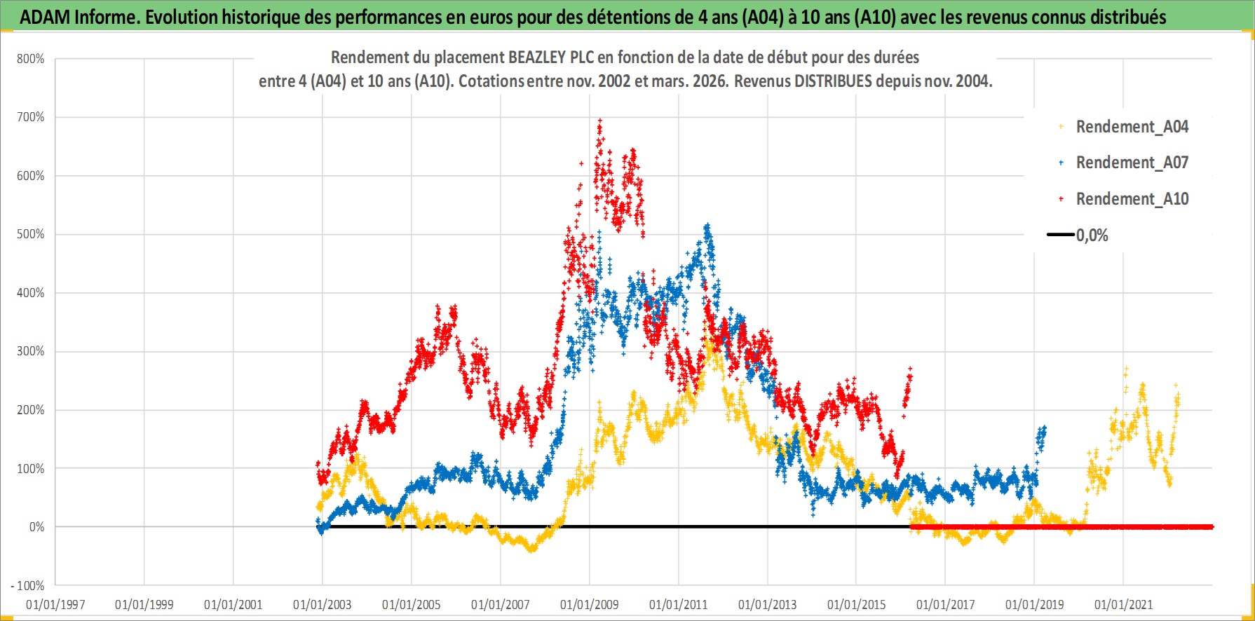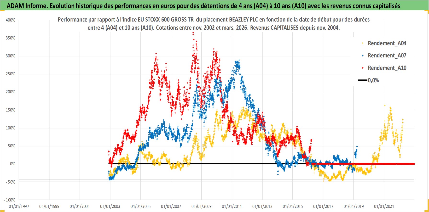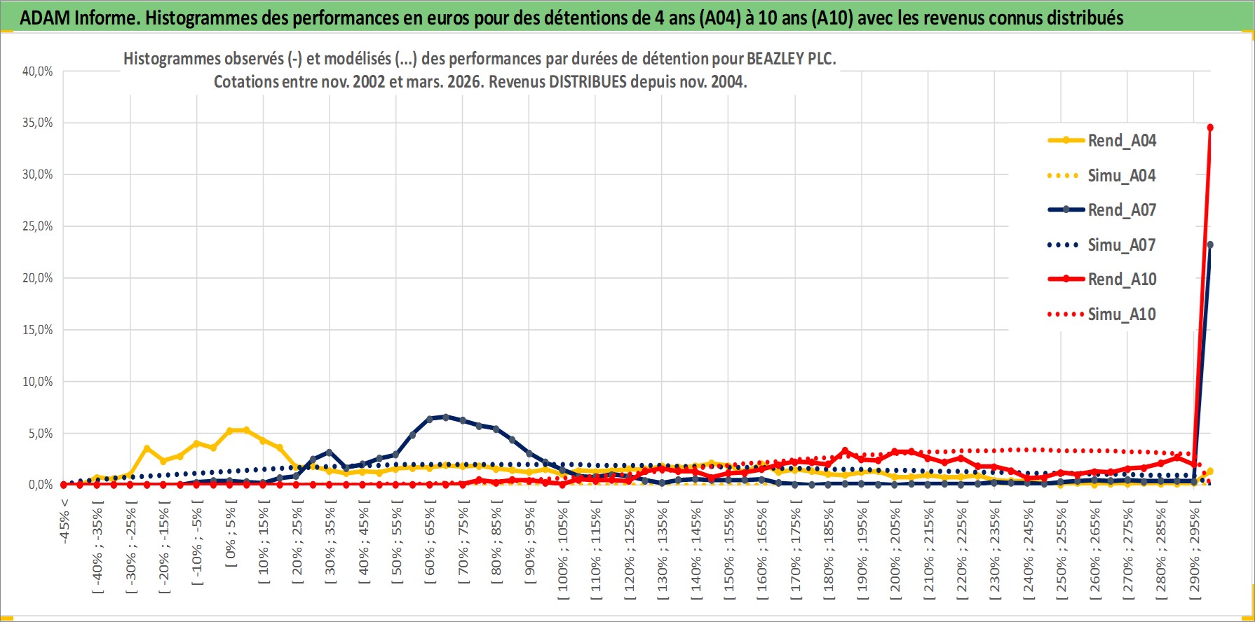 Site dédié aux investisseursPage dédiée sur site financeAnalyse des valorisations hebdomadaires de l'action BEAZLEY PLC. Cet actif est cote en GBX. Les valorisations sont en contrevaleur EURO et couvrent les semaines 2002W46 a 2026W13. Les revenus de cet actif financier sont pris en compte depuis la semaine 2004W45. La note ESG de cet actif n'est pas connue.
