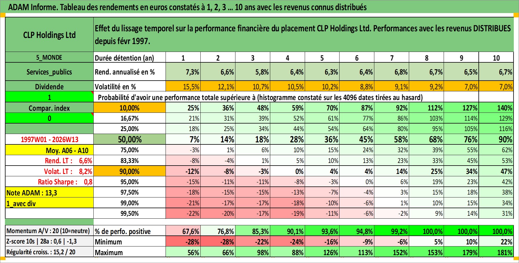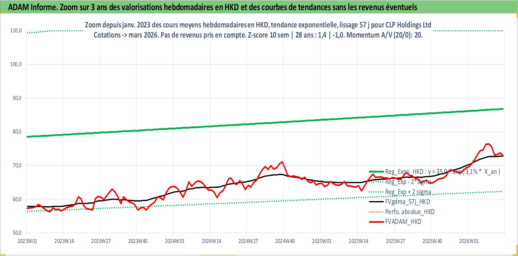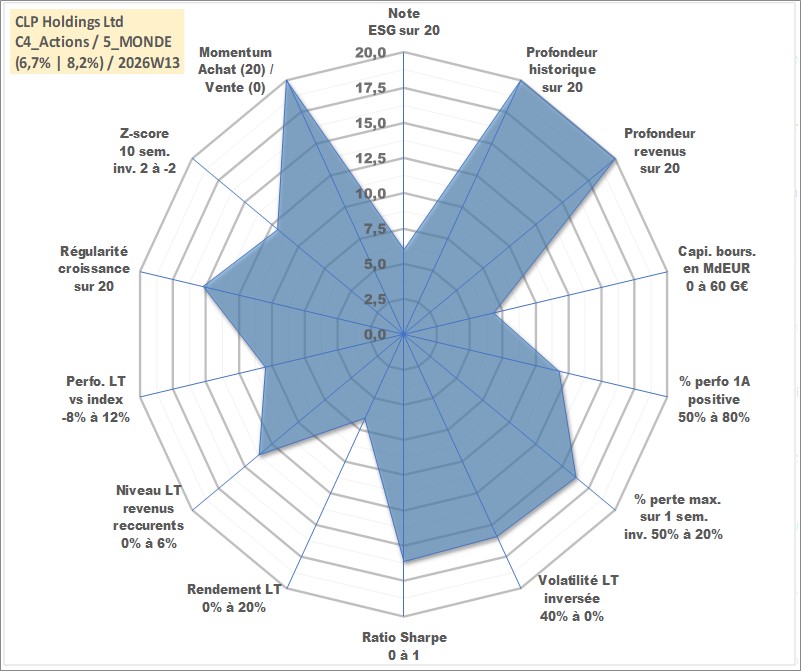 Site dédié aux investisseursPage dédiée sur site financeAnalyse des valorisations hebdomadaires de l'action CLP Holdings Ltd. Cet actif est cote en HKD. Les valorisations sont en contrevaleur EURO et couvrent les semaines 1997W01 a 2026W13. Les revenus de cet actif financier sont pris en compte depuis la semaine 1997W07. La note globale ESG de cet actif est estimee a 6.0 (apres rebasage entre 0 et 20).
