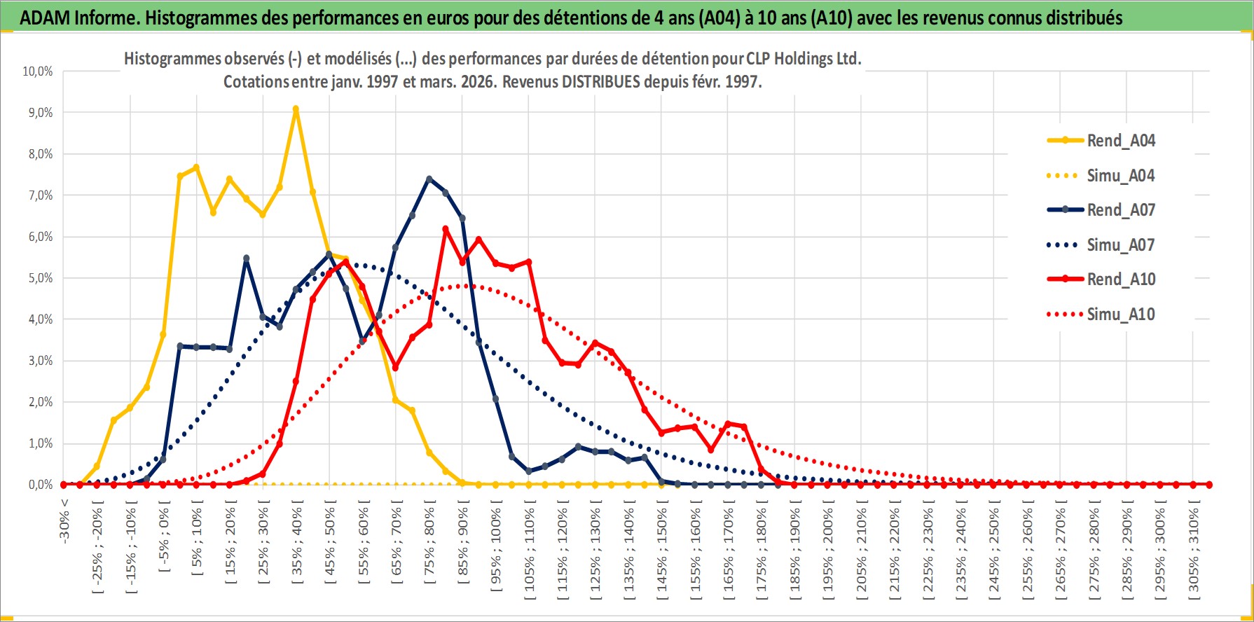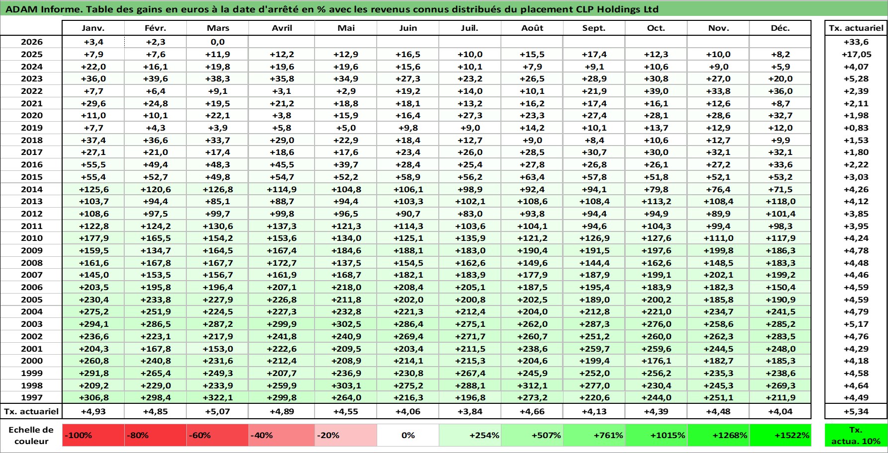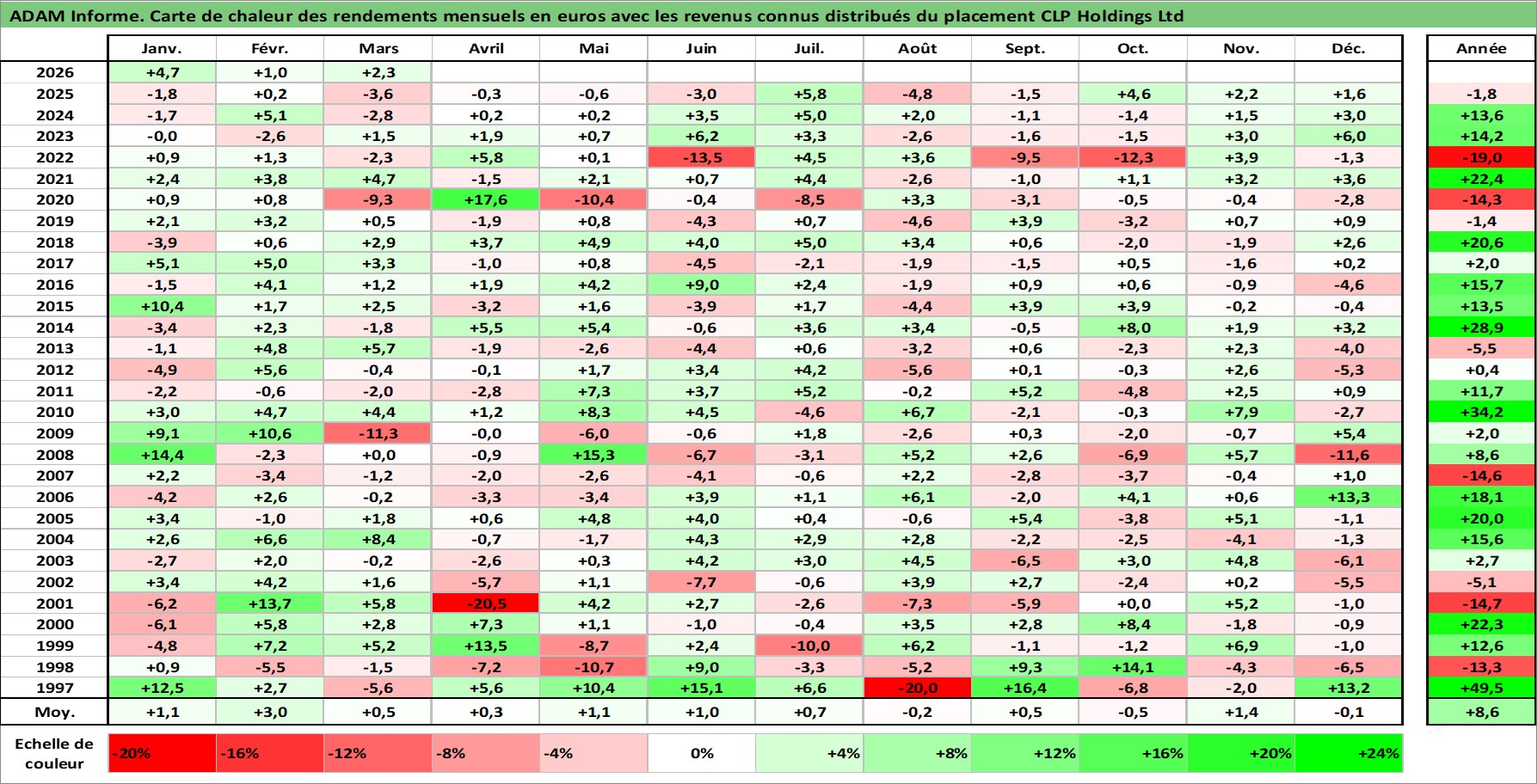 Site dédié aux investisseursPage dédiée sur site financeAnalyse des valorisations hebdomadaires de l'action CLP Holdings Ltd. Cet actif est cote en HKD. Les valorisations sont en contrevaleur EURO et couvrent les semaines 1997W01 a 2026W13. Les revenus de cet actif financier sont pris en compte depuis la semaine 1997W07. La note globale ESG de cet actif est estimee a 6.0 (apres rebasage entre 0 et 20).