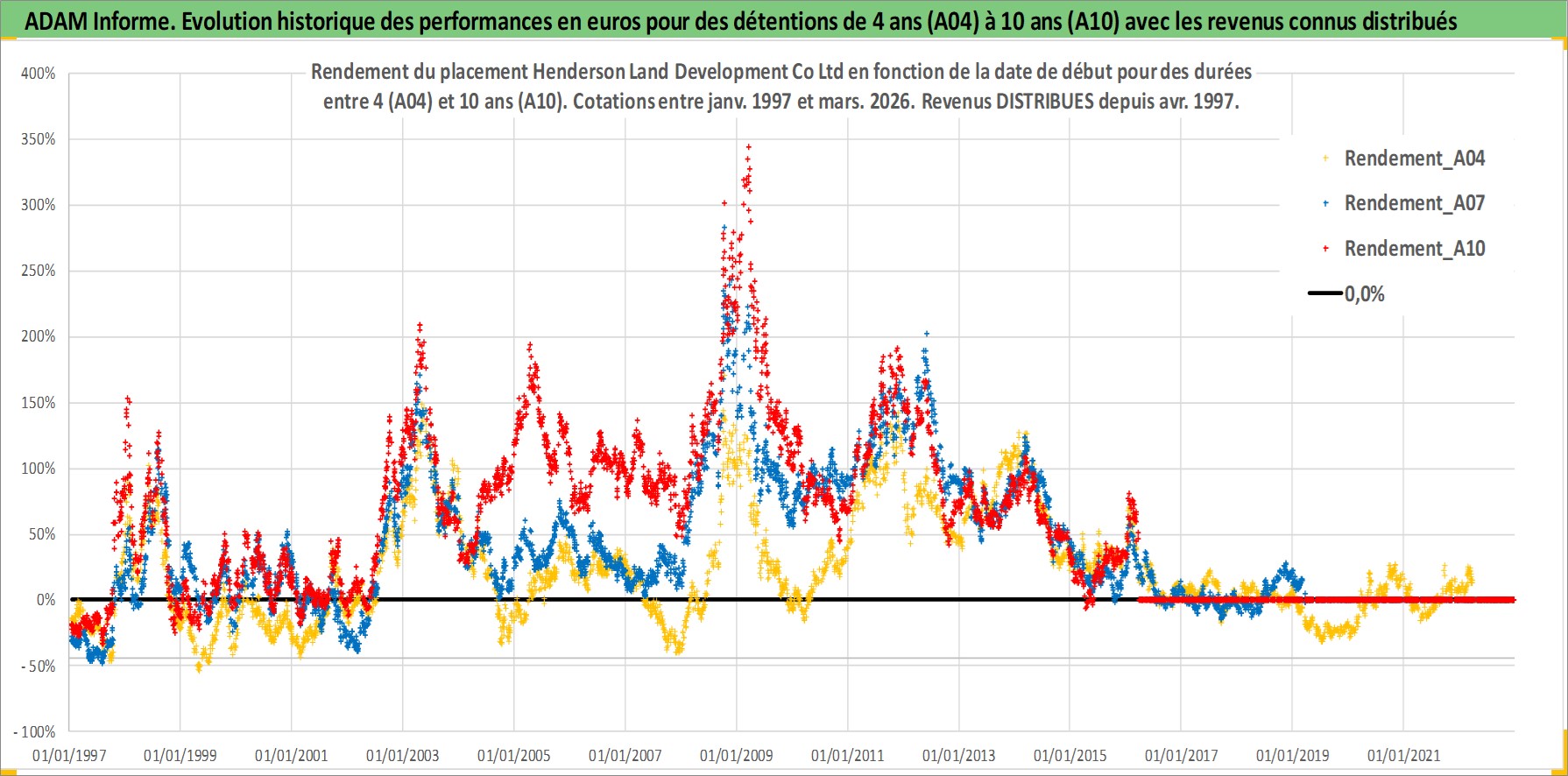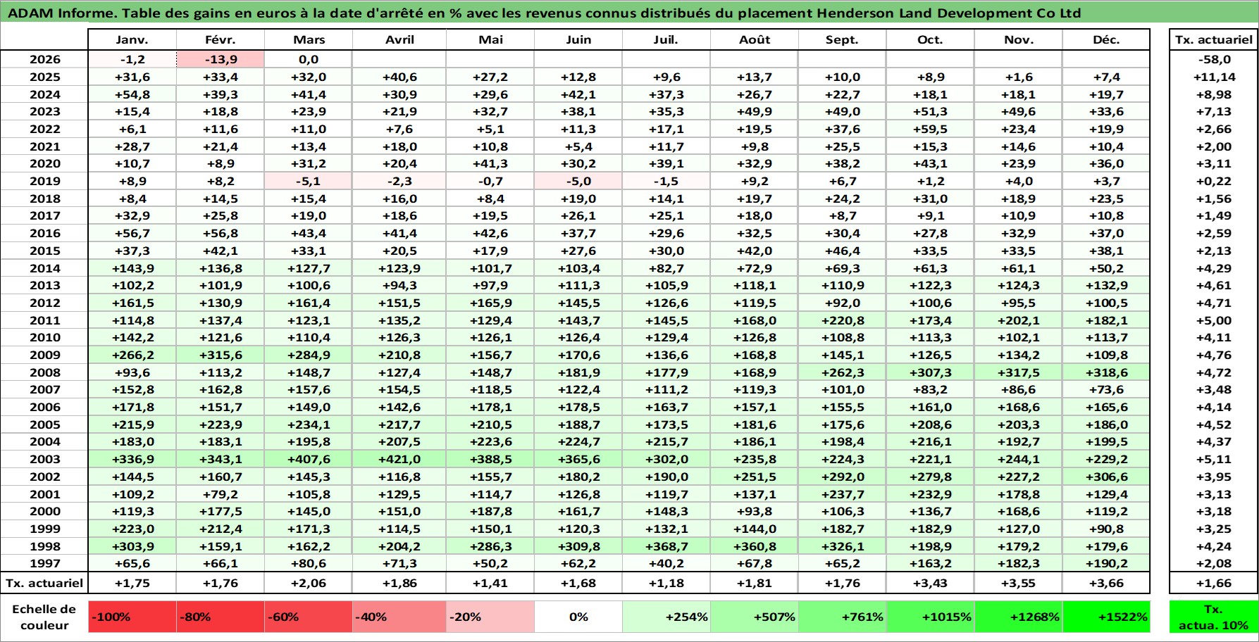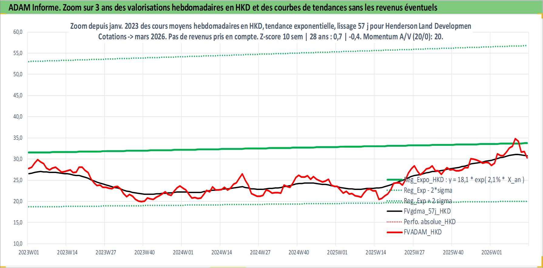 Site dédié aux investisseursPage dédiée sur site financeAnalyse des valorisations hebdomadaires de l'action Henderson Land Development Co Ltd. Cet actif est cote en HKD. Les valorisations sont en contrevaleur EURO et couvrent les semaines 1997W01 a 2026W13. Les revenus de cet actif financier sont pris en compte depuis la semaine 1997W16. La note globale ESG de cet actif est estimee a 11.0 (apres rebasage entre 0 et 20).