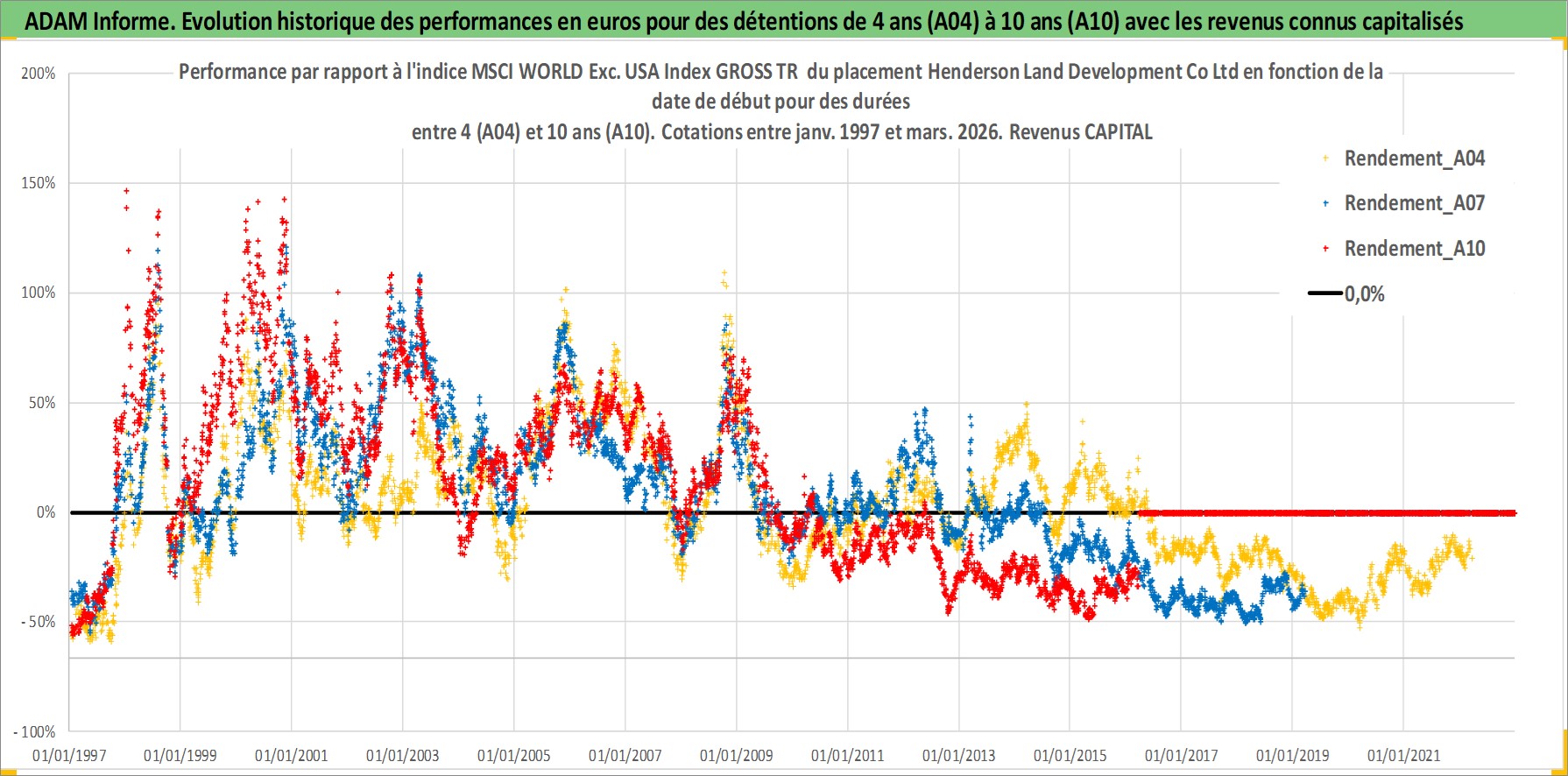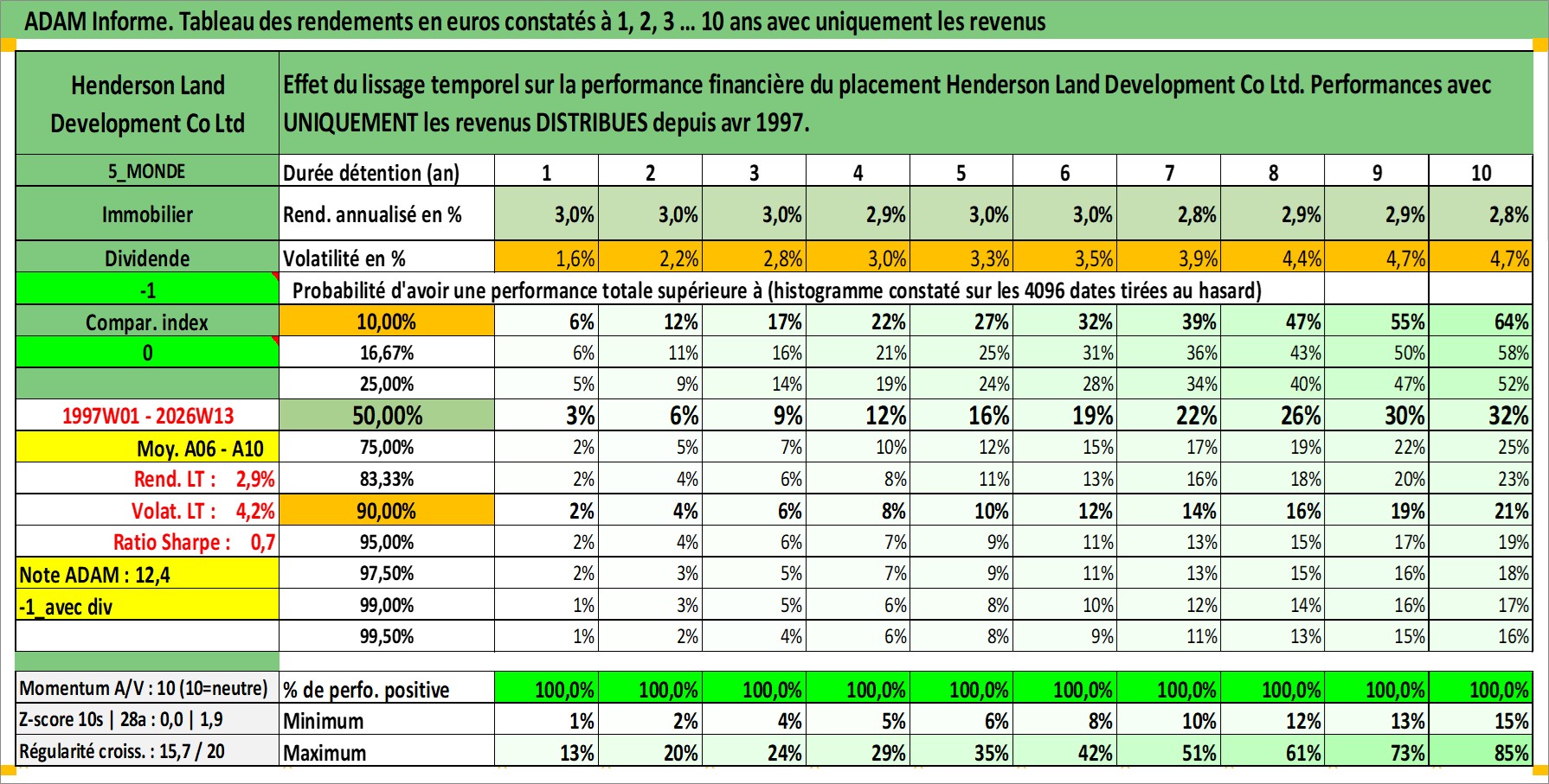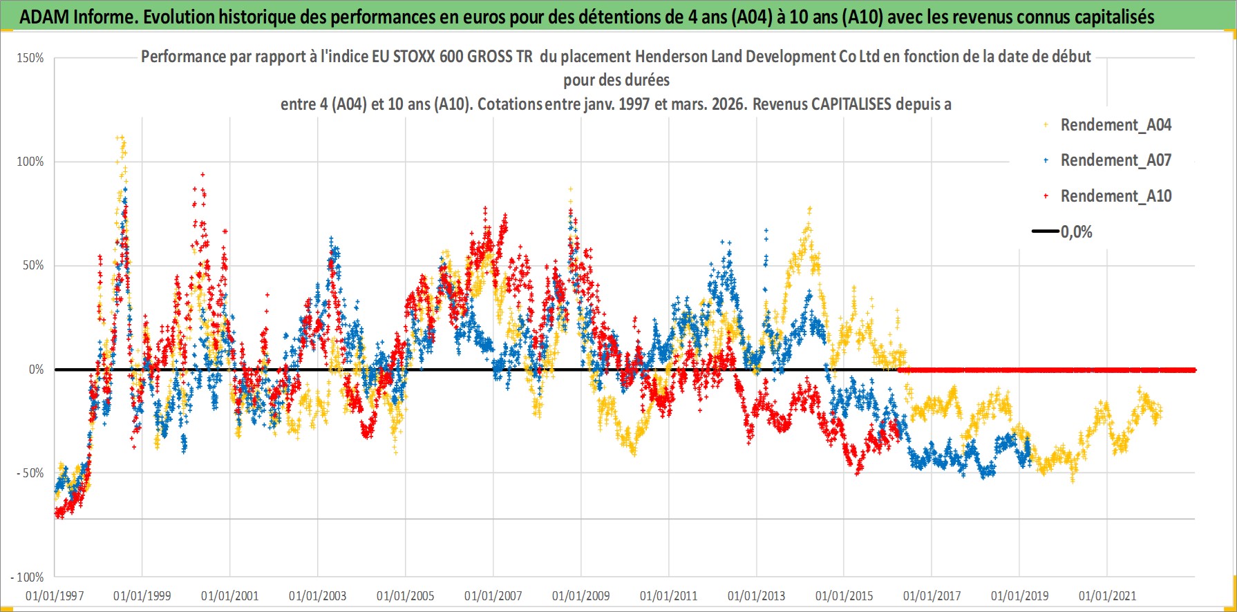 Site dédié aux investisseursPage dédiée sur site financeAnalyse des valorisations hebdomadaires de l'action Henderson Land Development Co Ltd. Cet actif est cote en HKD. Les valorisations sont en contrevaleur EURO et couvrent les semaines 1997W01 a 2026W13. Les revenus de cet actif financier sont pris en compte depuis la semaine 1997W16. La note globale ESG de cet actif est estimee a 11.0 (apres rebasage entre 0 et 20).