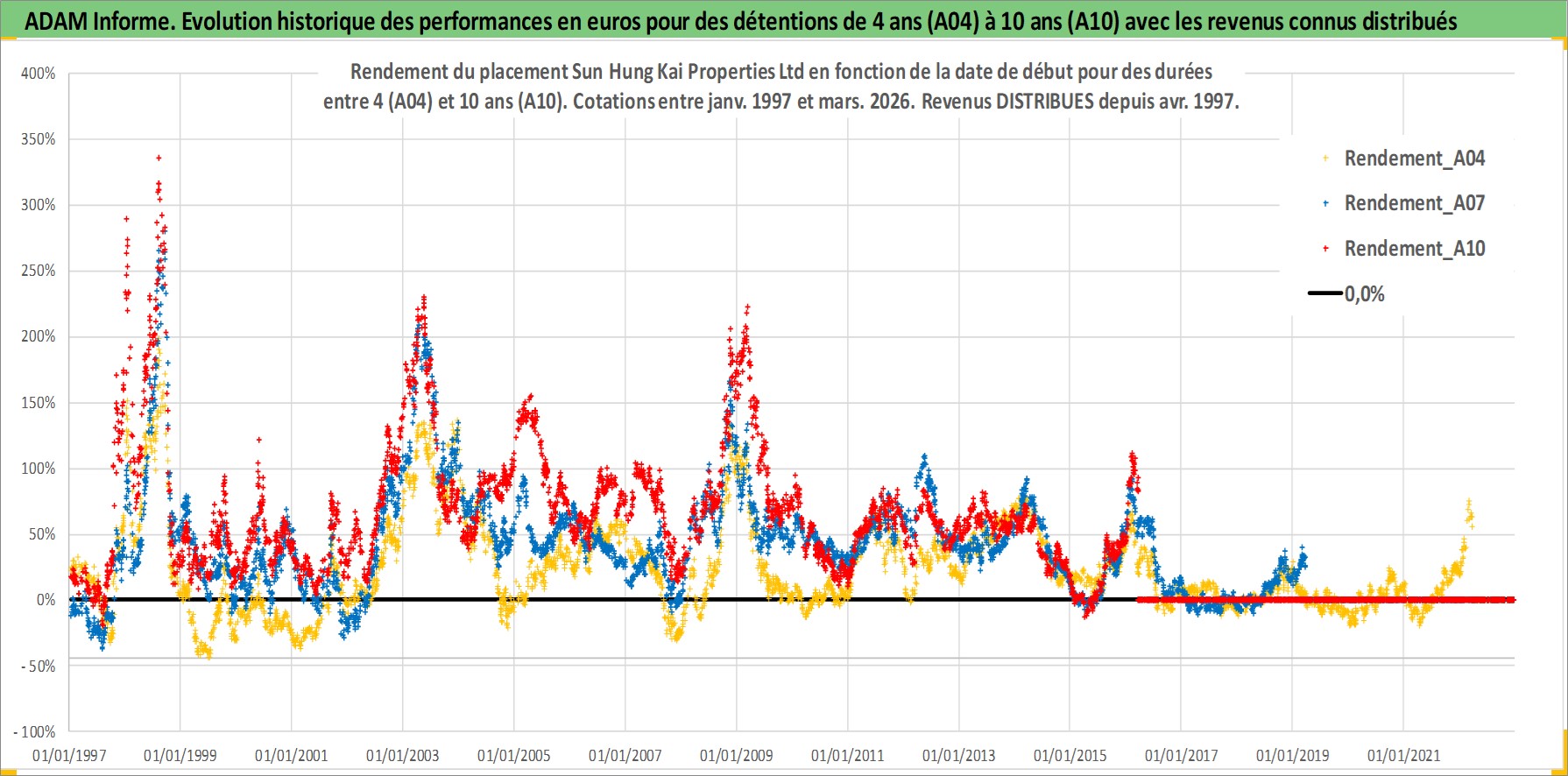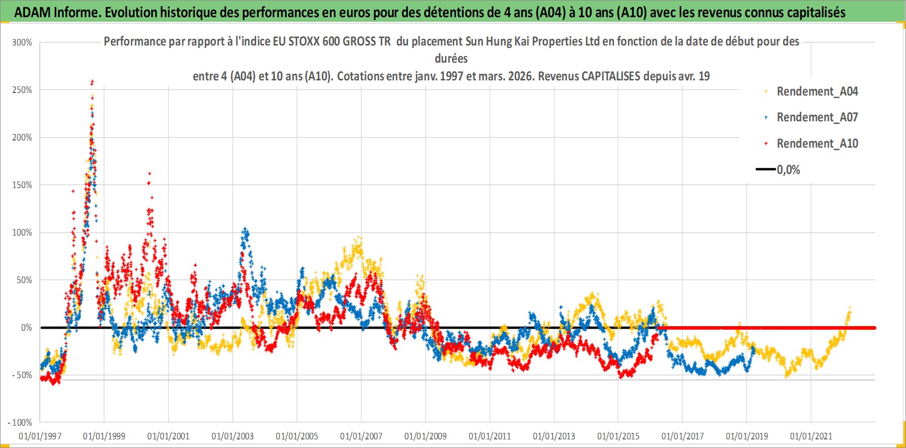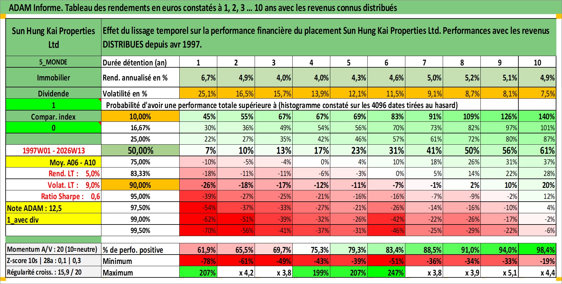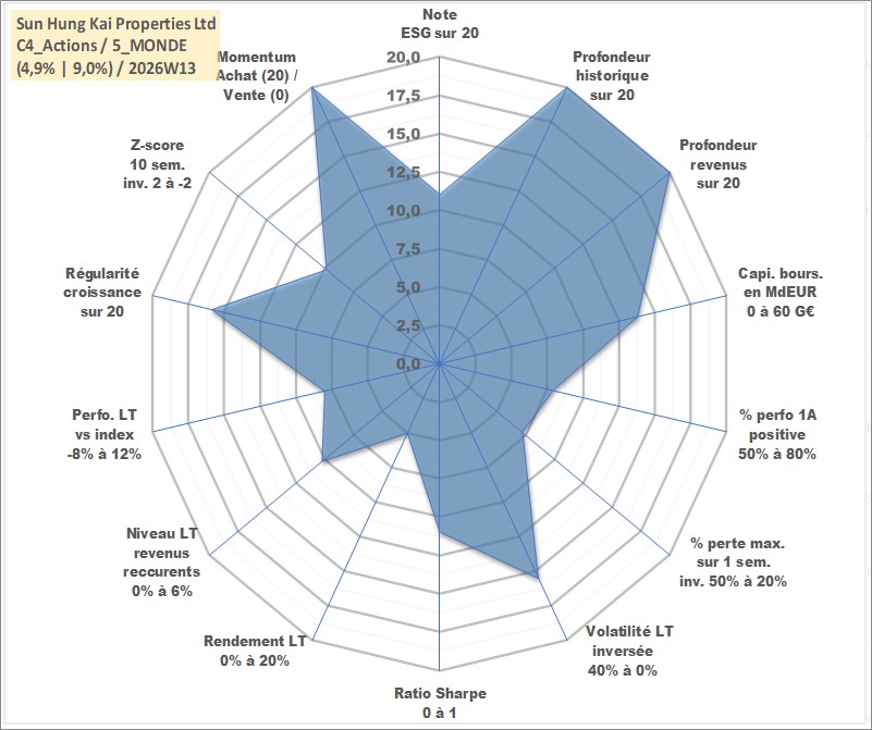 Site dédié aux investisseursPage dédiée sur site financeAnalyse des valorisations hebdomadaires de l'action Sun Hung Kai Properties Ltd. Cet actif est cote en HKD. Les valorisations sont en contrevaleur EURO et couvrent les semaines 1997W01 a 2026W13. Les revenus de cet actif financier sont pris en compte depuis la semaine 1997W15. La note globale ESG de cet actif est estimee a 11.0 (apres rebasage entre 0 et 20).