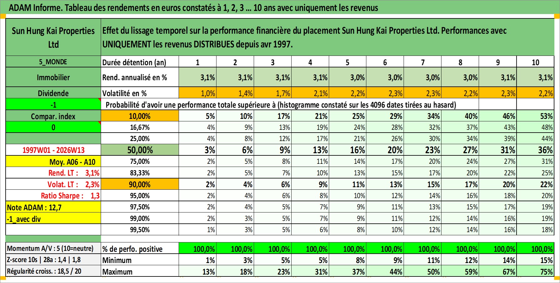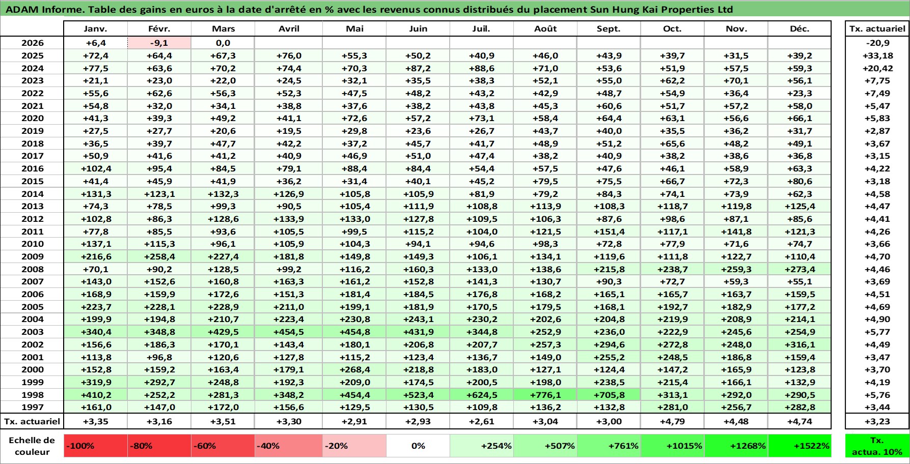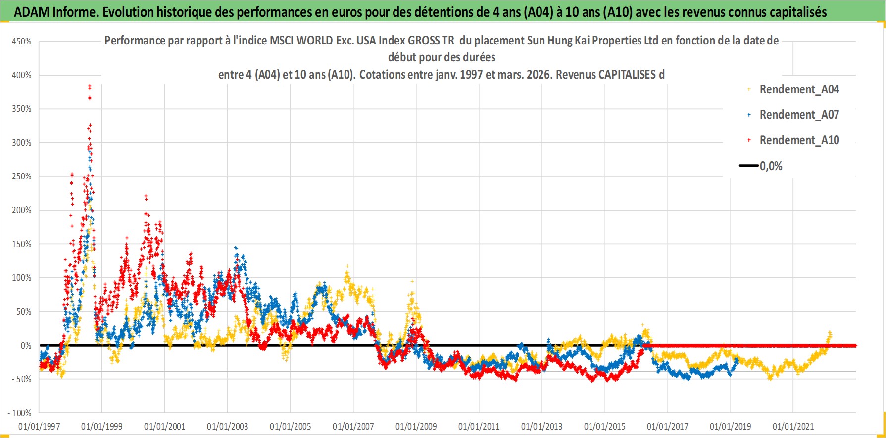 Site dédié aux investisseursPage dédiée sur site financeAnalyse des valorisations hebdomadaires de l'action Sun Hung Kai Properties Ltd. Cet actif est cote en HKD. Les valorisations sont en contrevaleur EURO et couvrent les semaines 1997W01 a 2026W13. Les revenus de cet actif financier sont pris en compte depuis la semaine 1997W15. La note globale ESG de cet actif est estimee a 11.0 (apres rebasage entre 0 et 20).