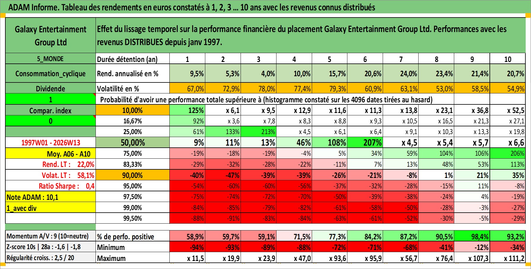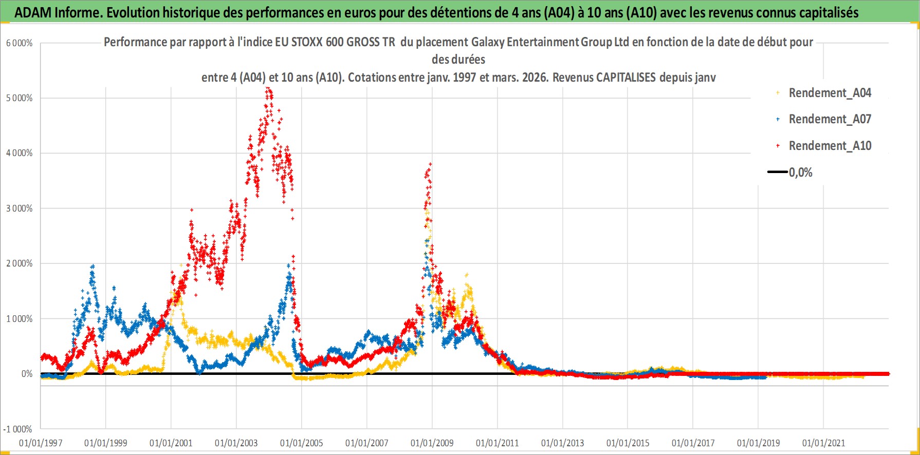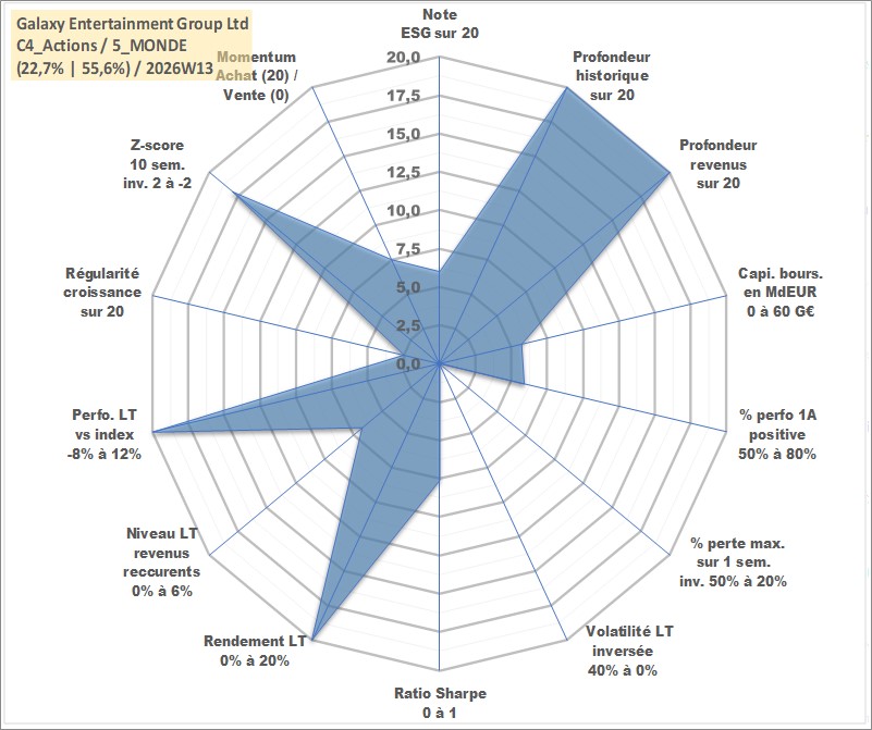 Site dédié aux investisseursPage dédiée sur site financeAnalyse des valorisations hebdomadaires de l'action Galaxy Entertainment Group Ltd. Cet actif est cote en HKD. Les valorisations sont en contrevaleur EURO et couvrent les semaines 1997W01 a 2026W13. Les revenus de cet actif financier sont pris en compte depuis la semaine 1997W01. La note globale ESG de cet actif est estimee a 6.0 (apres rebasage entre 0 et 20).