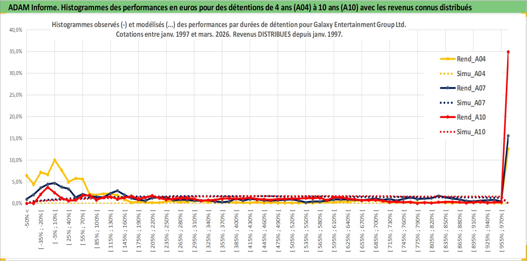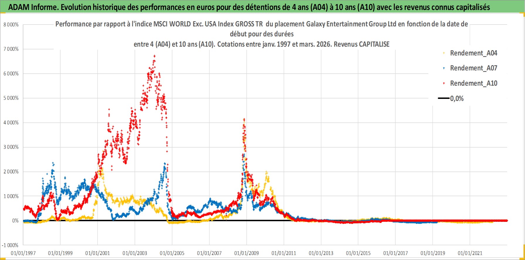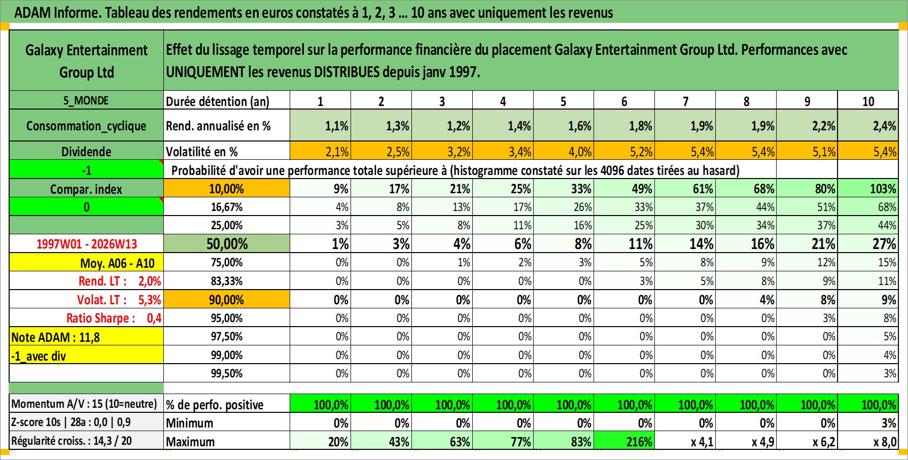 Site dédié aux investisseursPage dédiée sur site financeAnalyse des valorisations hebdomadaires de l'action Galaxy Entertainment Group Ltd. Cet actif est cote en HKD. Les valorisations sont en contrevaleur EURO et couvrent les semaines 1997W01 a 2026W13. Les revenus de cet actif financier sont pris en compte depuis la semaine 1997W01. La note globale ESG de cet actif est estimee a 6.0 (apres rebasage entre 0 et 20).