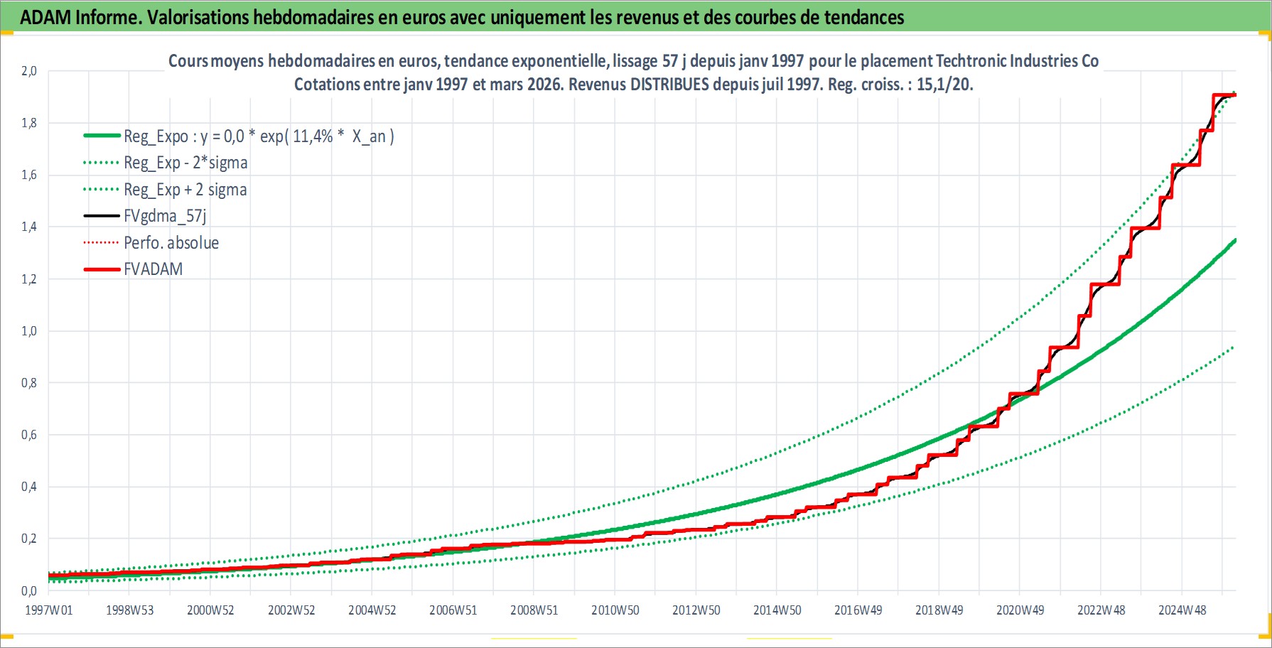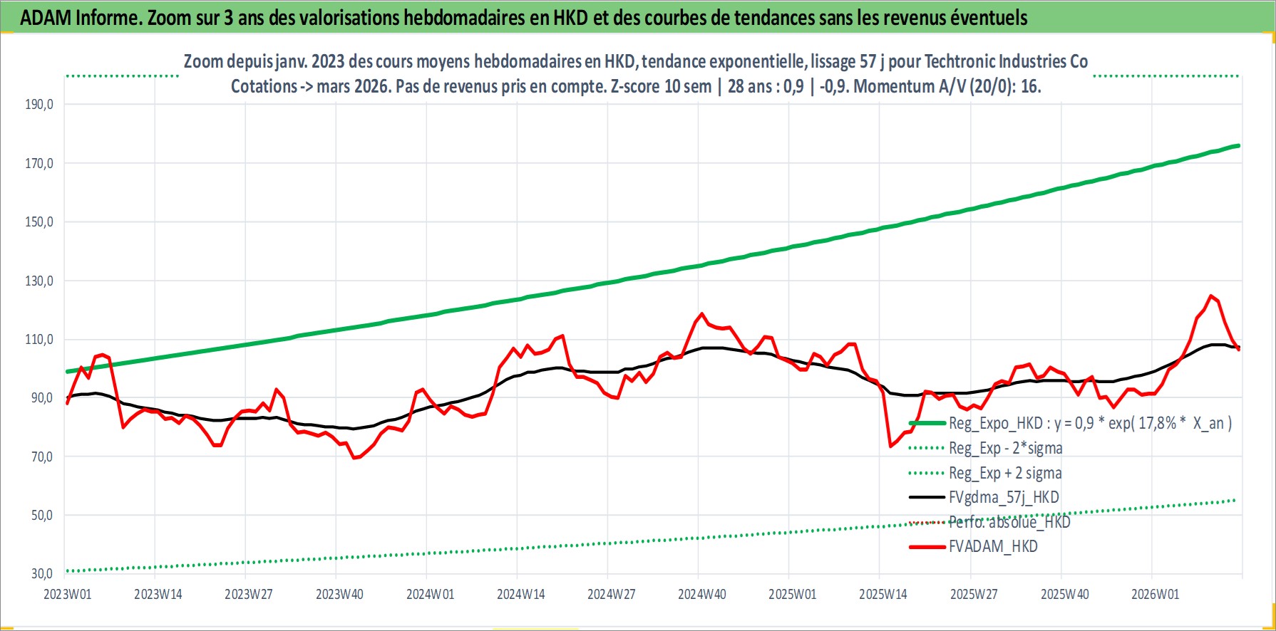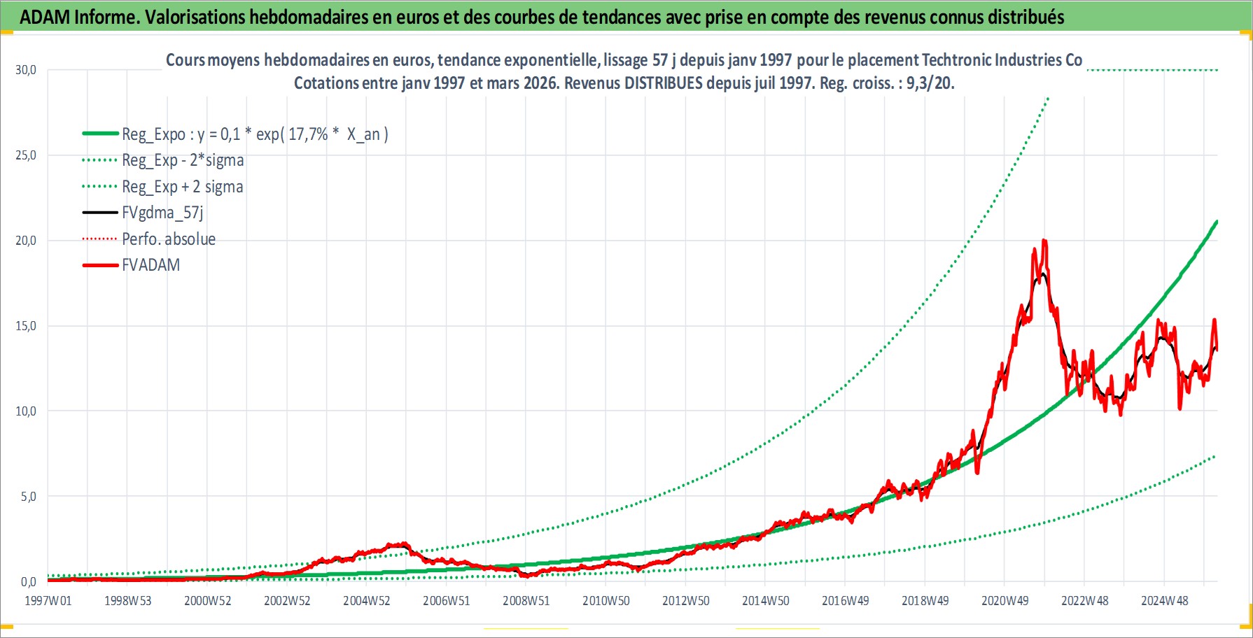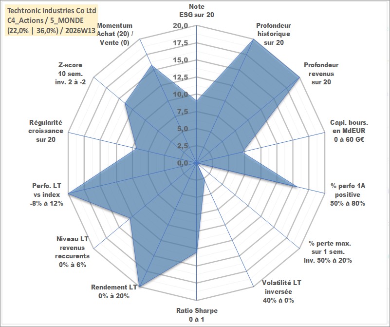 Site dédié aux investisseursPage dédiée sur site financeAnalyse des valorisations hebdomadaires de l'action Techtronic Industries Co Ltd. Cet actif est cote en HKD. Les valorisations sont en contrevaleur EURO et couvrent les semaines 1997W01 a 2026W13. Les revenus de cet actif financier sont pris en compte depuis la semaine 1997W28. La note globale ESG de cet actif est estimee a 9.0 (apres rebasage entre 0 et 20).