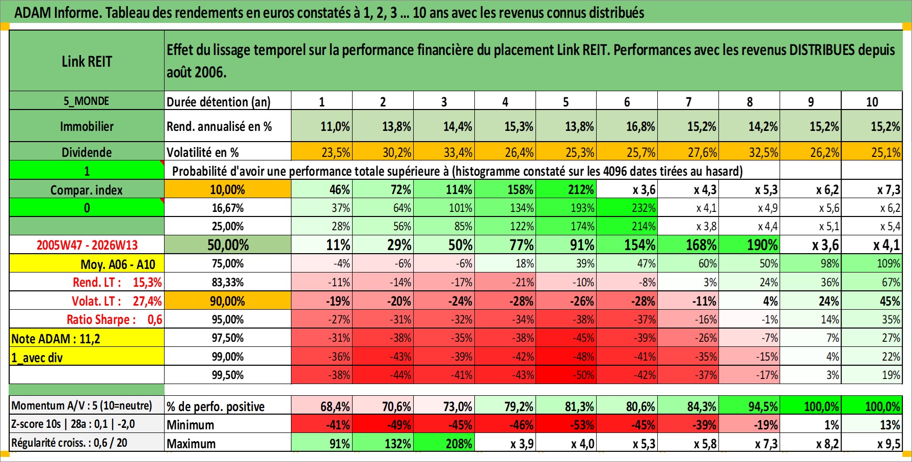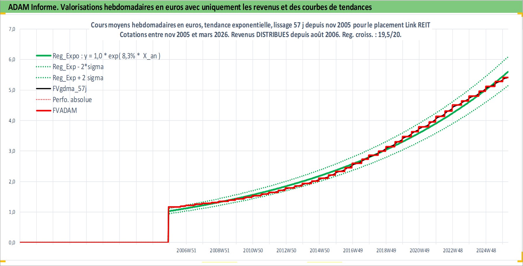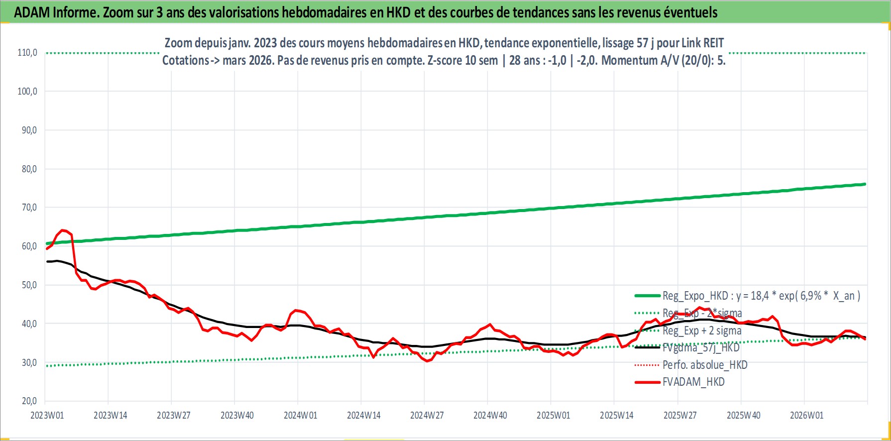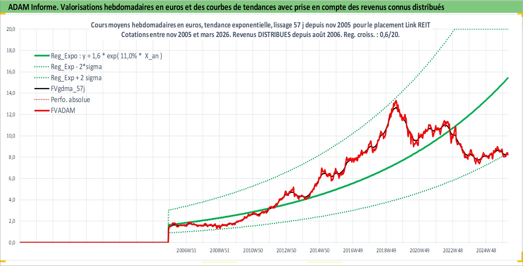 Site dédié aux investisseursPage dédiée sur site financeAnalyse des valorisations hebdomadaires de l'action Link REIT. Cet actif est cote en HKD. Les valorisations sont en contrevaleur EURO et couvrent les semaines 2005W47 a 2026W13. Les revenus de cet actif financier sont pris en compte depuis la semaine 2006W33. La note globale ESG de cet actif est estimee a 16.0 (apres rebasage entre 0 et 20).