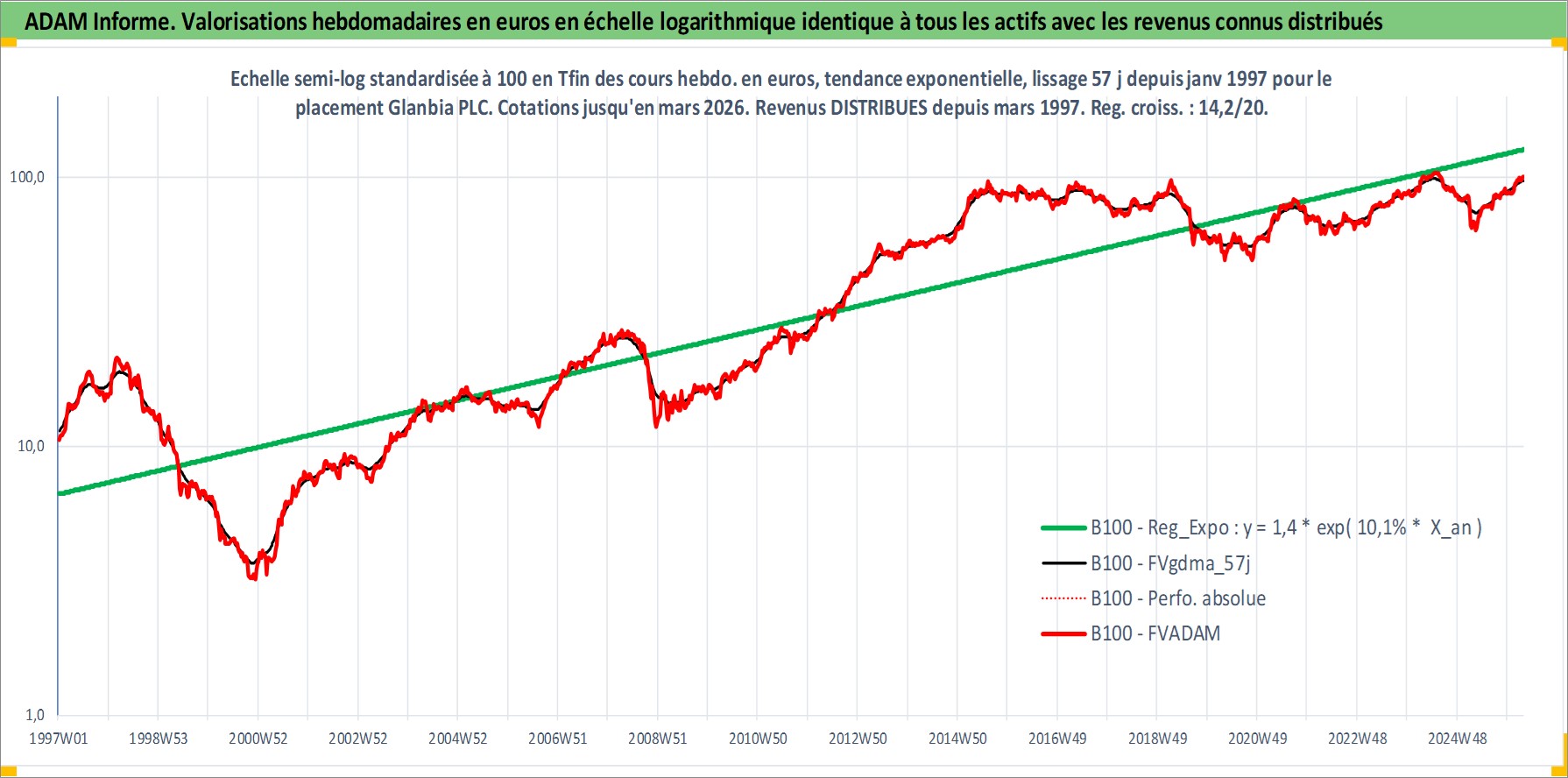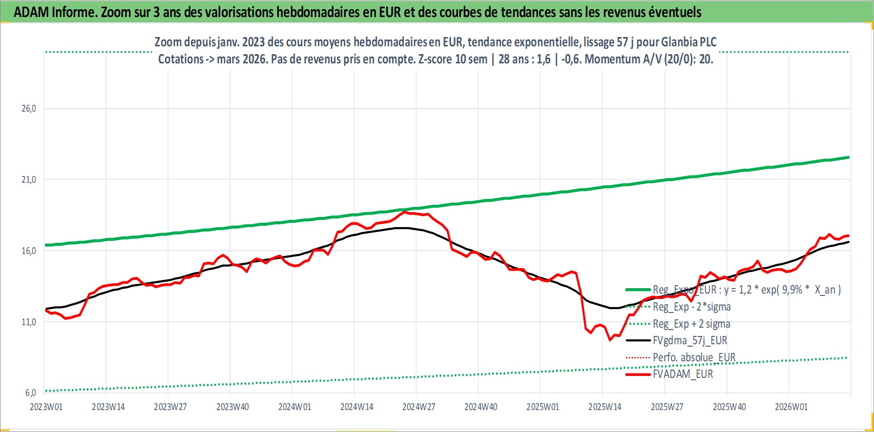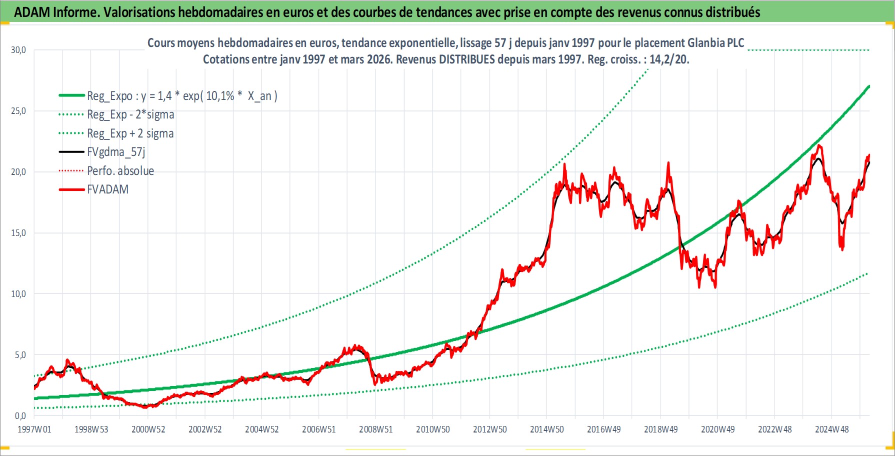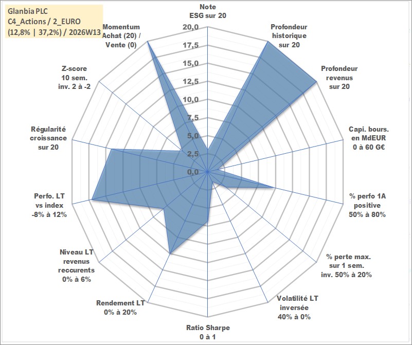 Site dédié aux investisseursPage dédiée sur site financeAnalyse des valorisations hebdomadaires de l'action Glanbia PLC. Cet actif est cote en EUR. Les valorisations couvrent les semaines 1997W01 a 2026W13. Les revenus de cet actif financier sont pris en compte depuis la semaine 1997W11. La note globale ESG de cet actif est estimee a 3.0 (apres rebasage entre 0 et 20).