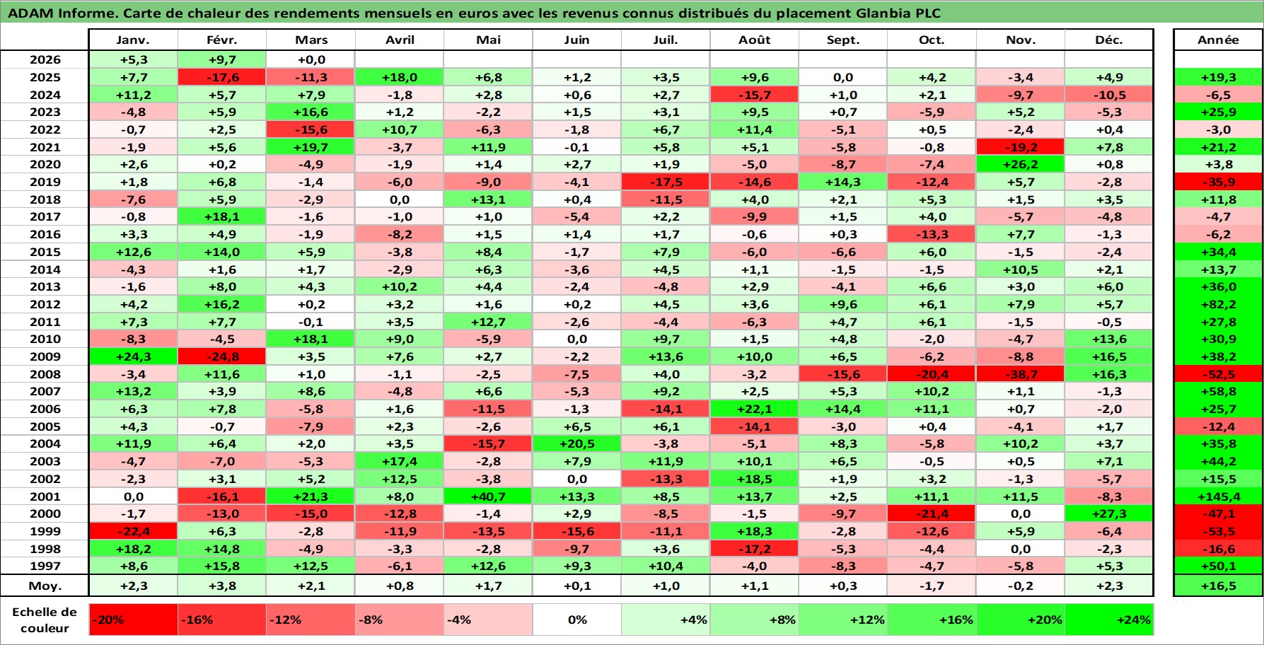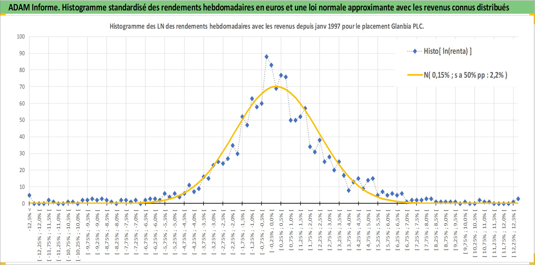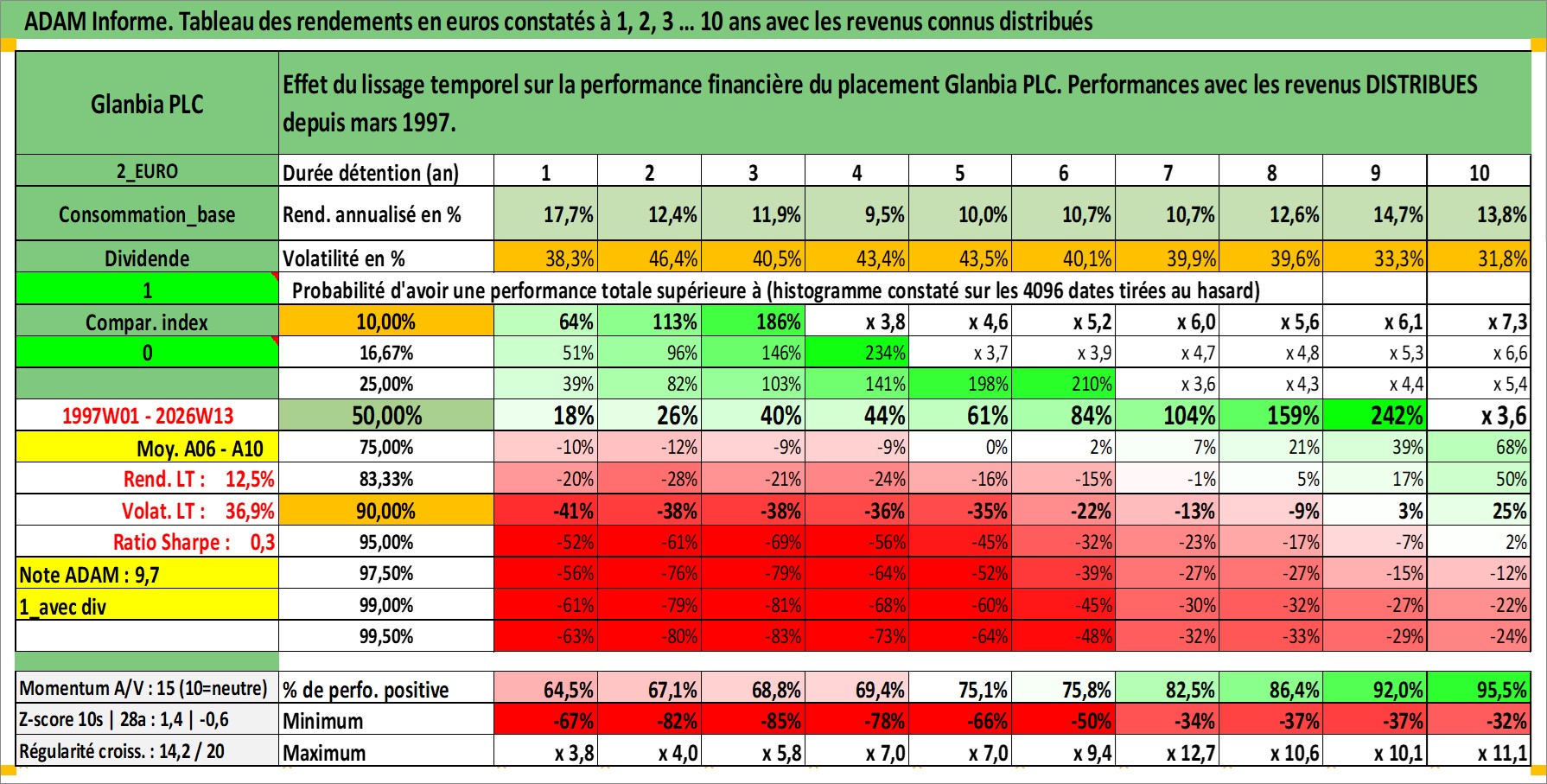 Site dédié aux investisseursPage dédiée sur site financeAnalyse des valorisations hebdomadaires de l'action Glanbia PLC. Cet actif est cote en EUR. Les valorisations couvrent les semaines 1997W01 a 2026W13. Les revenus de cet actif financier sont pris en compte depuis la semaine 1997W11. La note globale ESG de cet actif est estimee a 3.0 (apres rebasage entre 0 et 20).