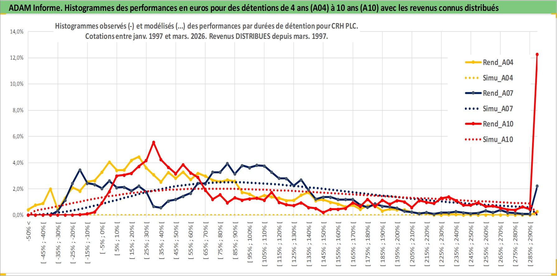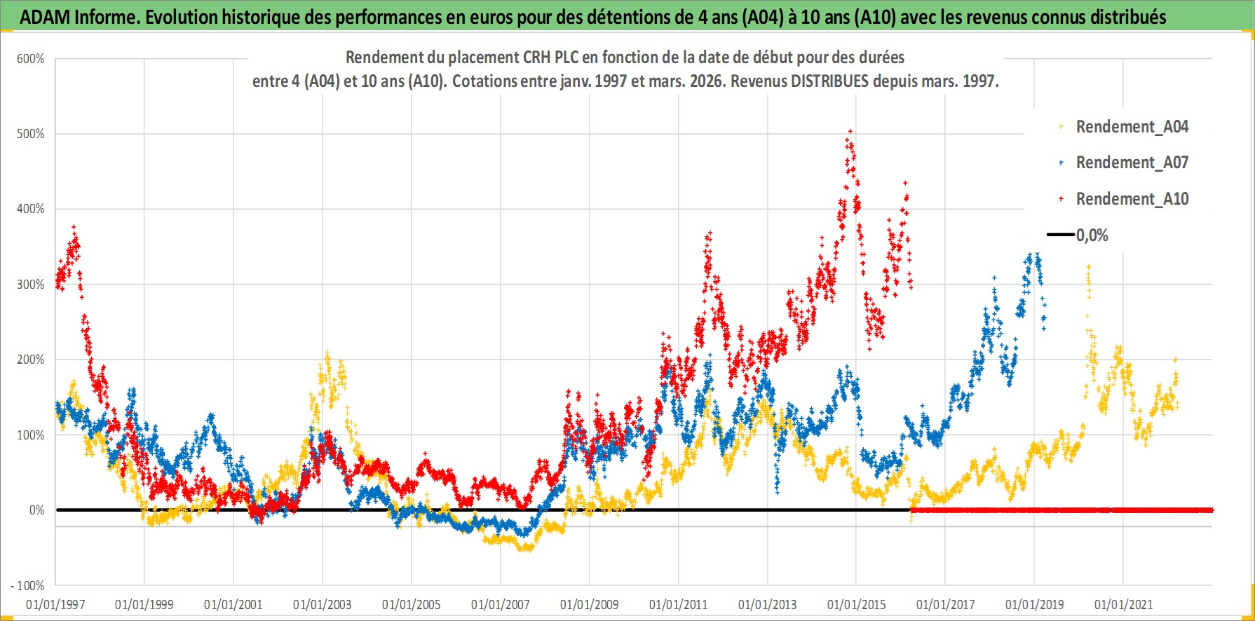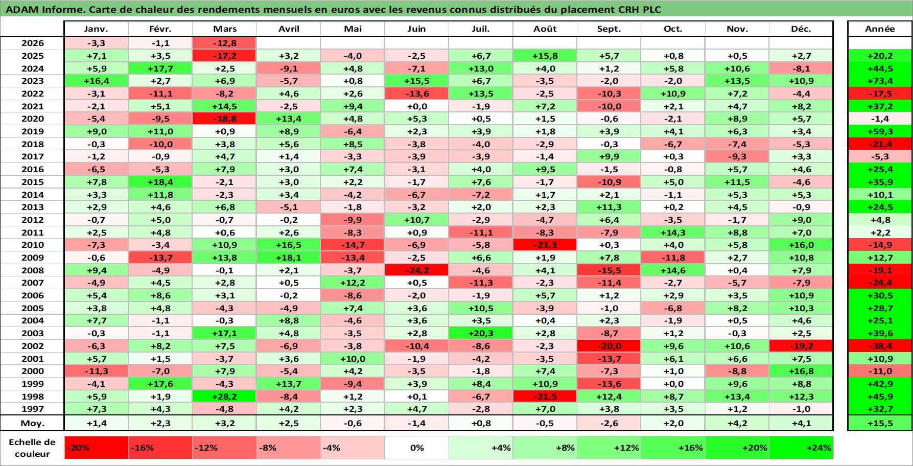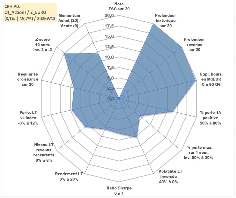 Site dédié aux investisseursPage dédiée sur site financeAnalyse des valorisations hebdomadaires de l'action CRH PLC. Cet actif est cote en USD. Les valorisations sont en contrevaleur EURO et couvrent les semaines 1997W01 a 2026W13. Les revenus de cet actif financier sont pris en compte depuis la semaine 1997W11. La note ESG de cet actif n'est pas connue.