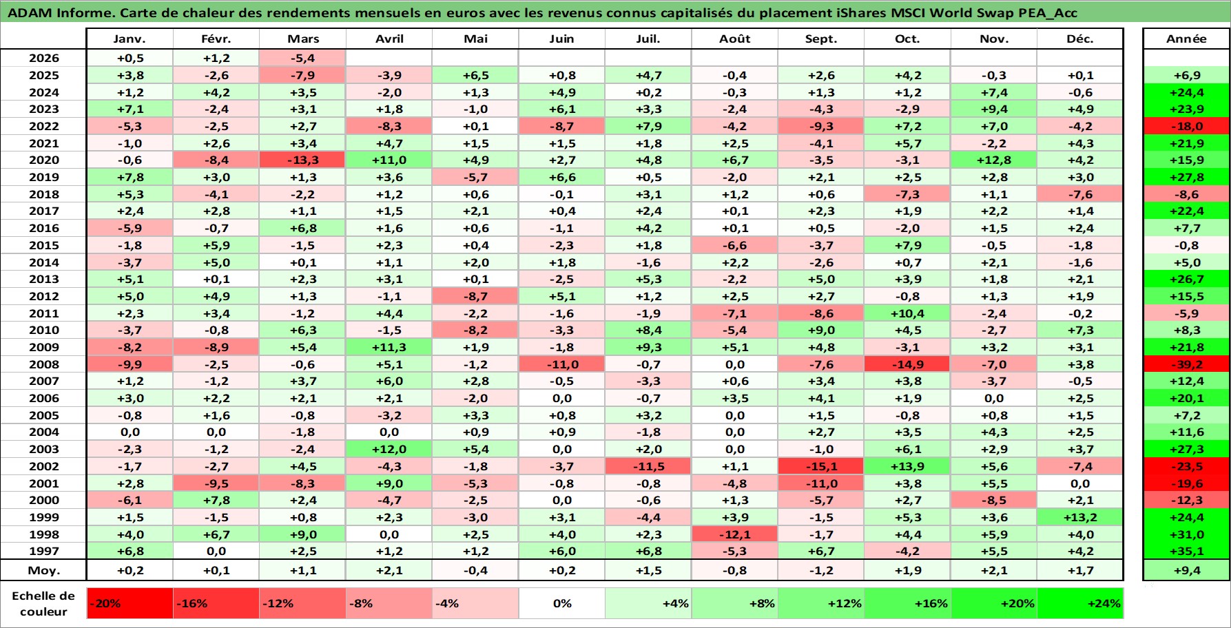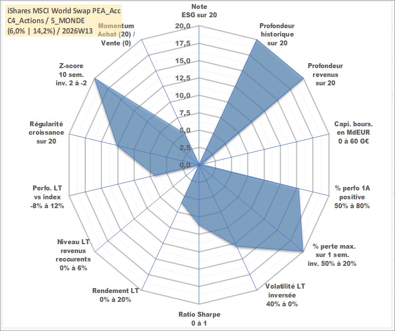 Site dédié aux investisseursPage dédiée sur site financeAnalyse des valorisations hebdomadaires du fonds iShares MSCI World Swap PEA_Acc. Cet actif est cote en EUR. Les valorisations couvrent les semaines 1997W01 a 2026W13. Les revenus de cet actif financier sont pris en compte depuis la semaine 1997W01. La note ESG de cet actif n'est pas connue.