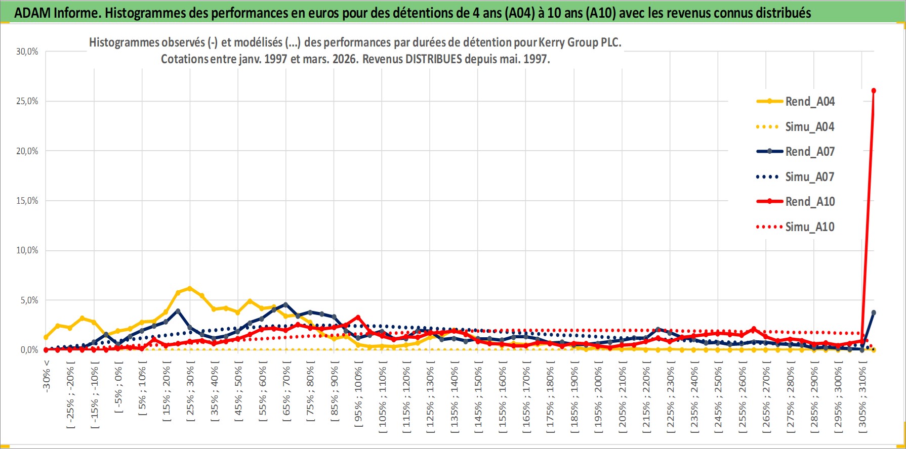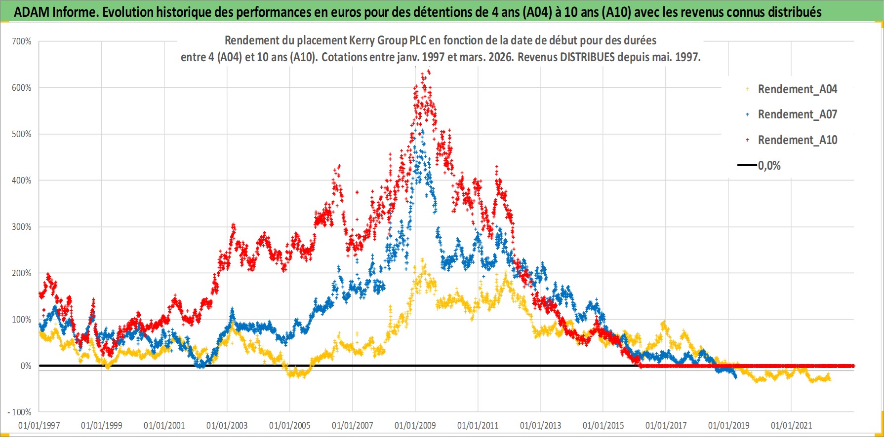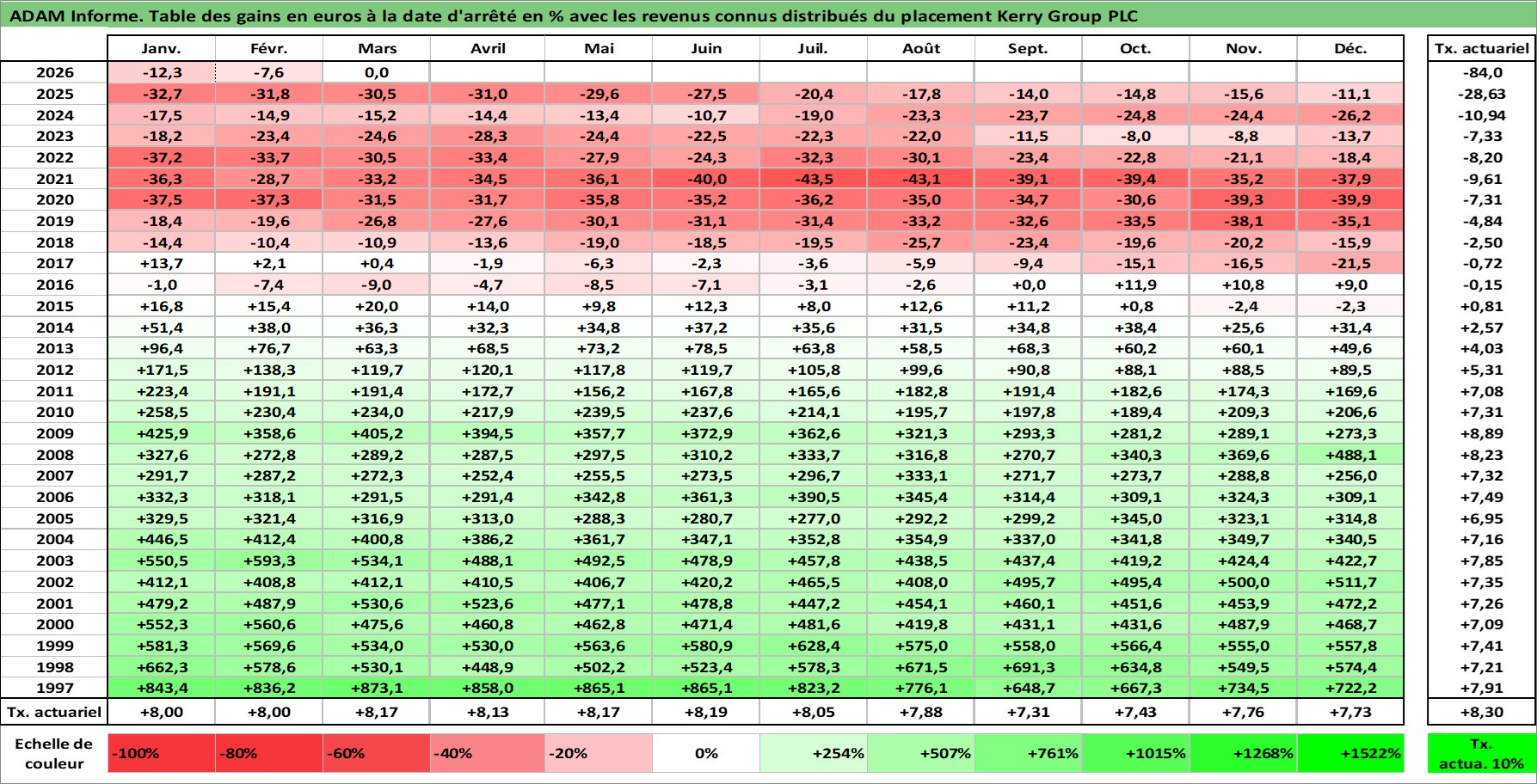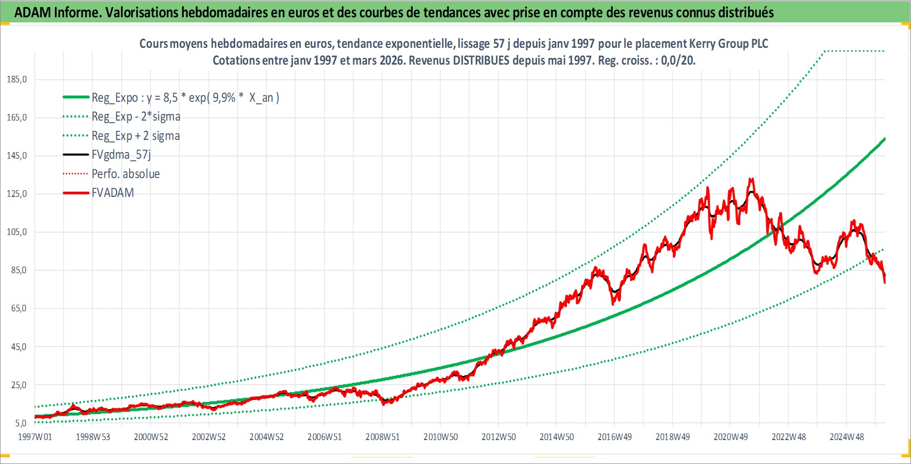 Site dédié aux investisseursPage dédiée sur site financeAnalyse des valorisations hebdomadaires de l'action Kerry Group PLC. Cet actif est cote en EUR. Les valorisations couvrent les semaines 1997W01 a 2026W13. Les revenus de cet actif financier sont pris en compte depuis la semaine 1997W19. La note globale ESG de cet actif est estimee a 8.0 (apres rebasage entre 0 et 20).