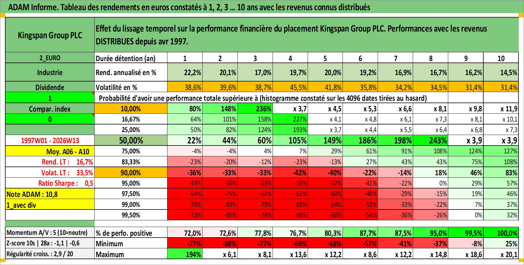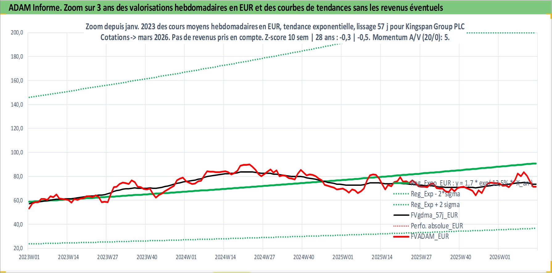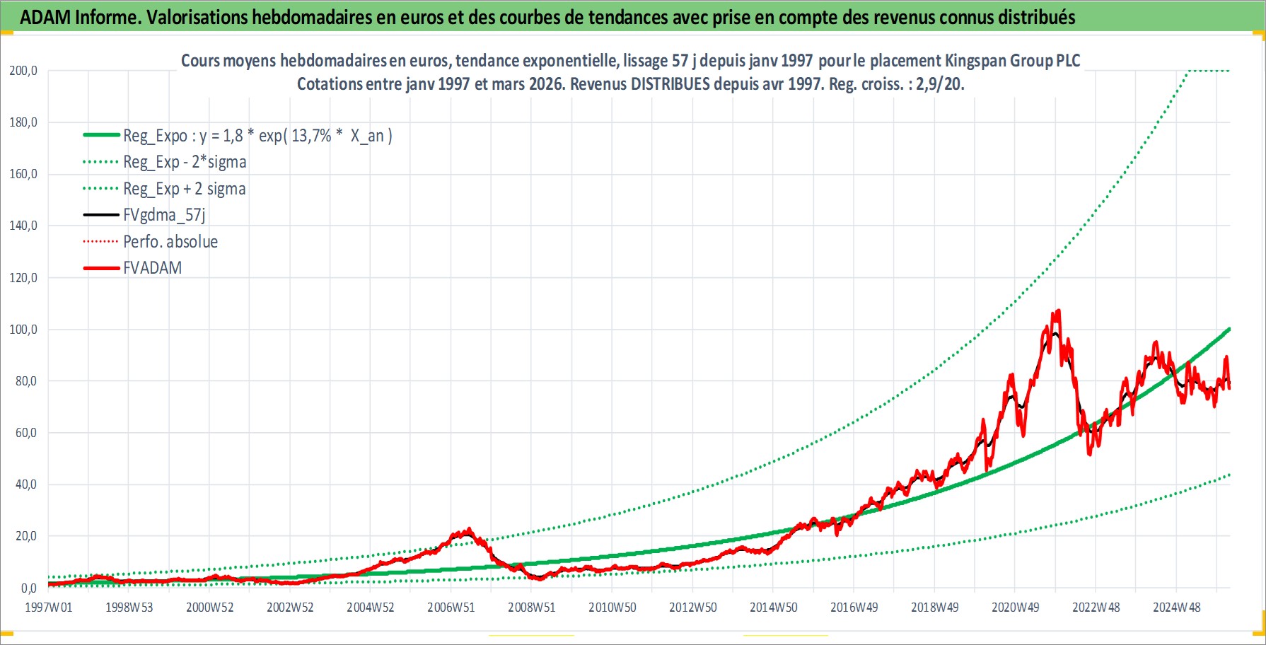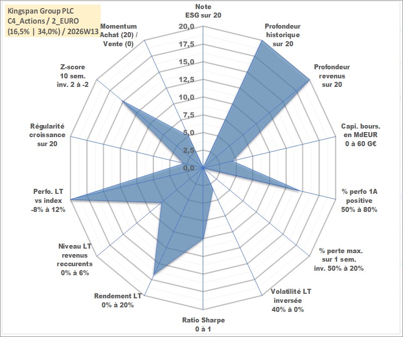Site dédié aux investisseursPage dédiée sur site financeAnalyse des valorisations hebdomadaires de l'action Kingspan Group PLC. Cet actif est cote en EUR. Les valorisations couvrent les semaines 1997W01 a 2026W13. Les revenus de cet actif financier sont pris en compte depuis la semaine 1997W18. La note ESG de cet actif n'est pas connue.