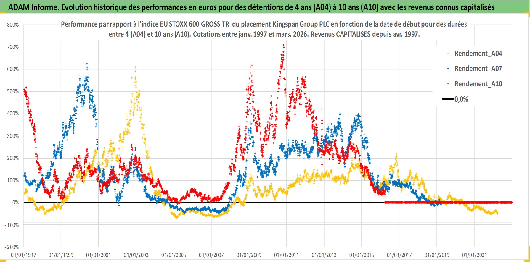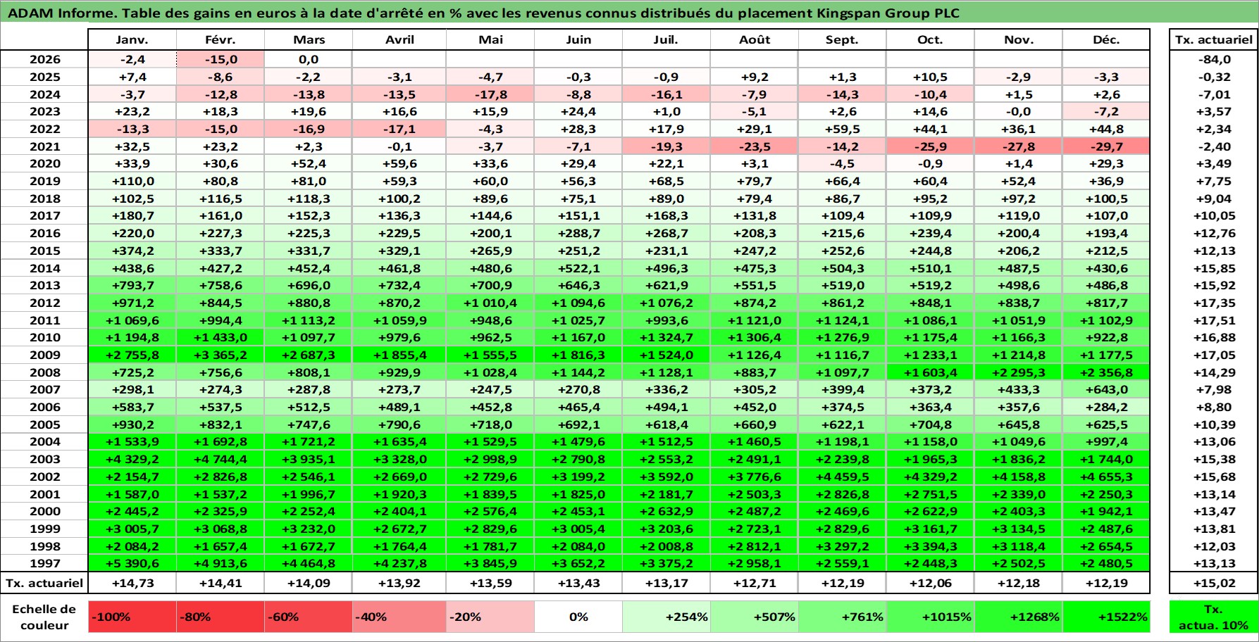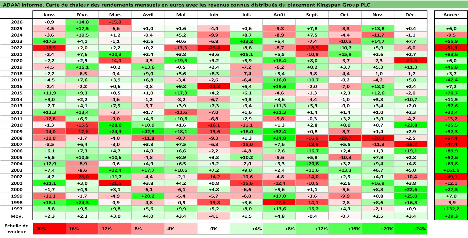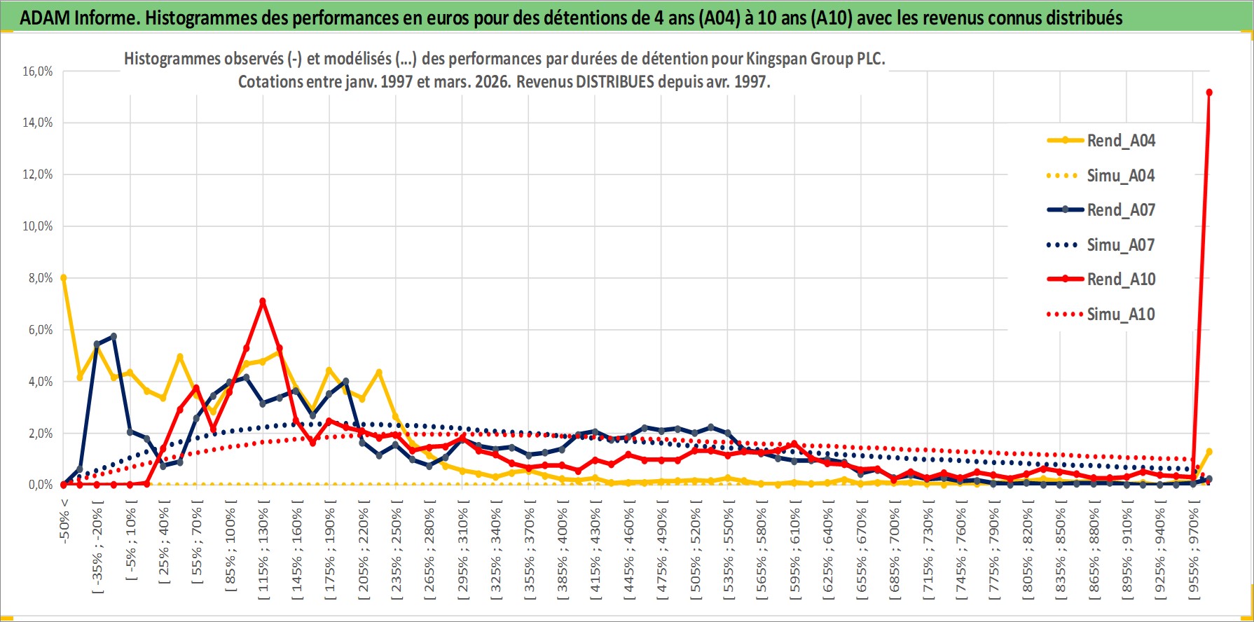 Site dédié aux investisseursPage dédiée sur site financeAnalyse des valorisations hebdomadaires de l'action Kingspan Group PLC. Cet actif est cote en EUR. Les valorisations couvrent les semaines 1997W01 a 2026W13. Les revenus de cet actif financier sont pris en compte depuis la semaine 1997W18. La note ESG de cet actif n'est pas connue.