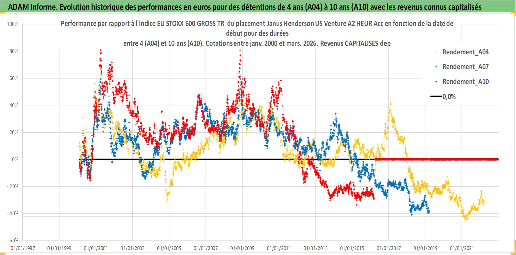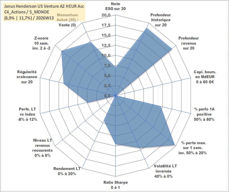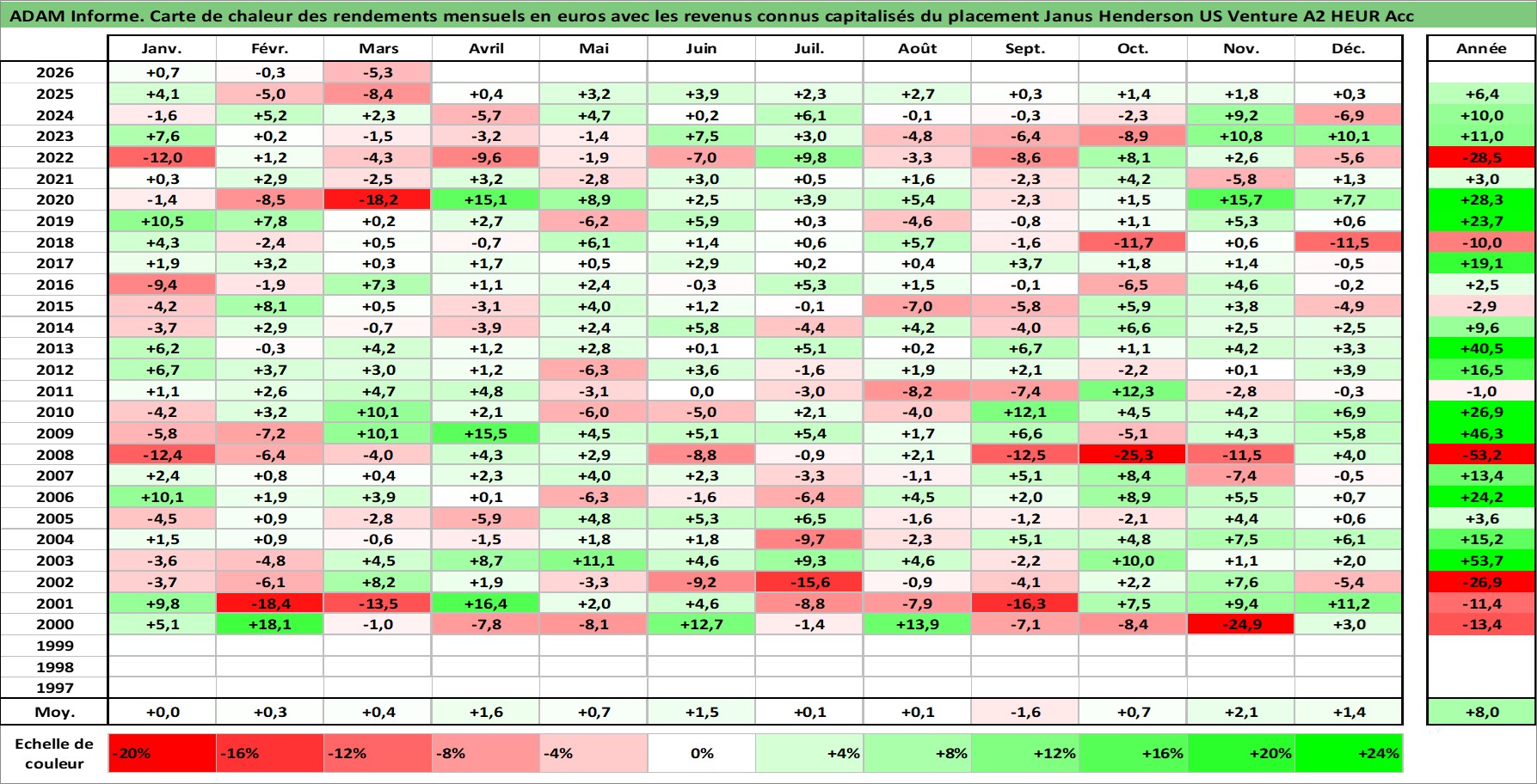 Site dédié aux investisseursPage dédiée sur site financeAnalyse des valorisations hebdomadaires du fonds Janus Henderson US Venture A2 HEUR Acc. Cet actif est cote en EUR. Les valorisations couvrent les semaines 2000W04 a 2026W13. Les revenus de cet actif financier sont pris en compte depuis la semaine 2000W04. La note globale ESG de cet actif est estimee a 7.0 (apres rebasage entre 0 et 20).