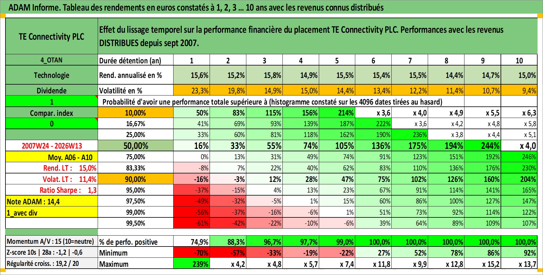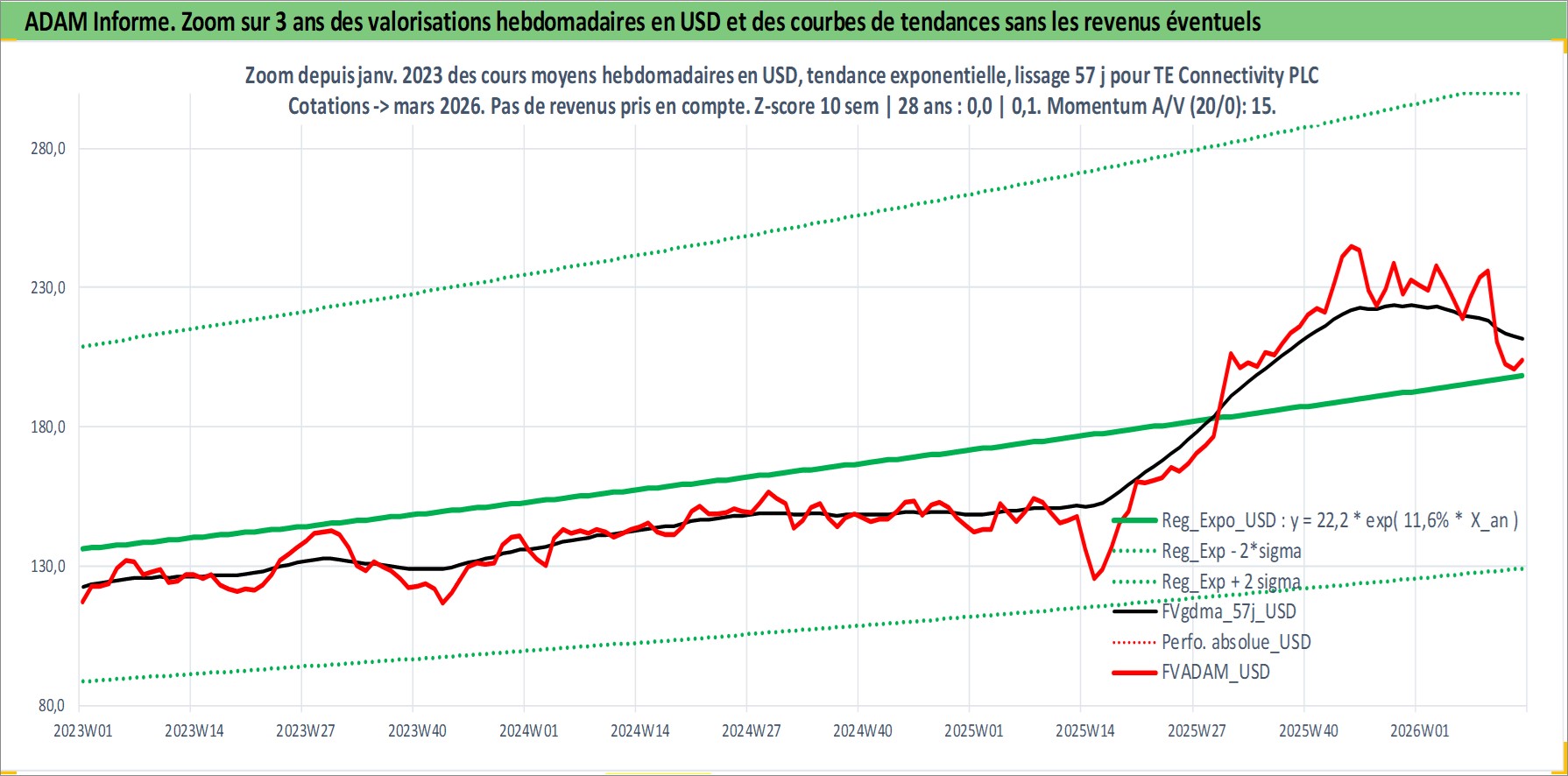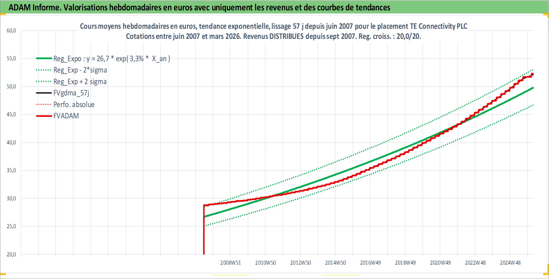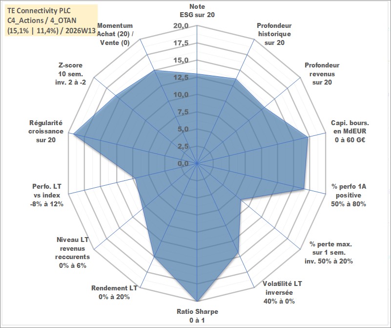 Site dédié aux investisseursPage dédiée sur site financeAnalyse des valorisations hebdomadaires de l'action TE Connectivity PLC. Cet actif est cote en USD. Les valorisations sont en contrevaleur EURO et couvrent les semaines 2007W24 a 2026W13. Les revenus de cet actif financier sont pris en compte depuis la semaine 2007W39. La note globale ESG de cet actif est estimee a 13.0 (apres rebasage entre 0 et 20).