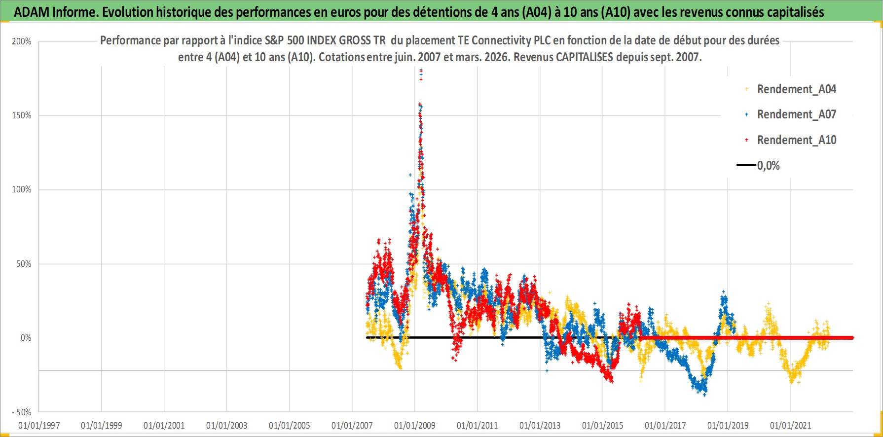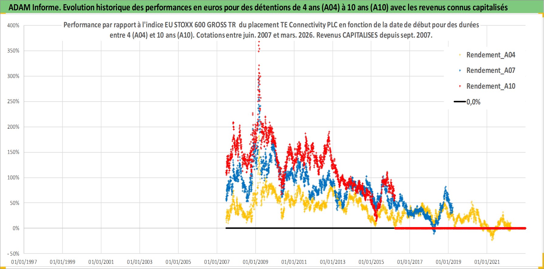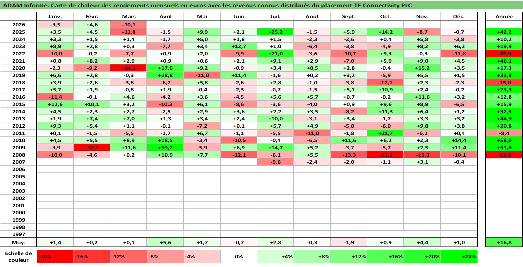 Site dédié aux investisseursPage dédiée sur site financeAnalyse des valorisations hebdomadaires de l'action TE Connectivity PLC. Cet actif est cote en USD. Les valorisations sont en contrevaleur EURO et couvrent les semaines 2007W24 a 2026W13. Les revenus de cet actif financier sont pris en compte depuis la semaine 2007W39. La note globale ESG de cet actif est estimee a 13.0 (apres rebasage entre 0 et 20).
