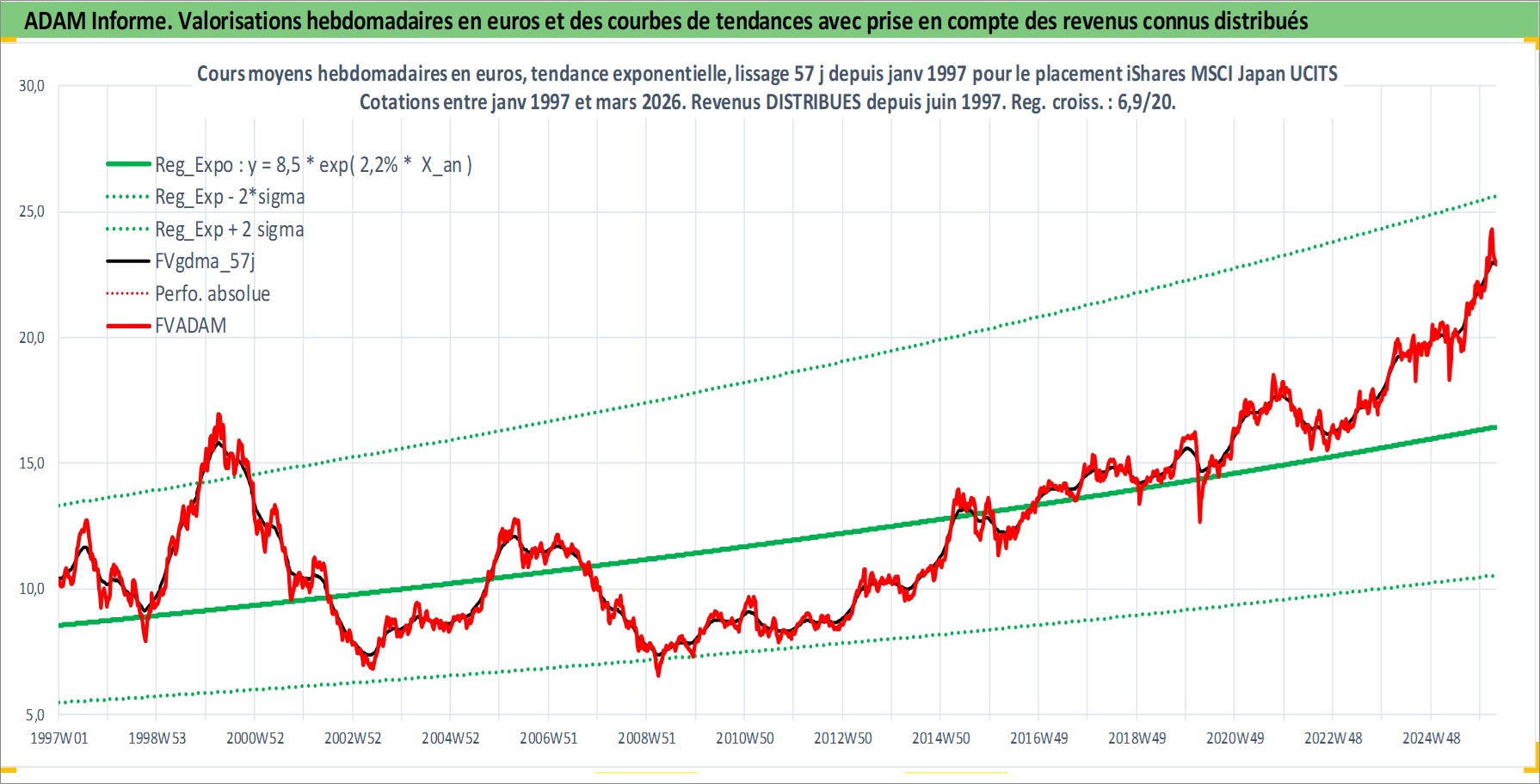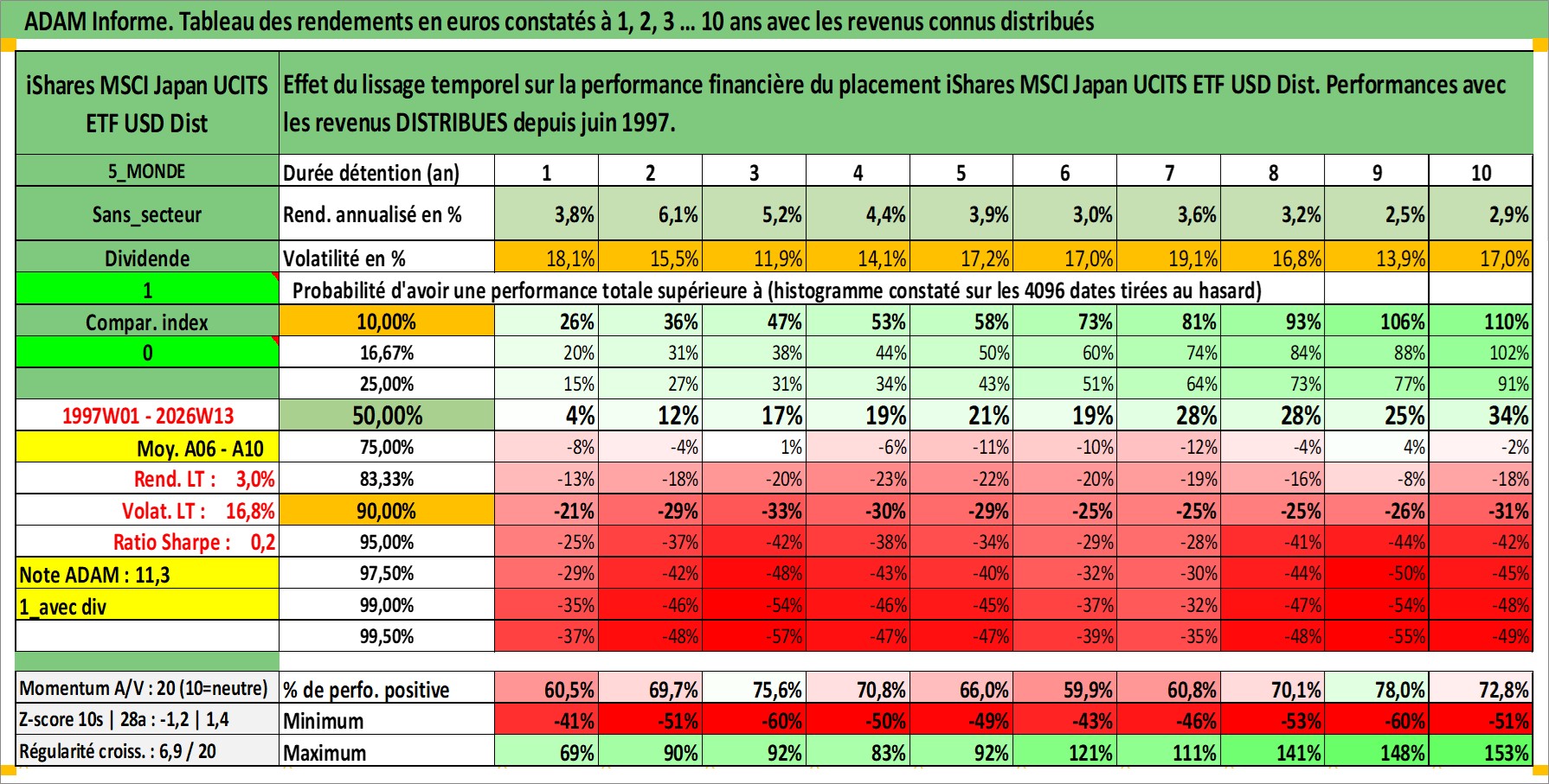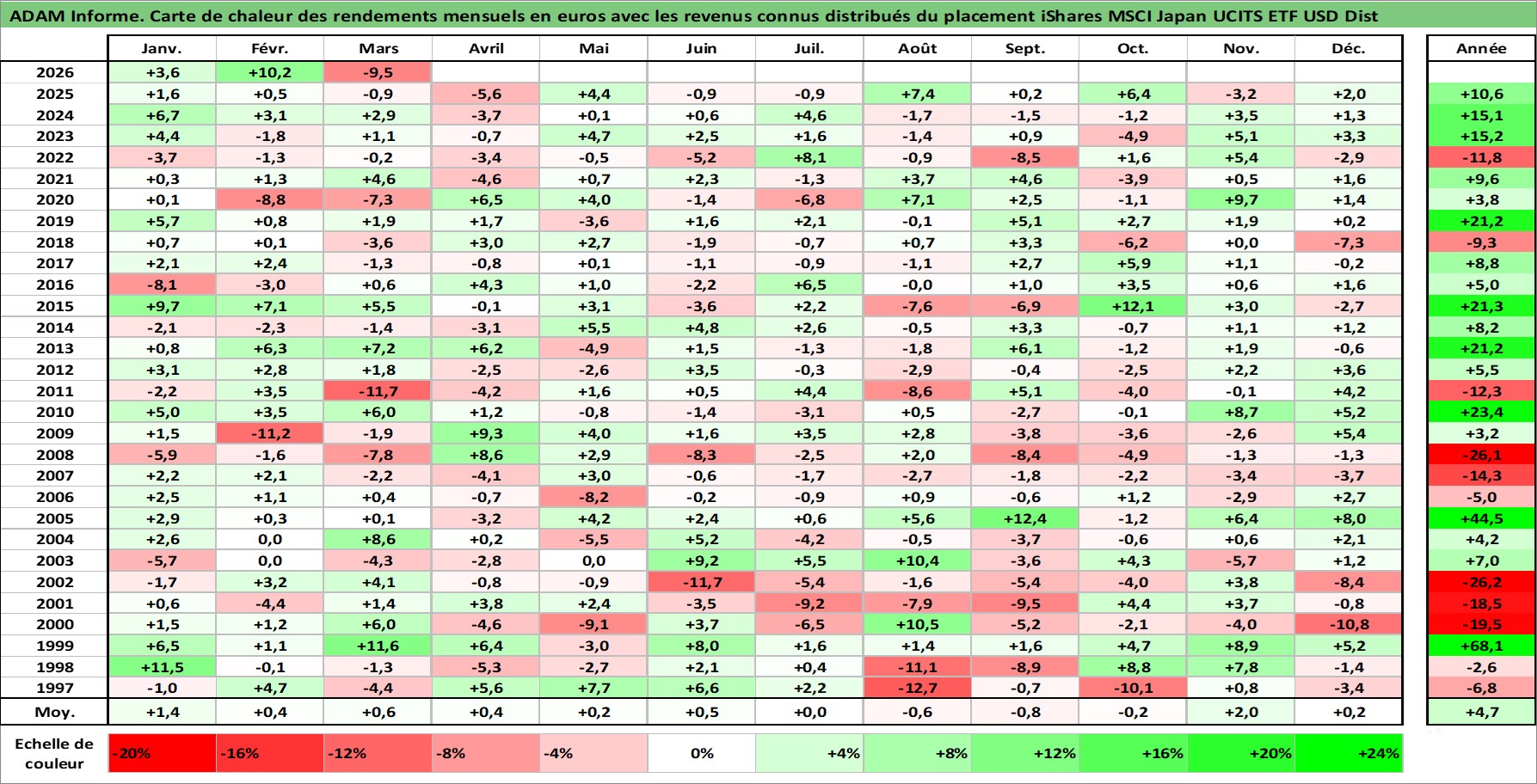 Site dédié aux investisseursPage dédiée sur site financeAnalyse des valorisations hebdomadaires du fonds iShares MSCI Japan UCITS ETF USD Dist. Cet actif est cote en USD. Les valorisations sont en contrevaleur EURO et couvrent les semaines 1997W01 a 2026W13. Les revenus de cet actif financier sont pris en compte depuis la semaine 1997W26. La note ESG de cet actif n'est pas connue.