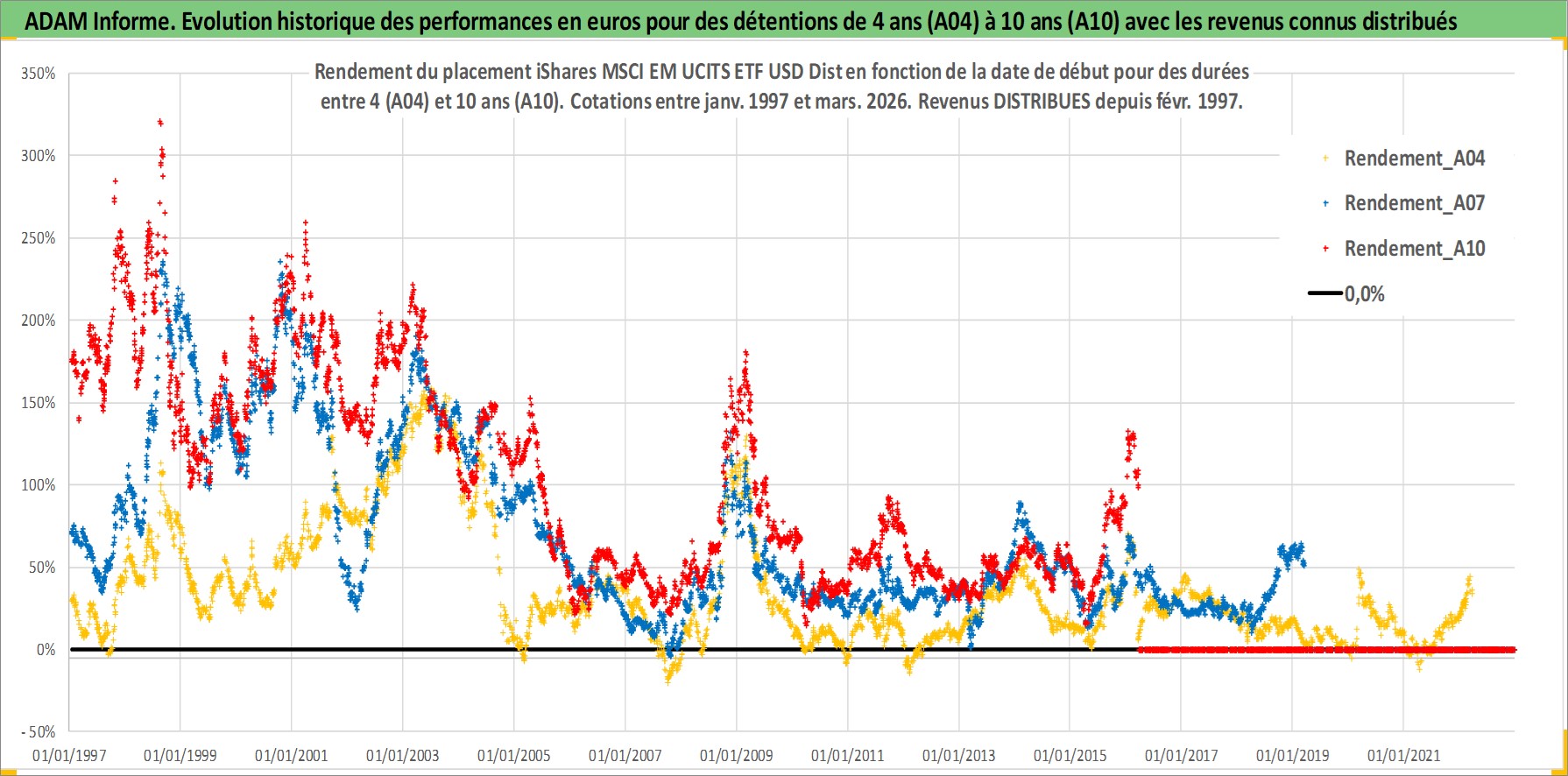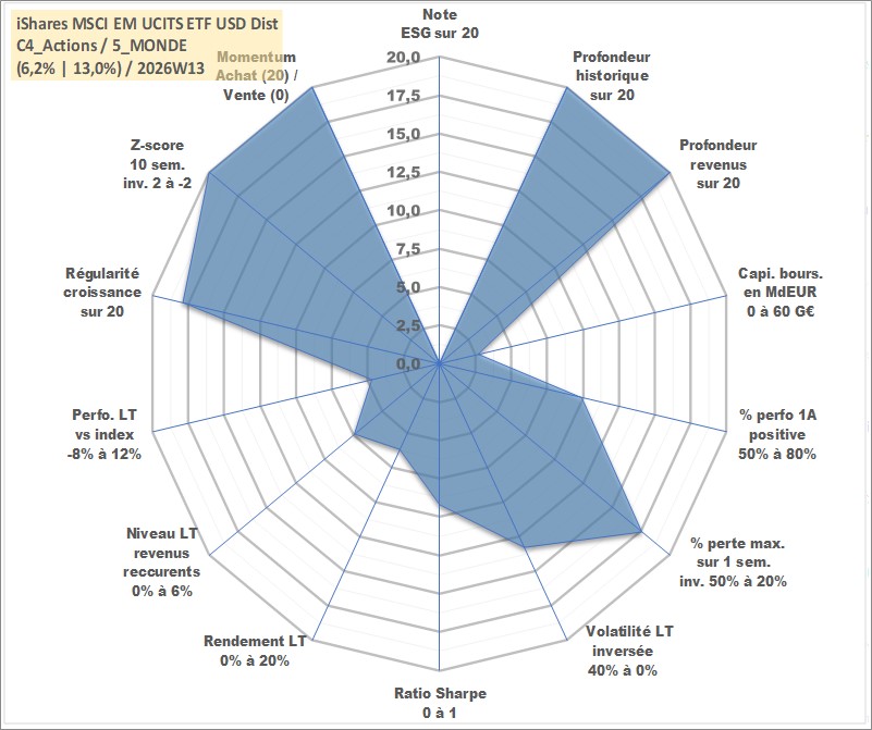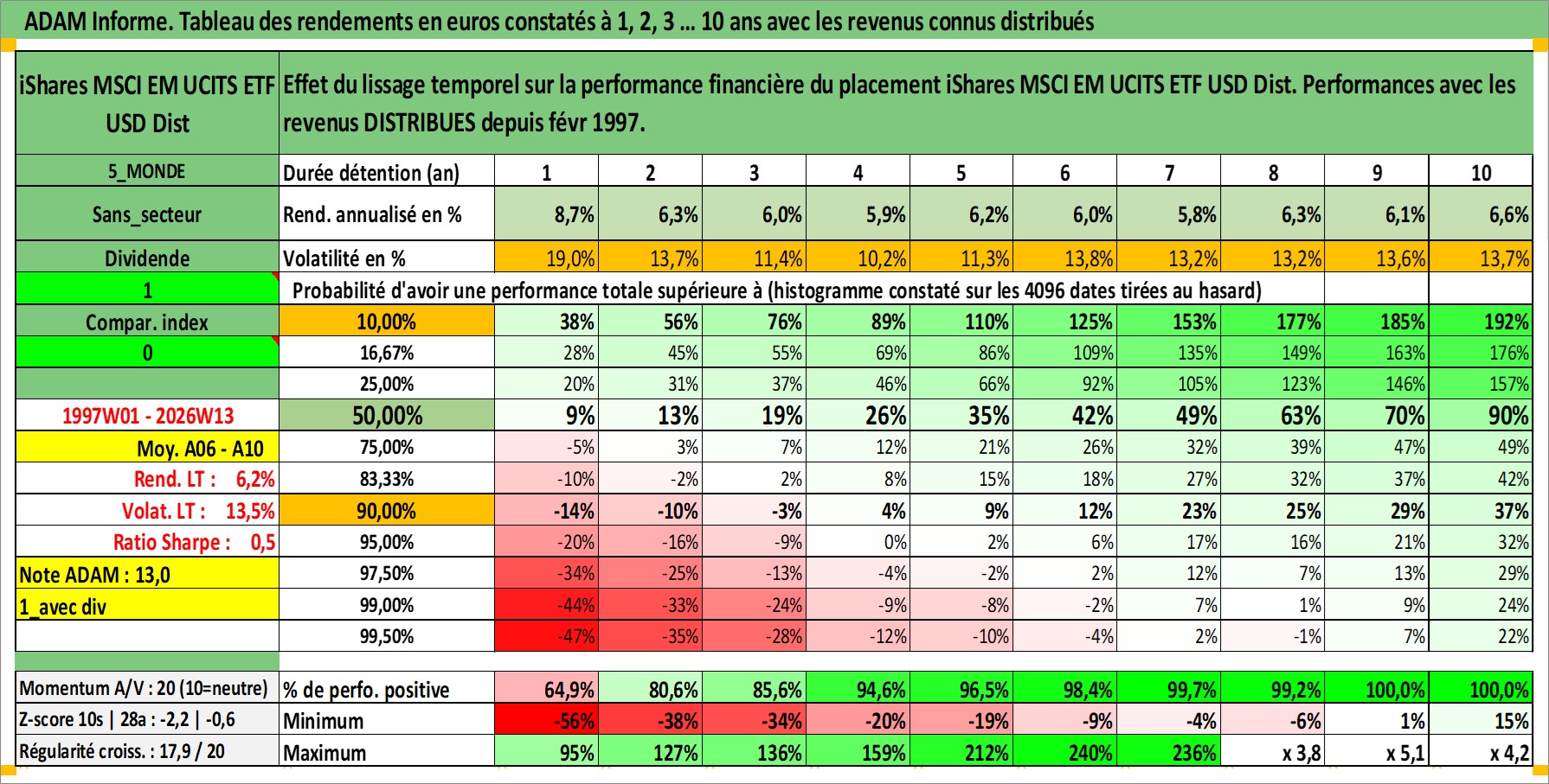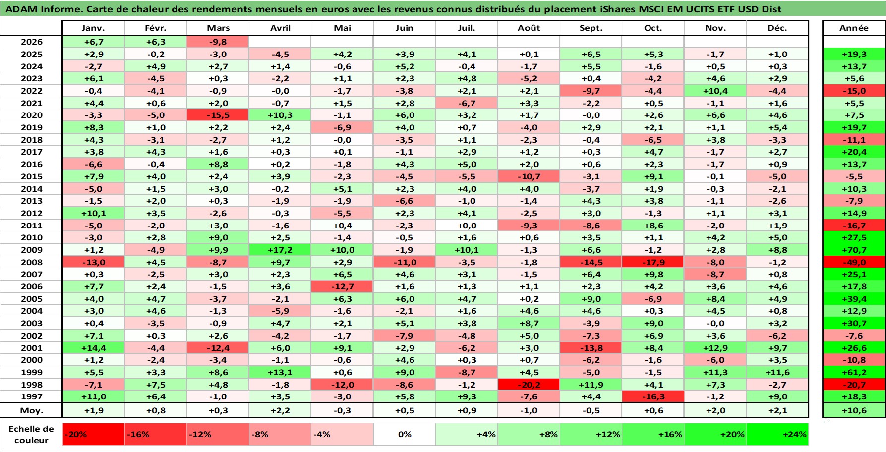 Site dédié aux investisseursPage dédiée sur site financeAnalyse des valorisations hebdomadaires du fonds iShares MSCI EM UCITS ETF USD Dist. Cet actif est cote en USD. Les valorisations sont en contrevaleur EURO et couvrent les semaines 1997W01 a 2026W13. Les revenus de cet actif financier sont pris en compte depuis la semaine 1997W09. La note ESG de cet actif n'est pas connue.