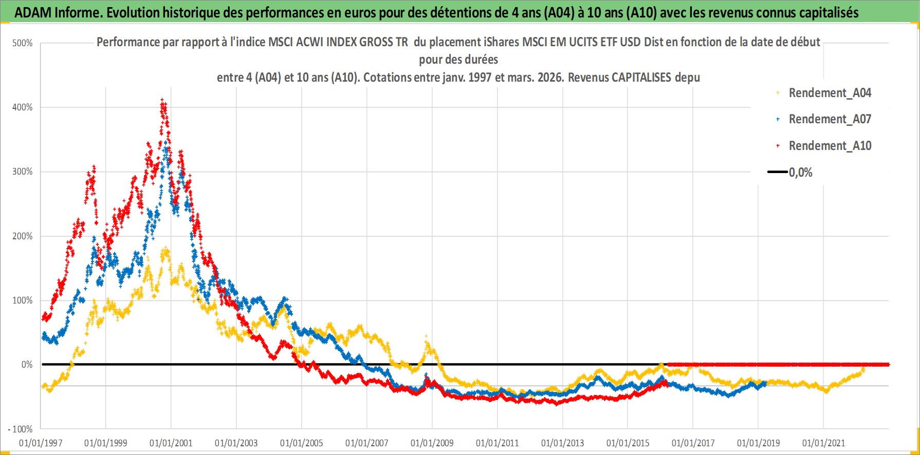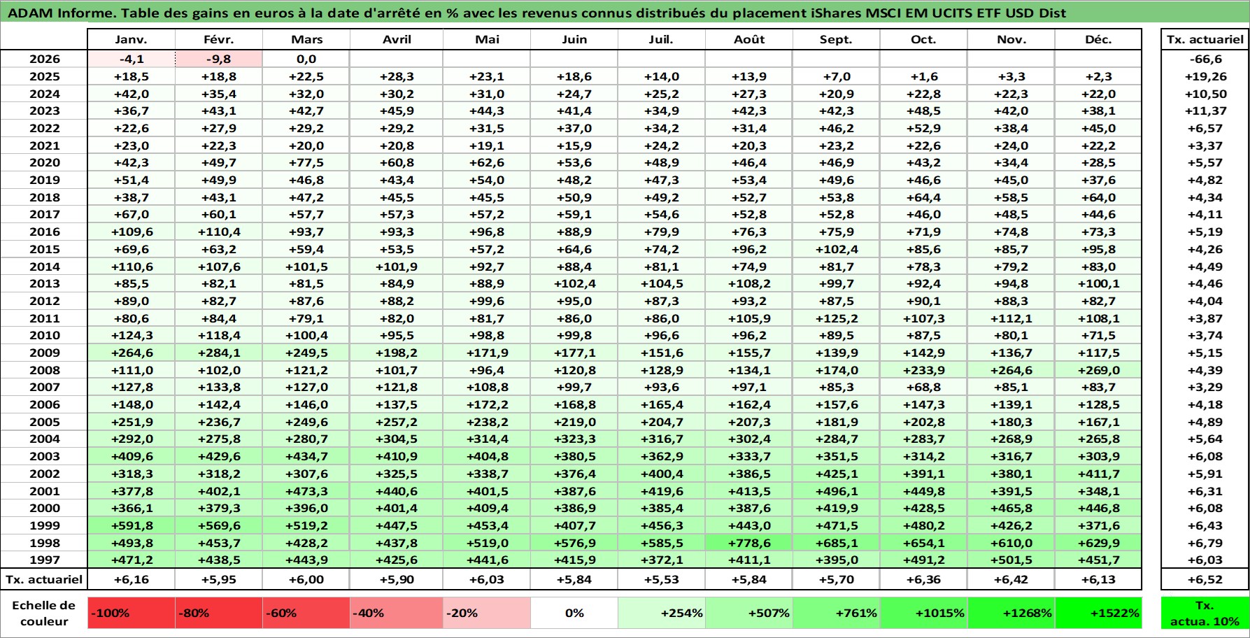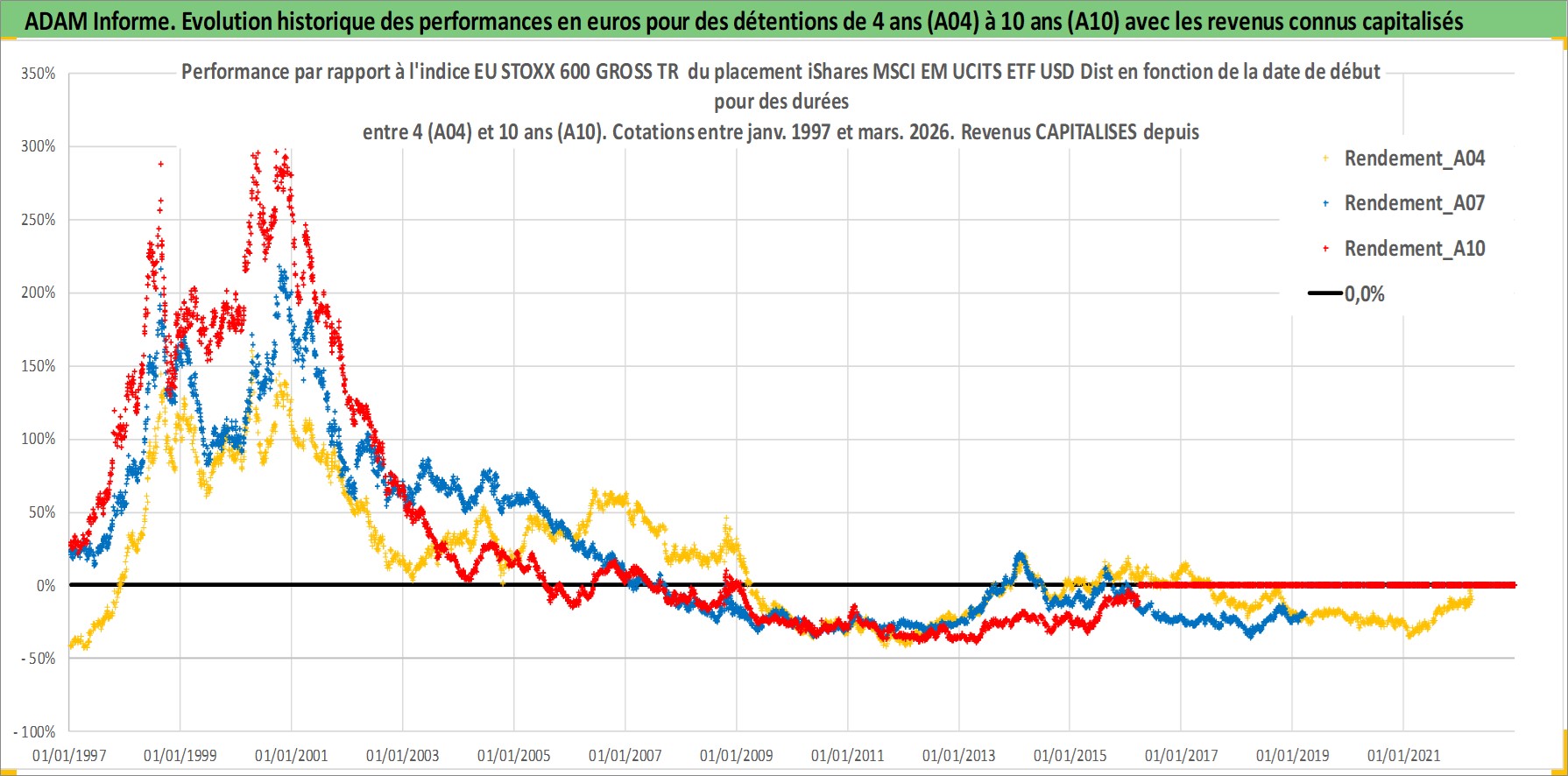 Site dédié aux investisseursPage dédiée sur site financeAnalyse des valorisations hebdomadaires du fonds iShares MSCI EM UCITS ETF USD Dist. Cet actif est cote en USD. Les valorisations sont en contrevaleur EURO et couvrent les semaines 1997W01 a 2026W13. Les revenus de cet actif financier sont pris en compte depuis la semaine 1997W09. La note ESG de cet actif n'est pas connue.