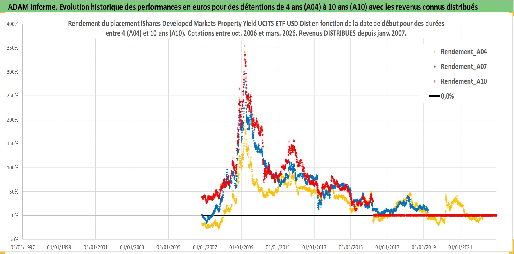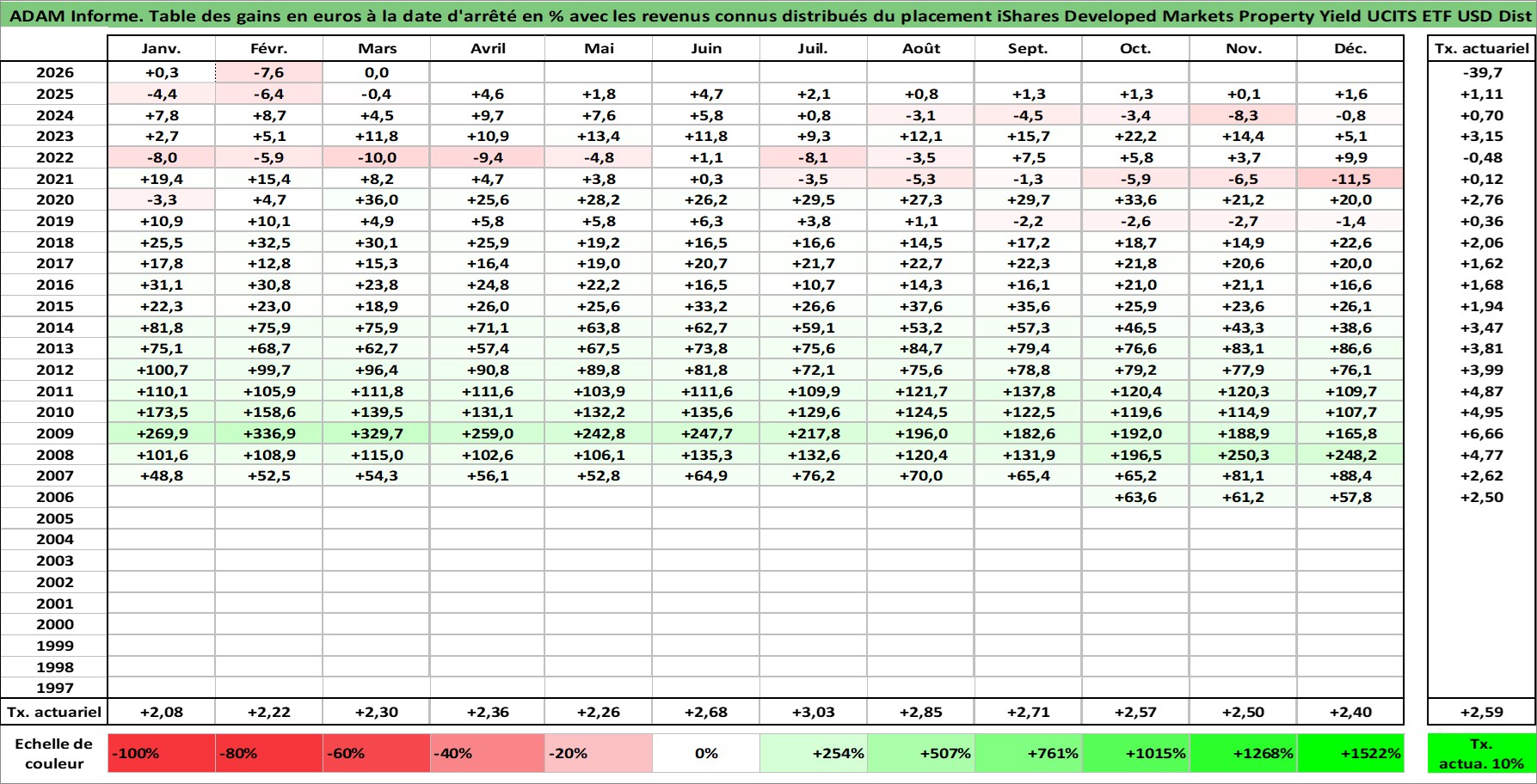 Site dédié aux investisseursPage dédiée sur site financeAnalyse des valorisations hebdomadaires du fonds iShares Developed Markets Property Yield UCITS ETF USD Dist. Cet actif est cote en USD. Les valorisations sont en contrevaleur EURO et couvrent les semaines 2006W42 a 2026W13. Les revenus de cet actif financier sont pris en compte depuis la semaine 2007W05. La note ESG de cet actif n'est pas connue.