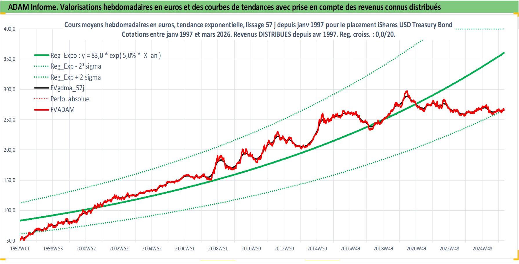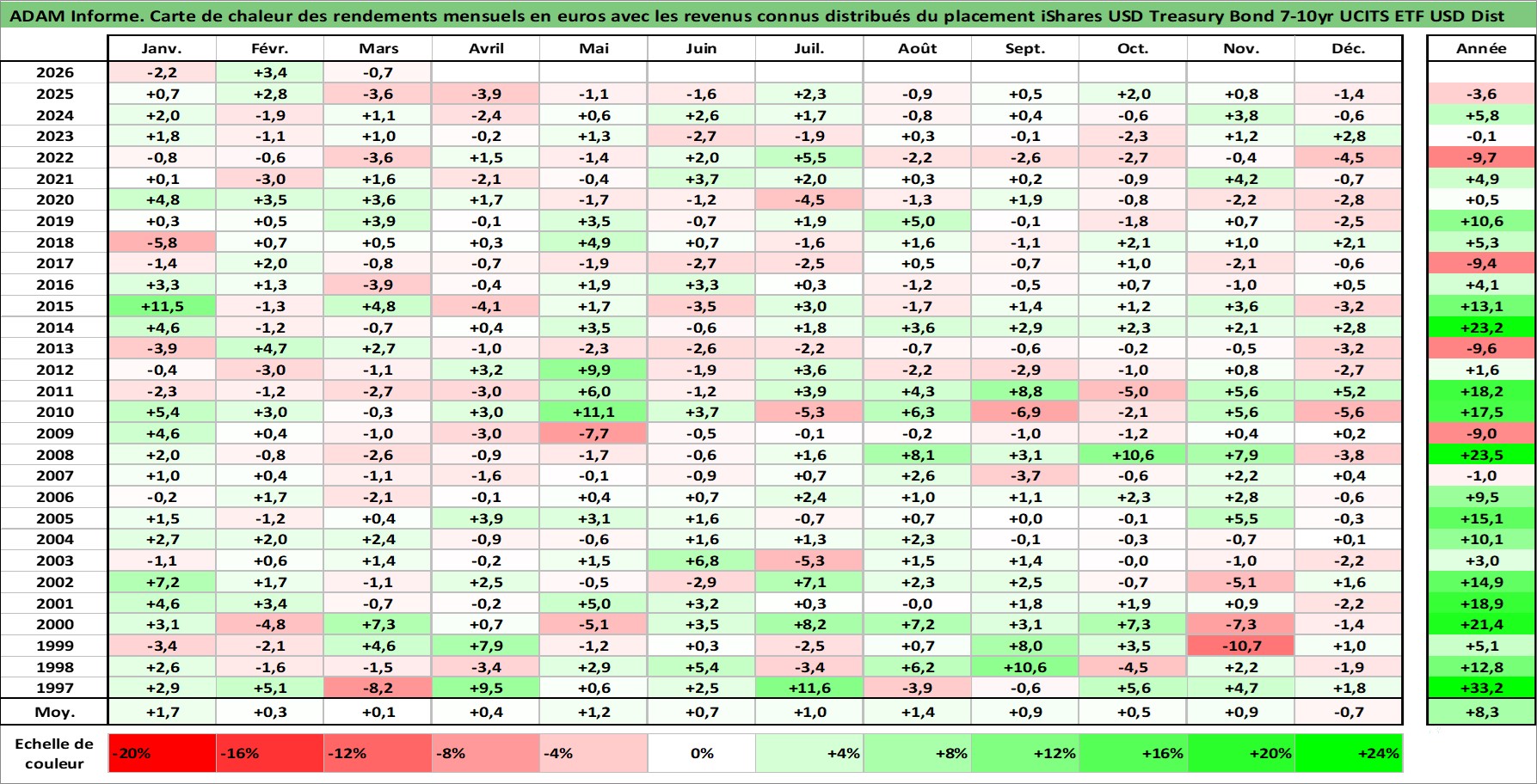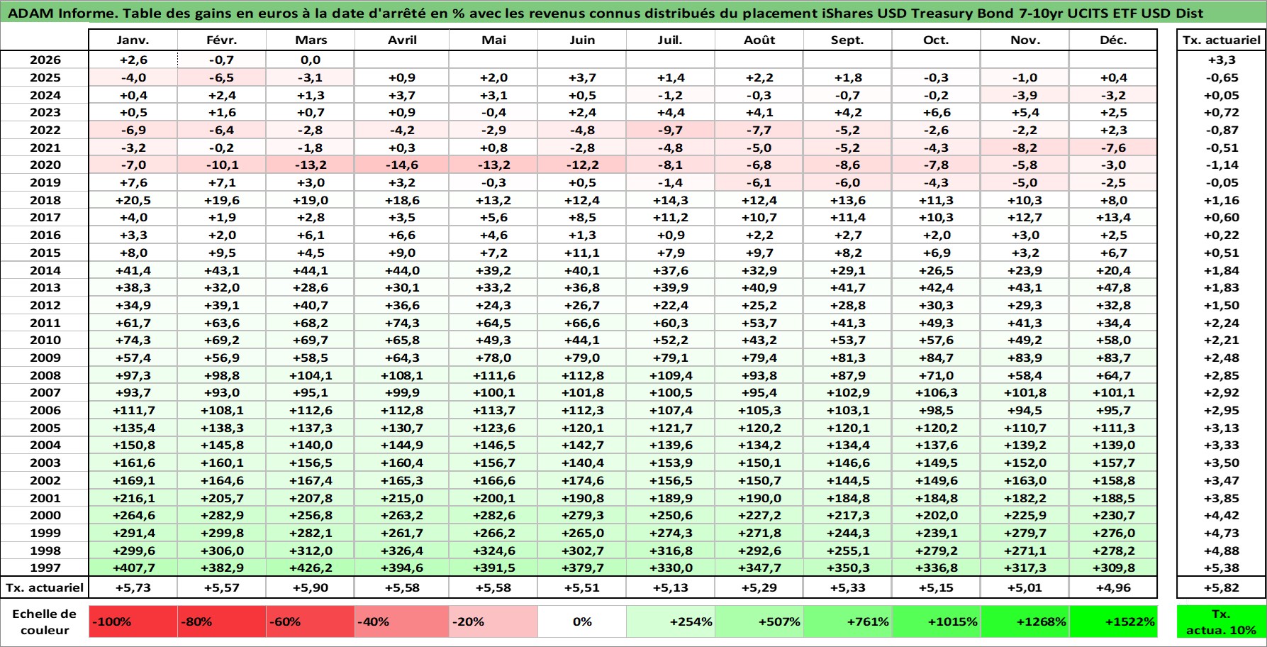 Site dédié aux investisseursPage dédiée sur site financeAnalyse des valorisations hebdomadaires du fonds iShares USD Treasury Bond 7-10yr UCITS ETF USD Dist. Cet actif est cote en USD. Les valorisations sont en contrevaleur EURO et couvrent les semaines 1997W01 a 2026W13. Les revenus de cet actif financier sont pris en compte depuis la semaine 1997W17. La note ESG de cet actif n'est pas connue.