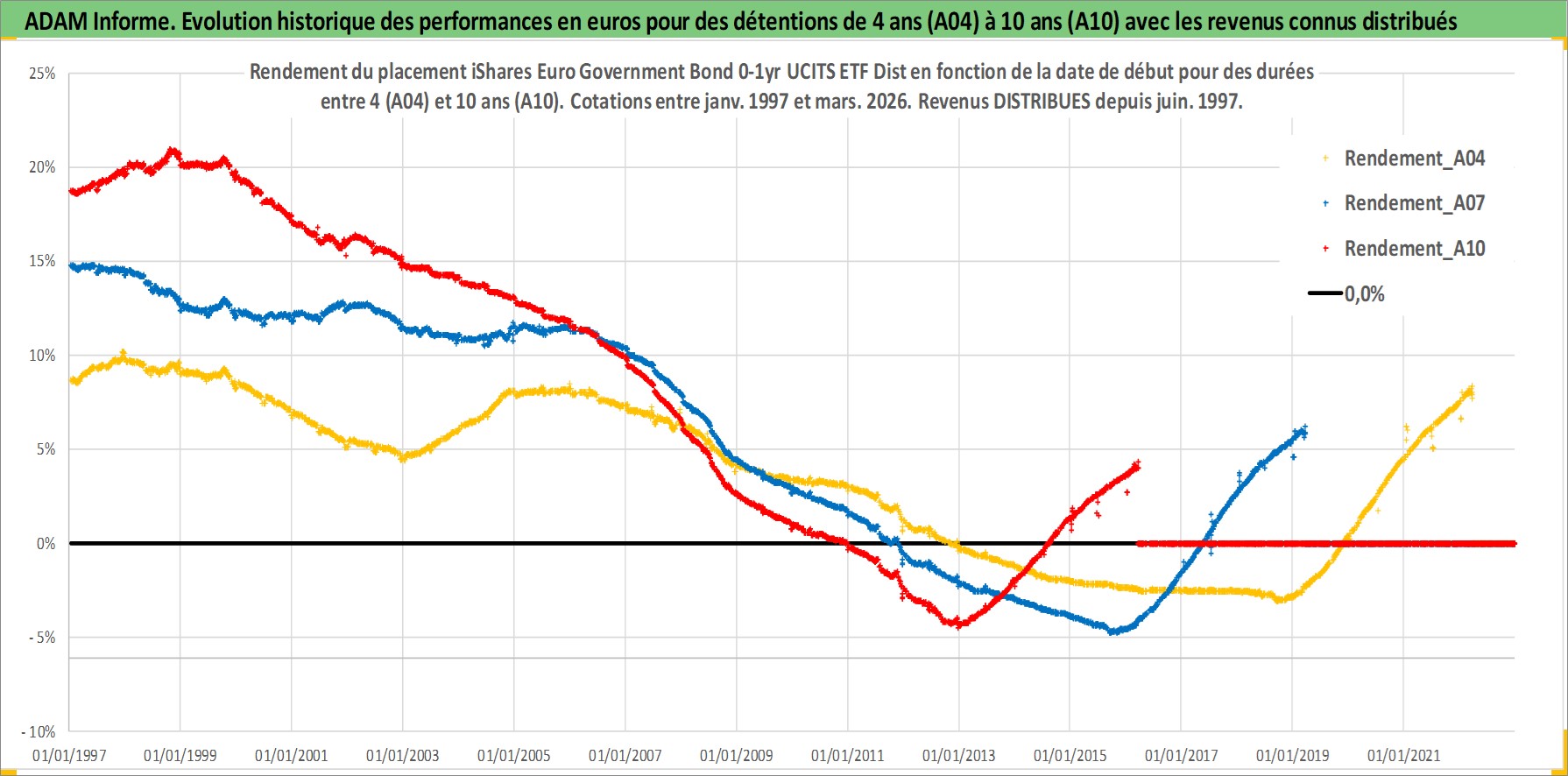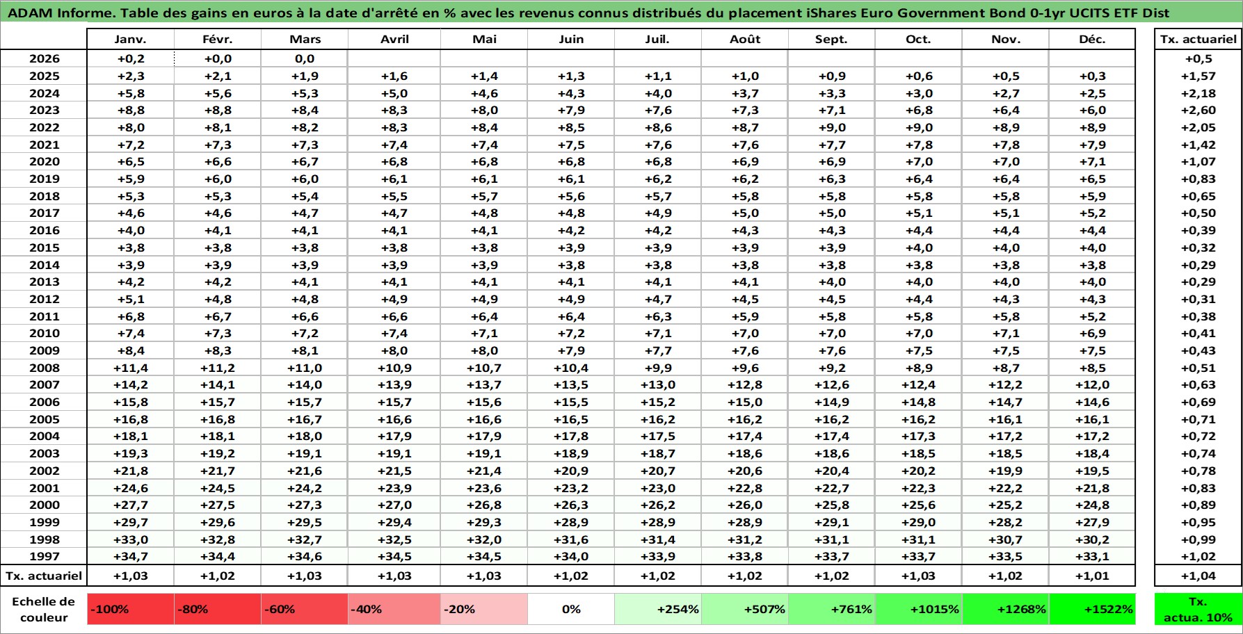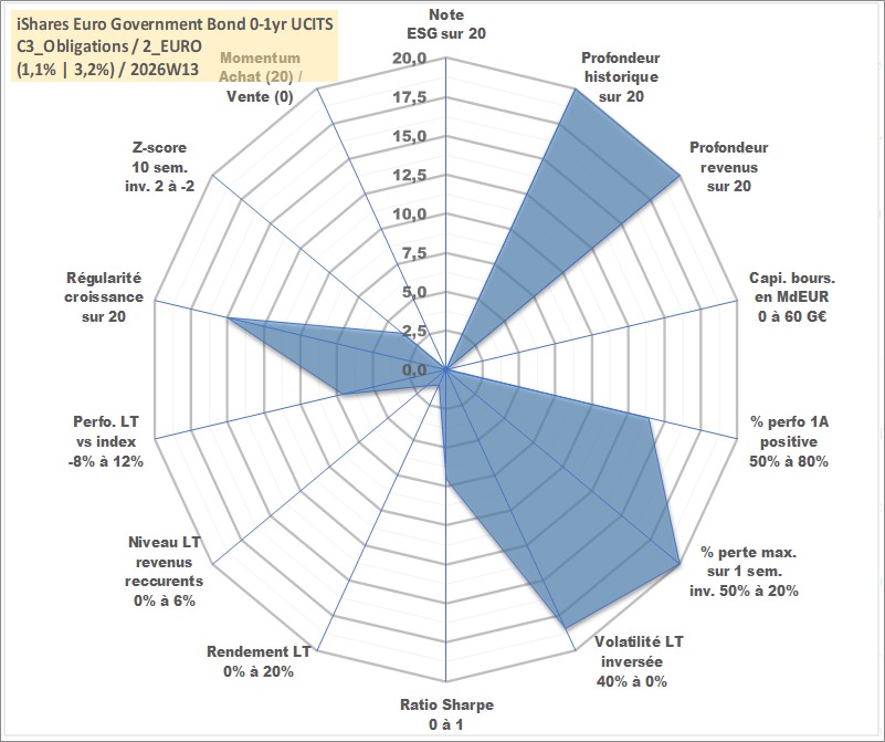 Site dédié aux investisseursPage dédiée sur site financeAnalyse des valorisations hebdomadaires du fonds iShares Euro Government Bond 0-1yr UCITS ETF Dist. Cet actif est cote en EUR. Les valorisations couvrent les semaines 1997W01 a 2026W13. Les revenus de cet actif financier sont pris en compte depuis la semaine 1997W26. La note ESG de cet actif n'est pas connue.