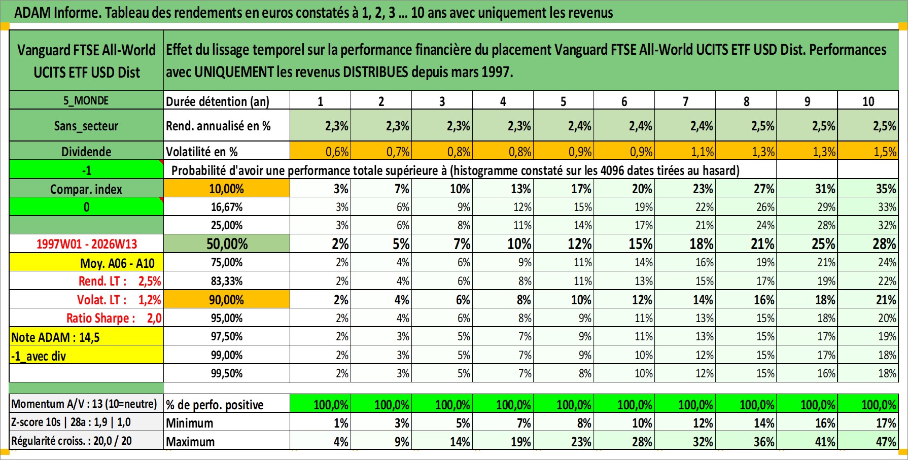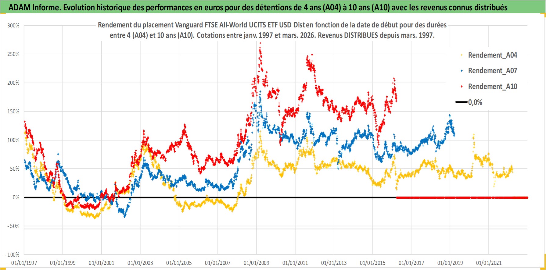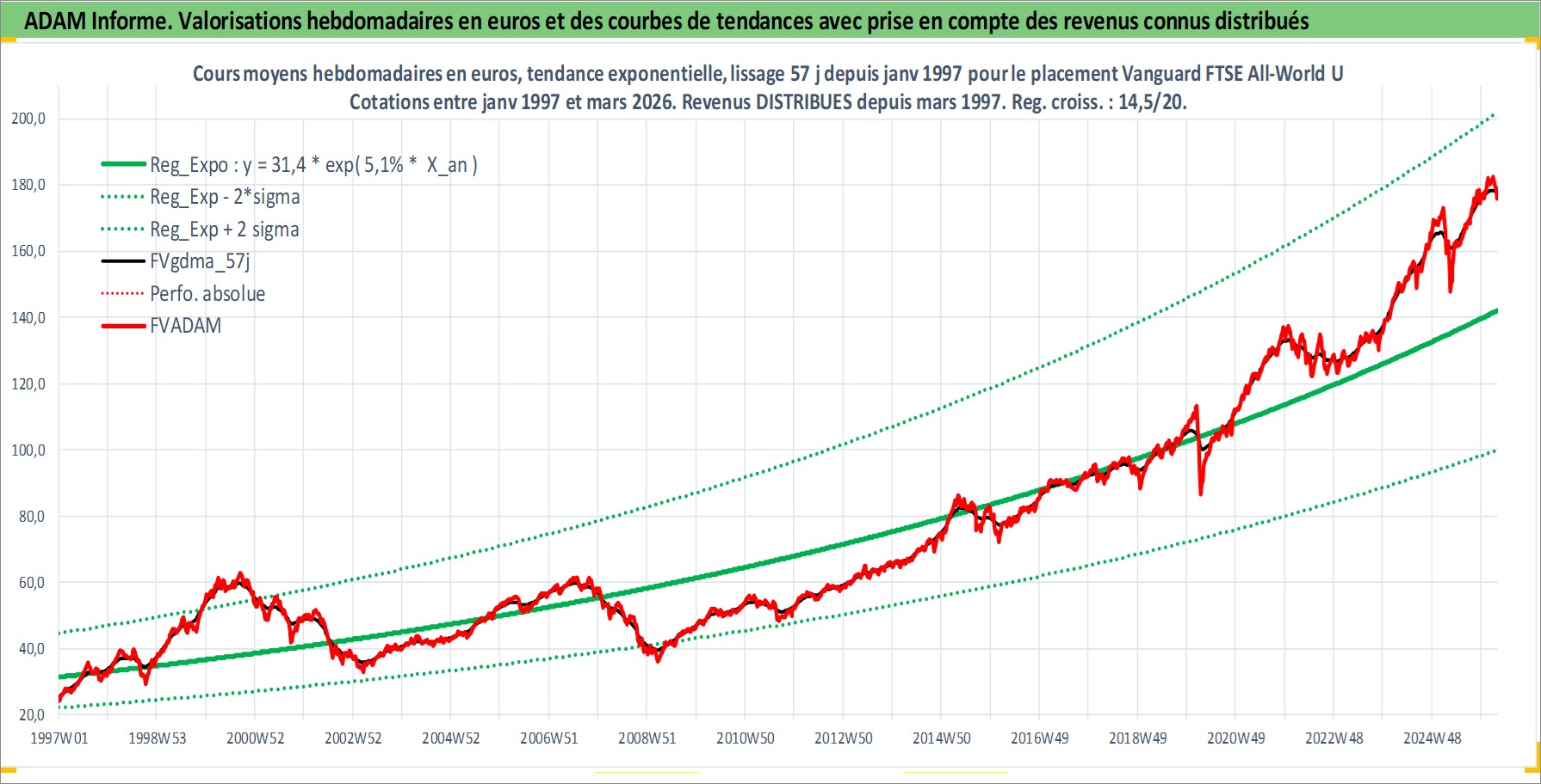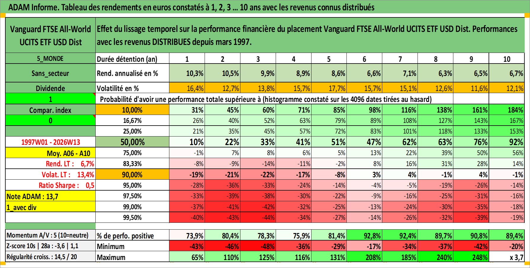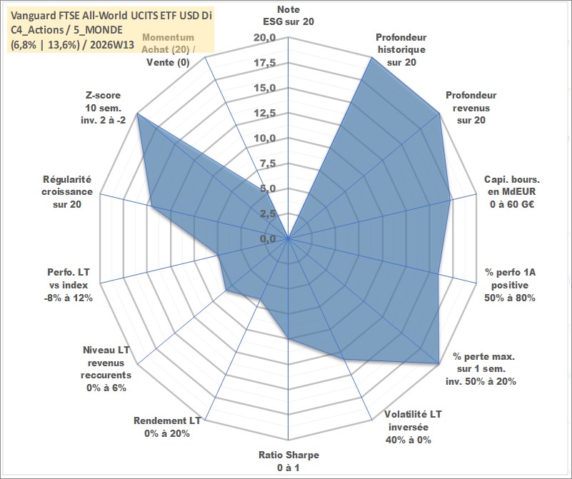 Site dédié aux investisseursPage dédiée sur site financeAnalyse des valorisations hebdomadaires du fonds Vanguard FTSE All-World UCITS ETF USD Dist. Cet actif est cote en USD. Les valorisations sont en contrevaleur EURO et couvrent les semaines 1997W01 a 2026W13. Les revenus de cet actif financier sont pris en compte depuis la semaine 1997W13. La note ESG de cet actif n'est pas connue.