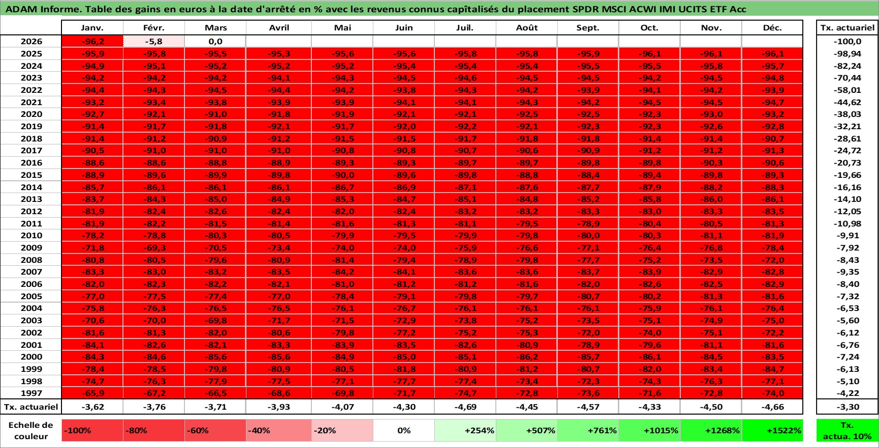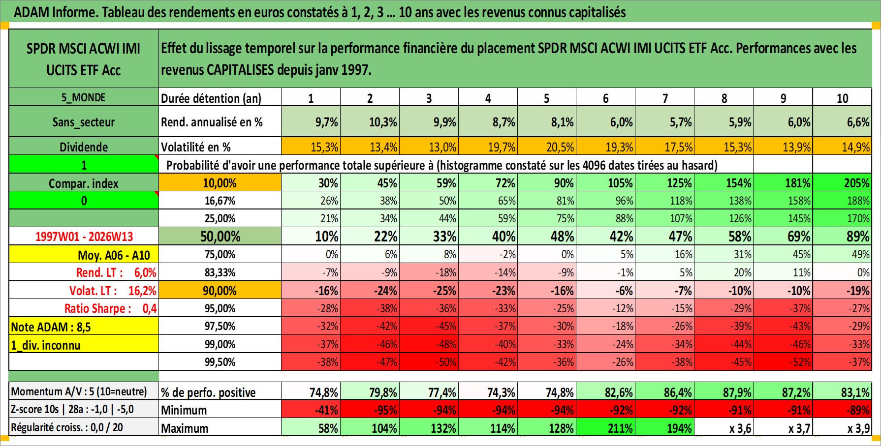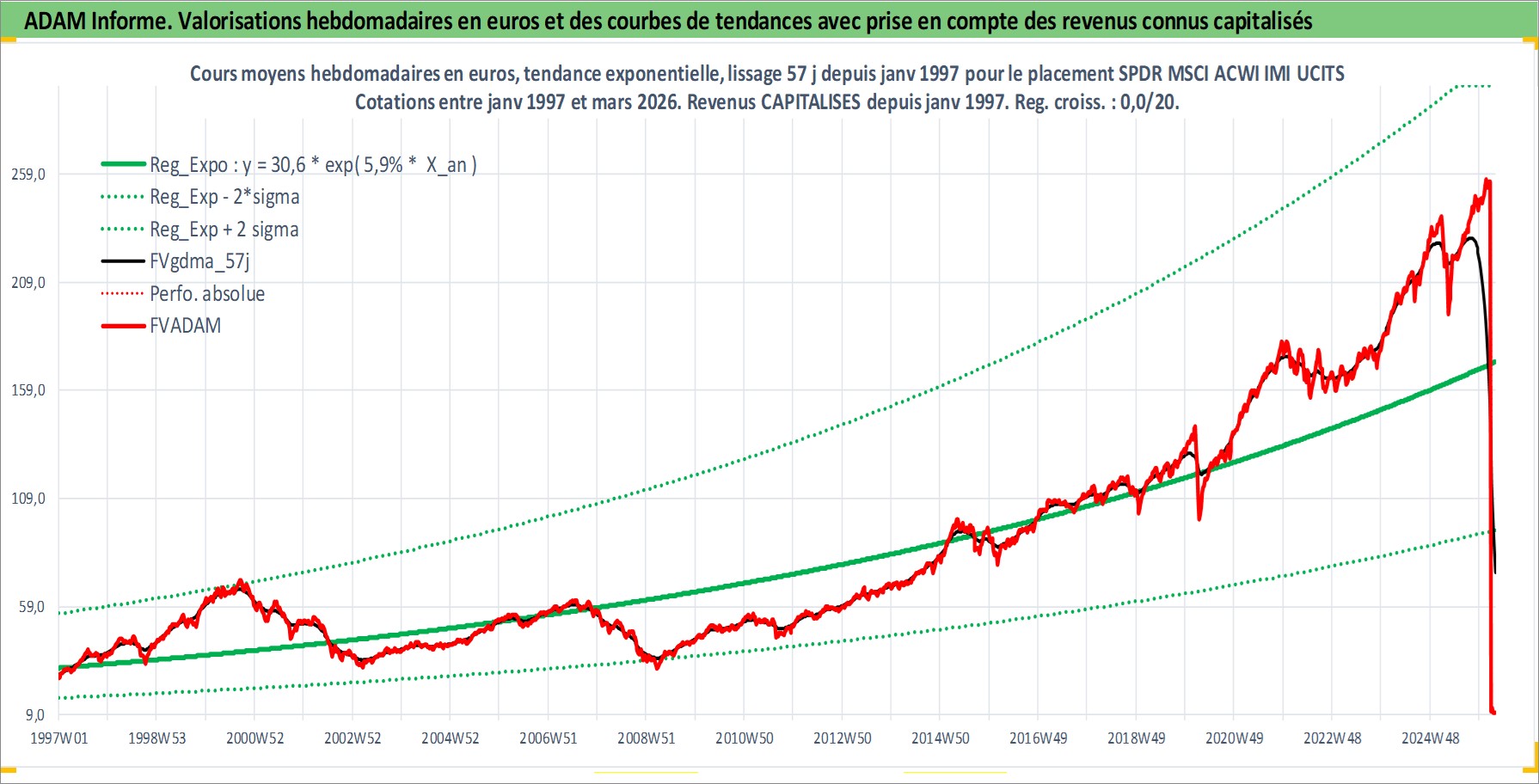 Site dédié aux investisseursPage dédiée sur site financeAnalyse des valorisations hebdomadaires du fonds SPDR MSCI ACWI IMI UCITS ETF Acc. Cet actif est cote en EUR. Les valorisations couvrent les semaines 1997W01 a 2026W13. Les revenus de cet actif financier sont pris en compte depuis la semaine 1997W01. La note ESG de cet actif n'est pas connue.