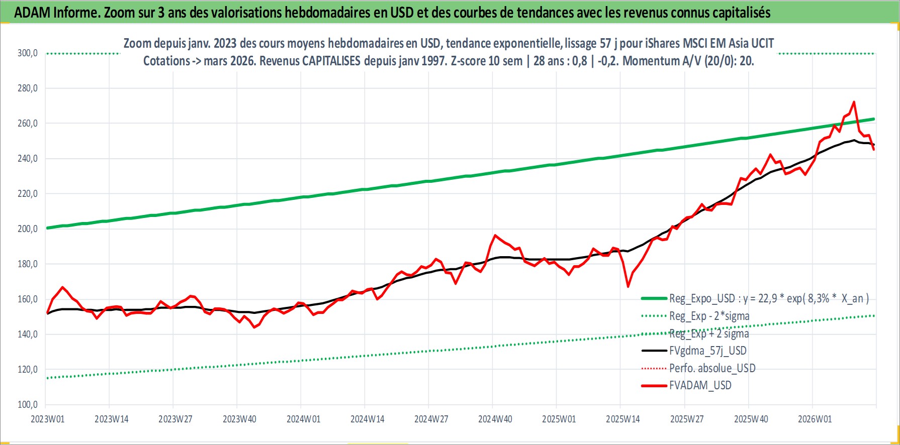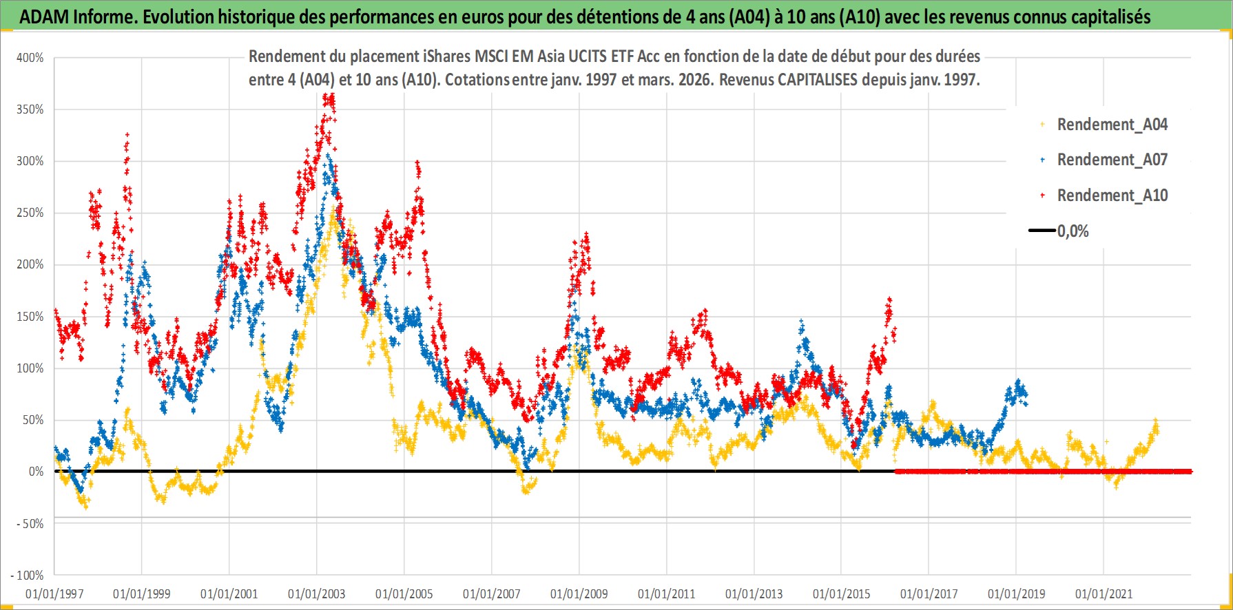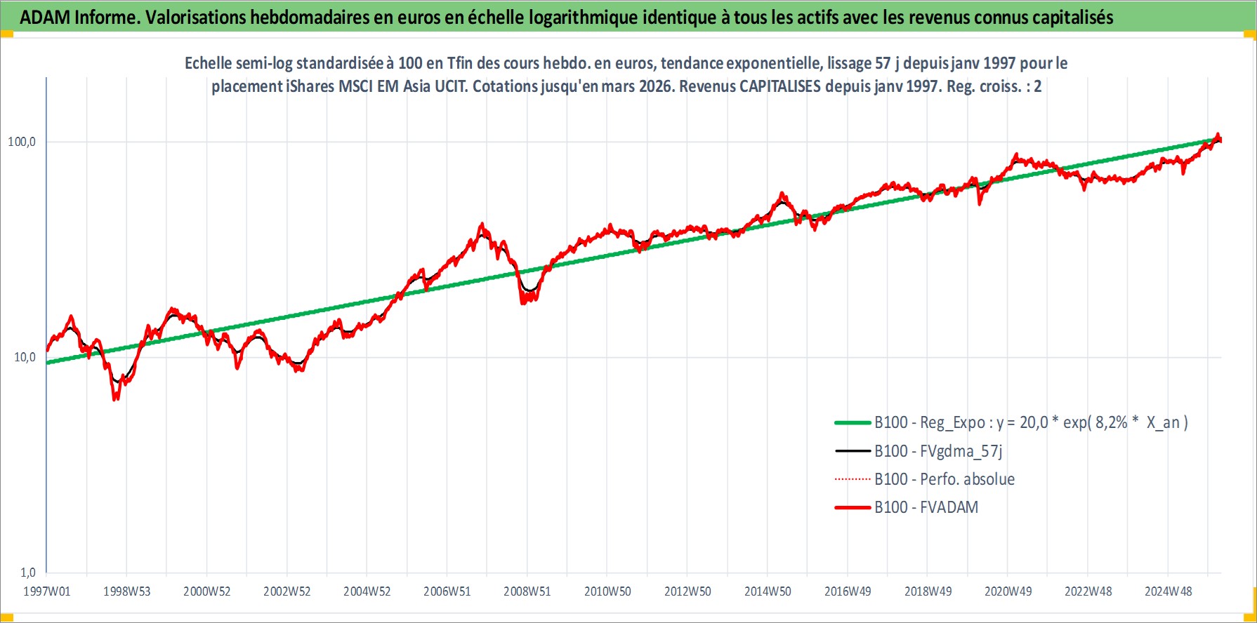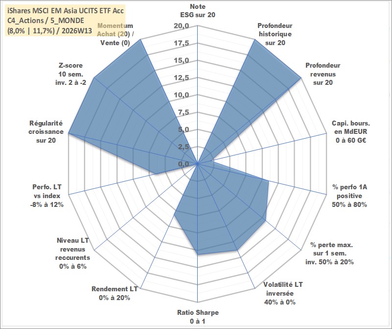 Site dédié aux investisseursPage dédiée sur site financeAnalyse des valorisations hebdomadaires du fonds iShares MSCI EM Asia UCITS ETF Acc. Cet actif est cote en USD. Les valorisations sont en contrevaleur EURO et couvrent les semaines 1997W01 a 2026W13. Les revenus de cet actif financier sont pris en compte depuis la semaine 1997W01. La note ESG de cet actif n'est pas connue.
