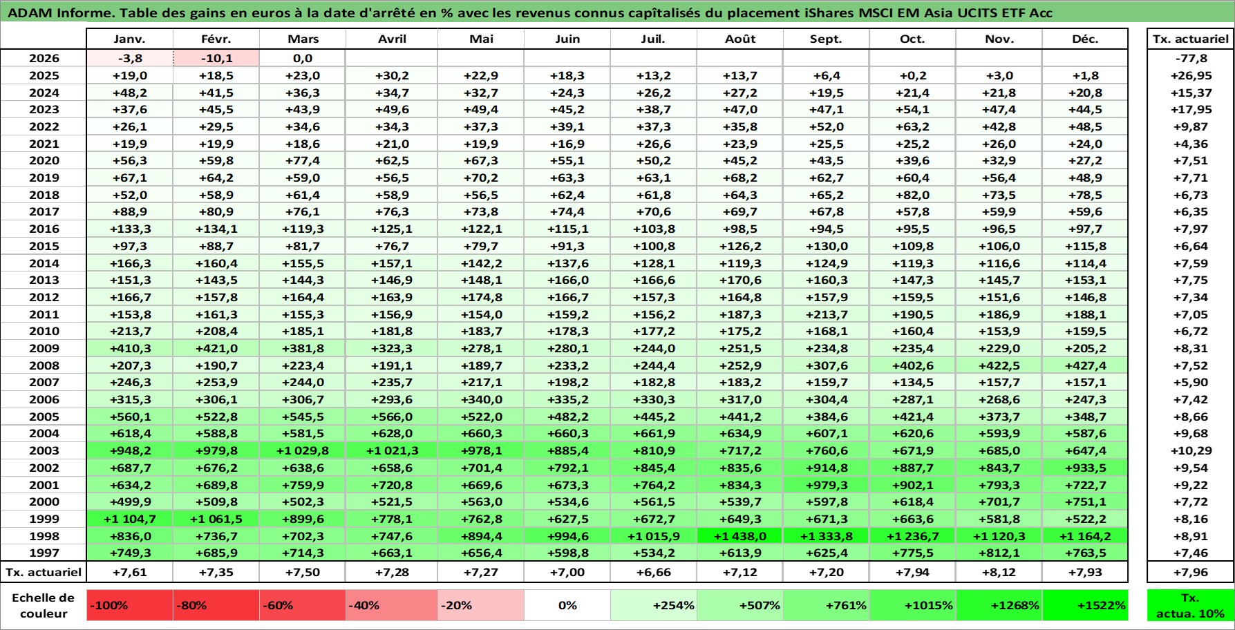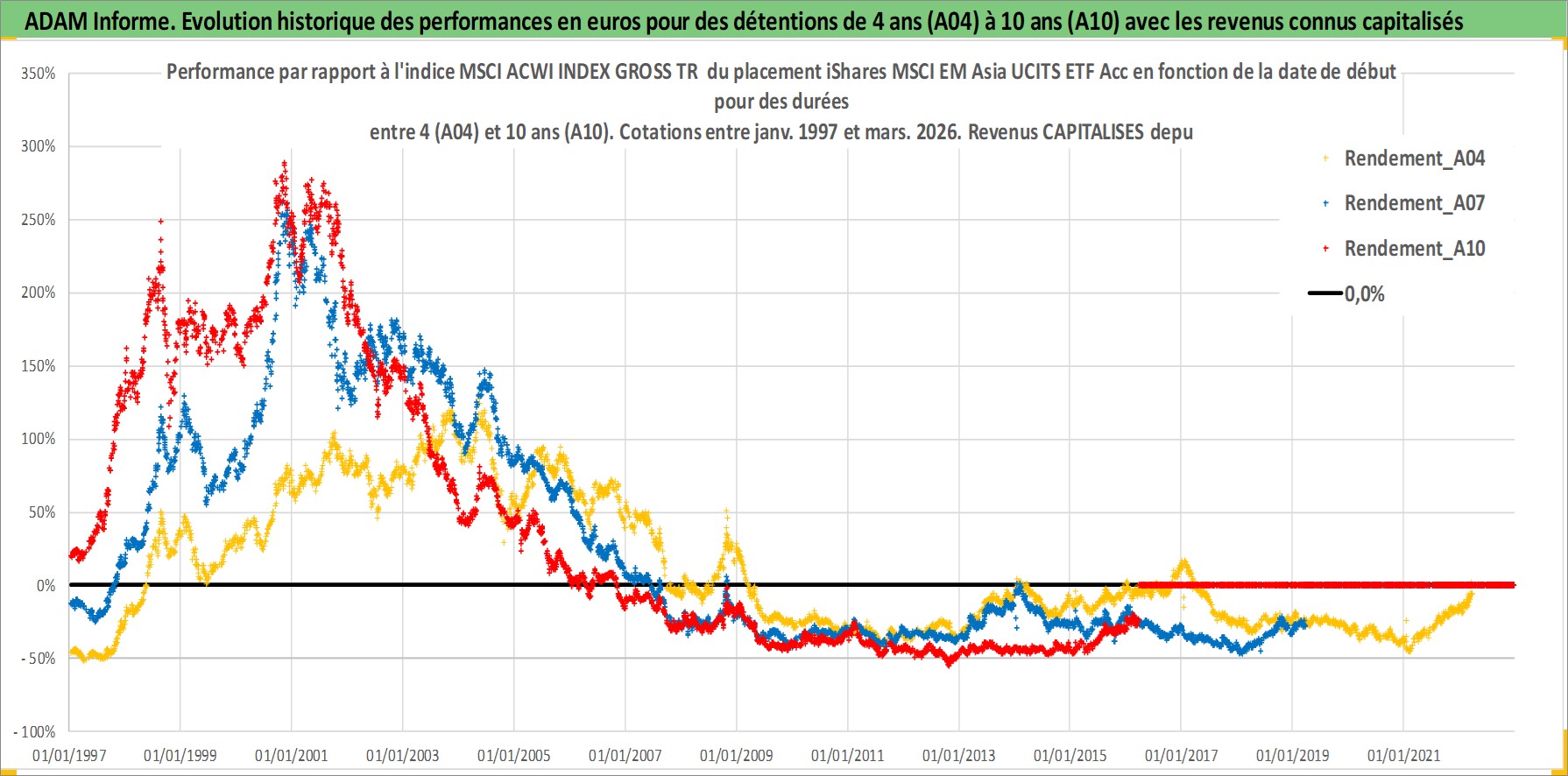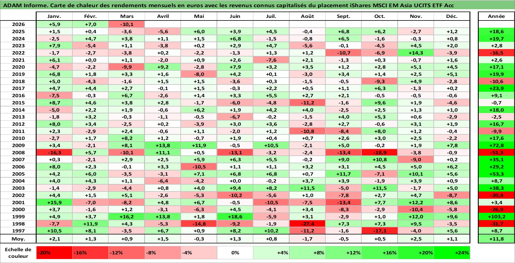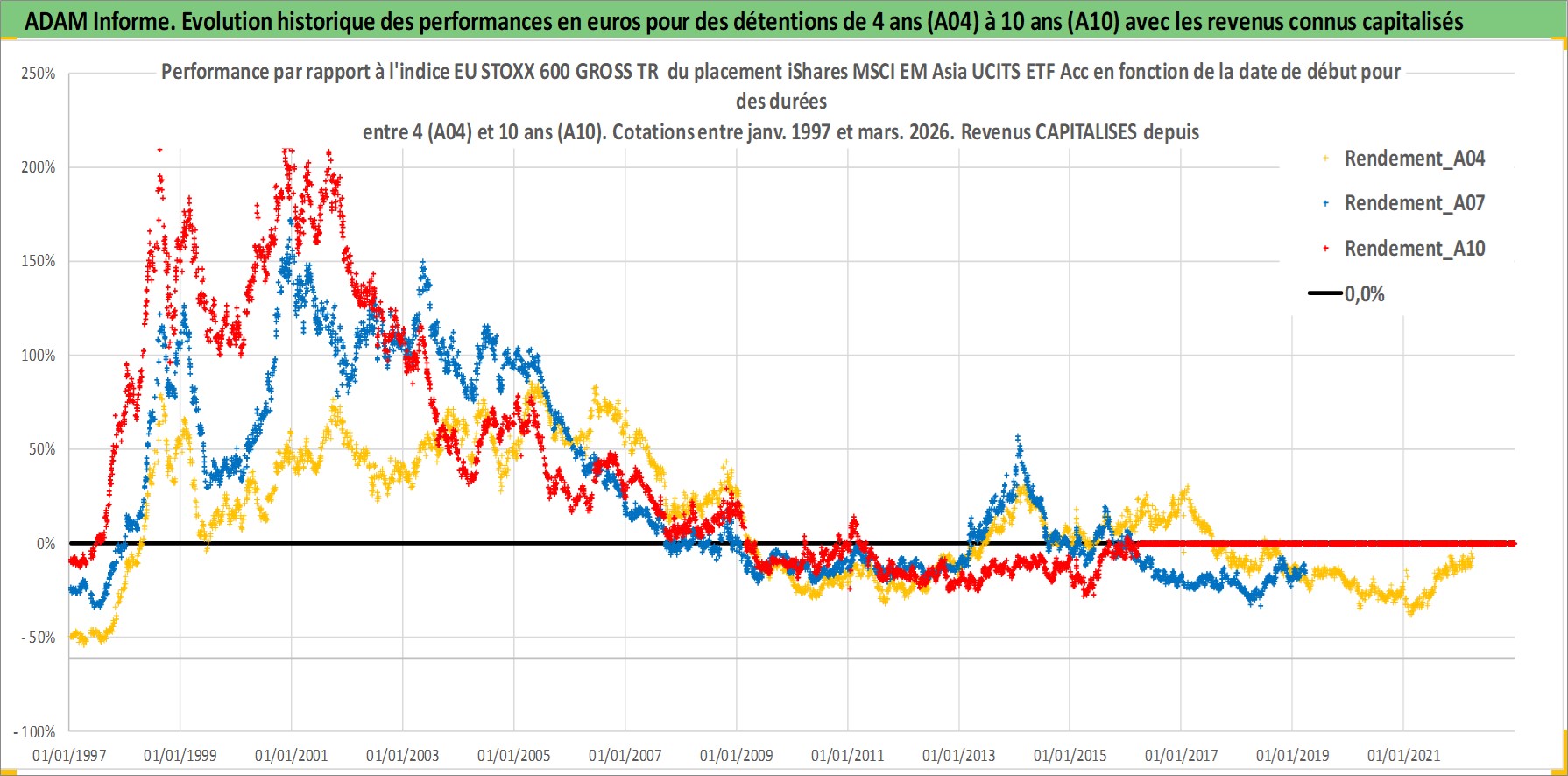 Site dédié aux investisseursPage dédiée sur site financeAnalyse des valorisations hebdomadaires du fonds iShares MSCI EM Asia UCITS ETF Acc. Cet actif est cote en USD. Les valorisations sont en contrevaleur EURO et couvrent les semaines 1997W01 a 2026W13. Les revenus de cet actif financier sont pris en compte depuis la semaine 1997W01. La note ESG de cet actif n'est pas connue.