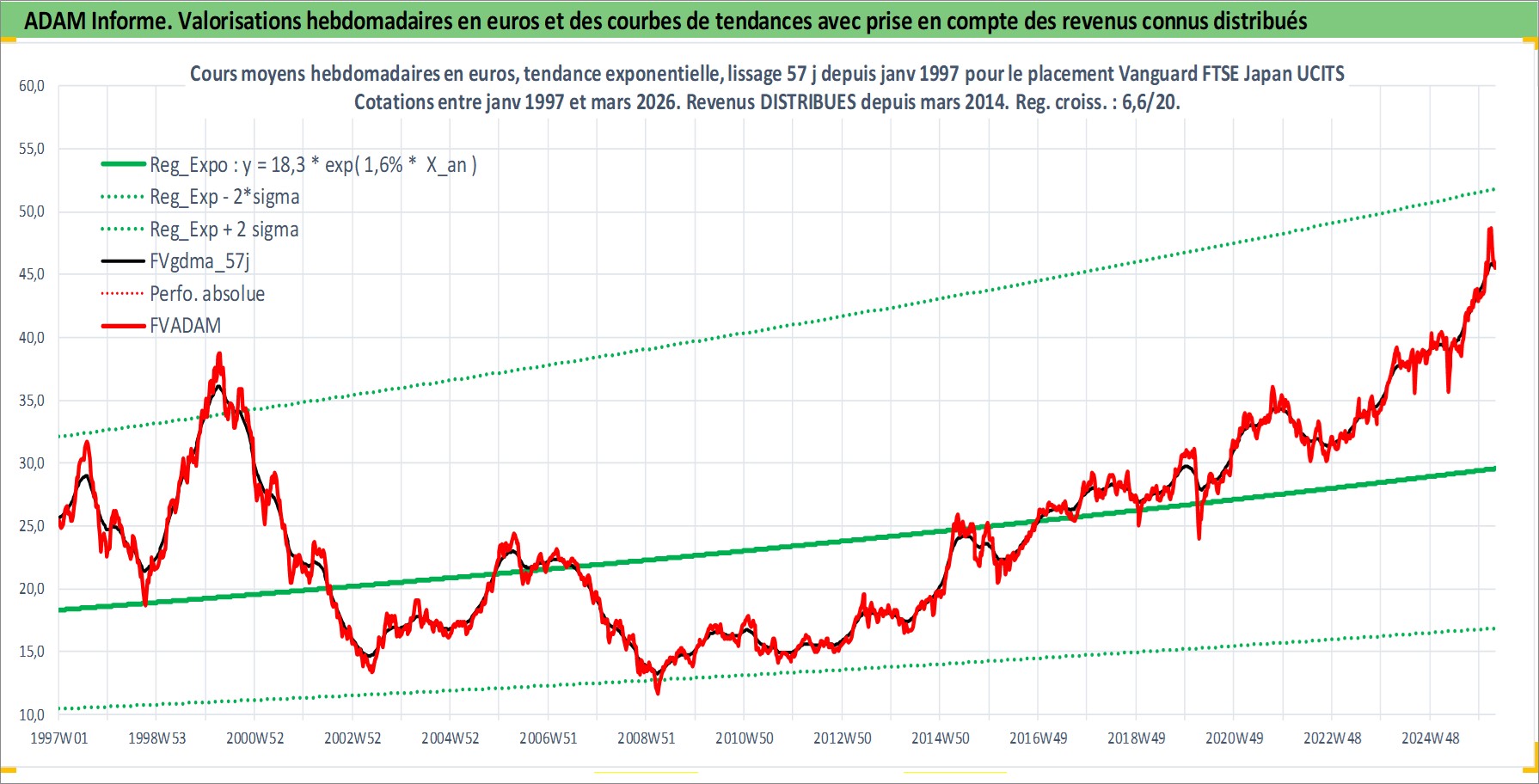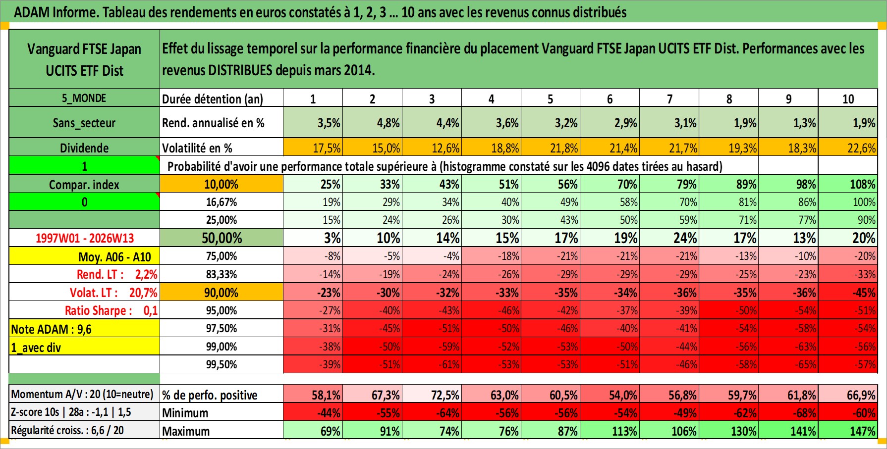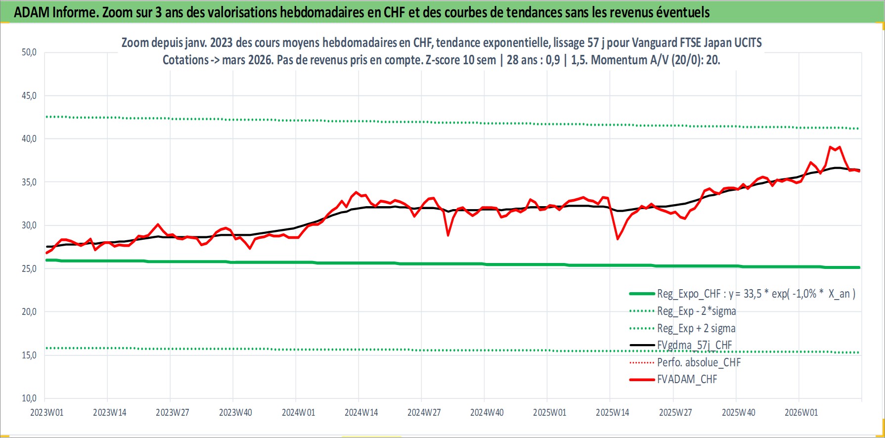 Site dédié aux investisseursPage dédiée sur site financeAnalyse des valorisations hebdomadaires du fonds Vanguard FTSE Japan UCITS ETF Dist. Cet actif est cote en CHF. Les valorisations sont en contrevaleur EURO et couvrent les semaines 1997W01 a 2026W13. Les revenus de cet actif financier sont pris en compte depuis la semaine 2014W12. La note ESG de cet actif n'est pas connue.