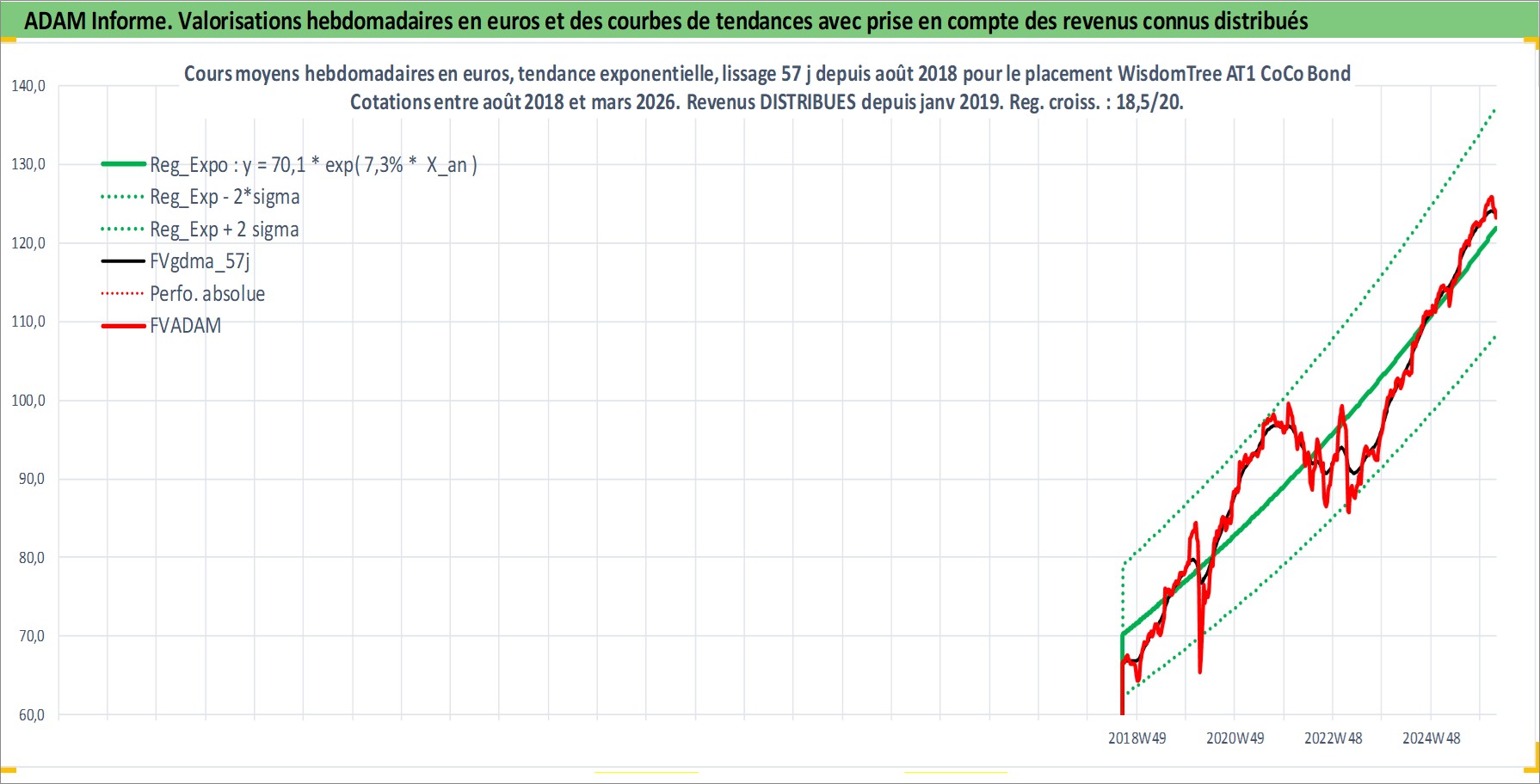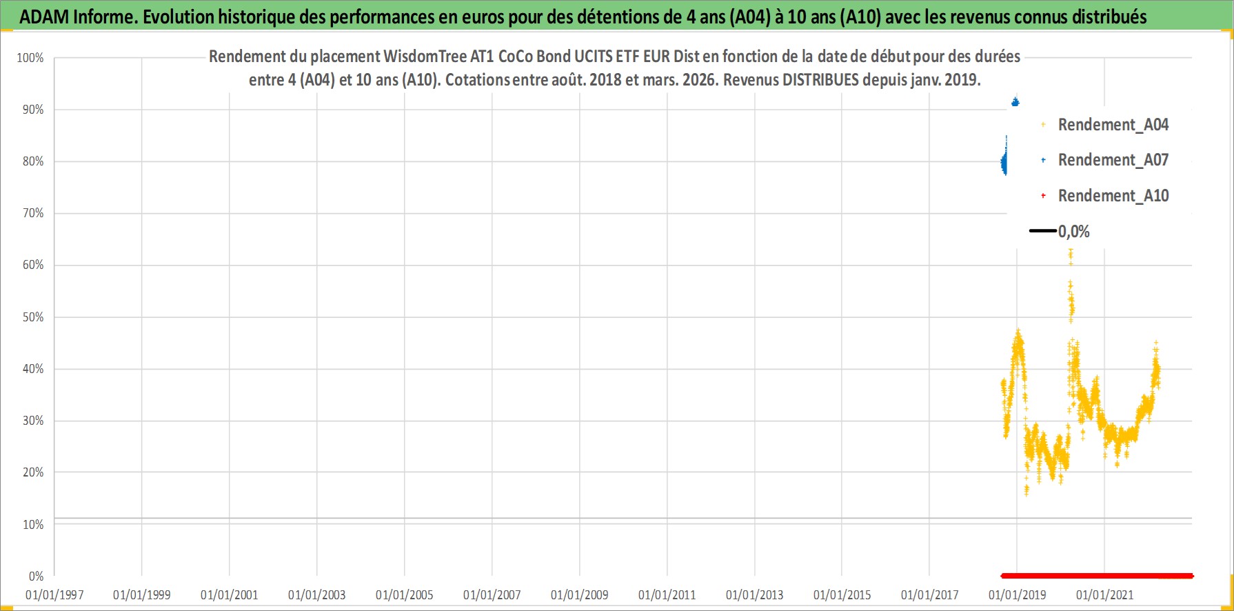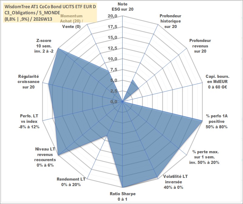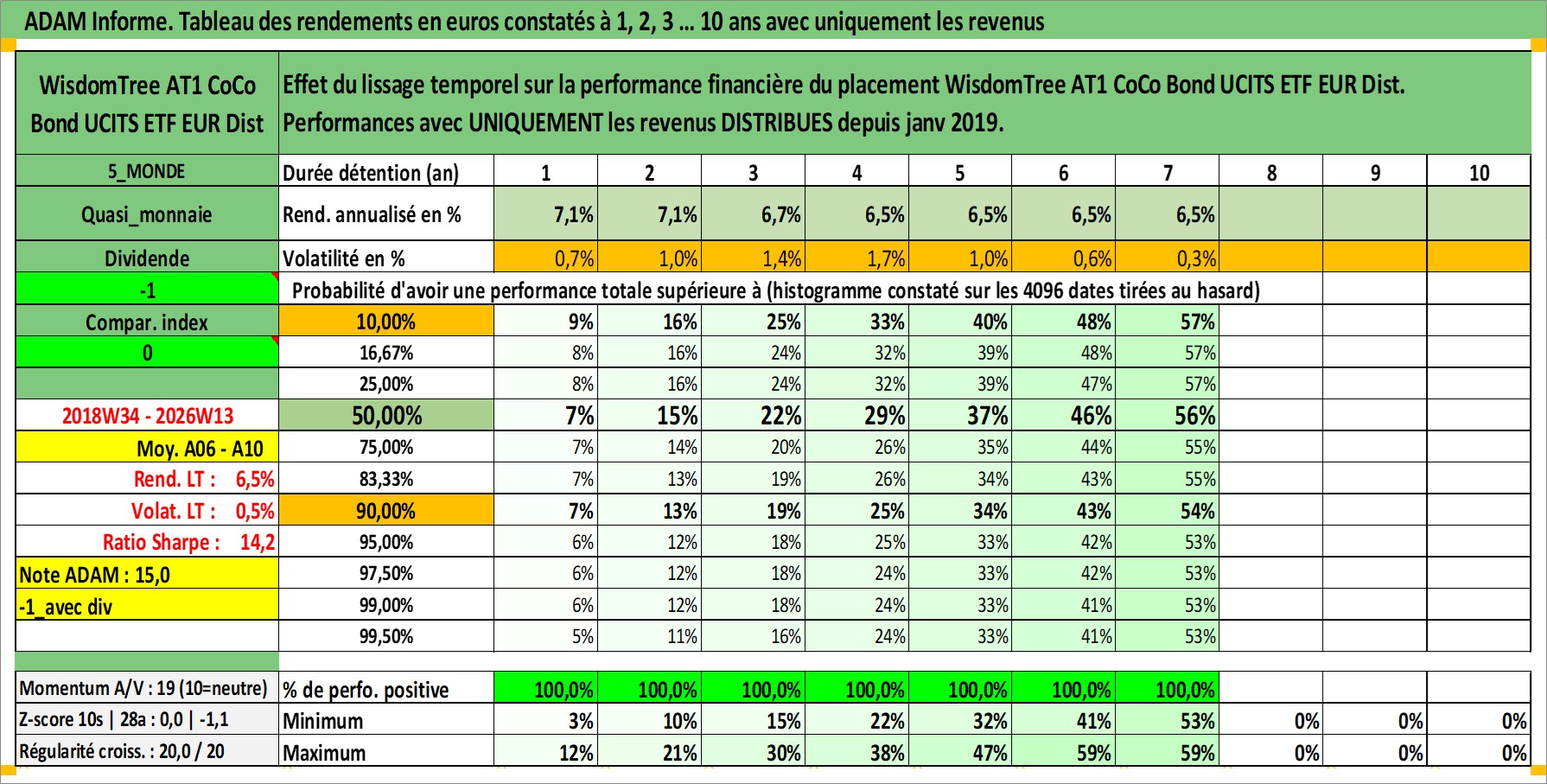 Site dédié aux investisseursPage dédiée sur site financeAnalyse des valorisations hebdomadaires du fonds WisdomTree AT1 CoCo Bond UCITS ETF EUR Dist. Cet actif est cote en EUR. Les valorisations couvrent les semaines 2018W34 a 2026W13. Les revenus de cet actif financier sont pris en compte depuis la semaine 2019W01. La note ESG de cet actif n'est pas connue.