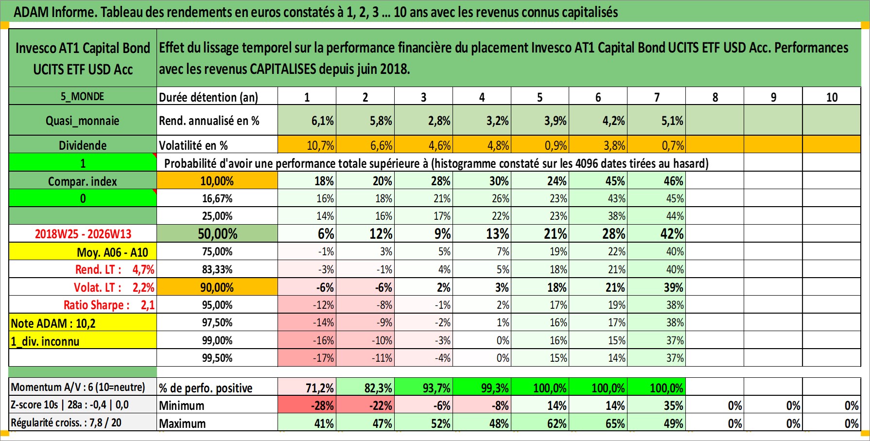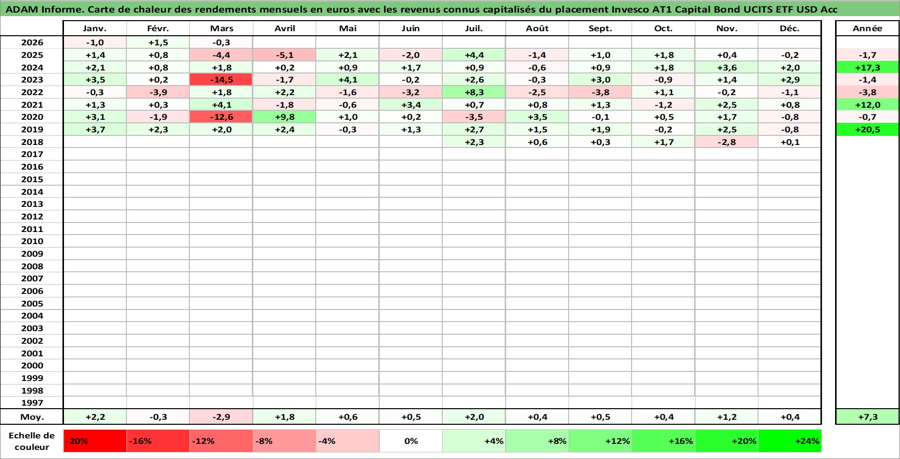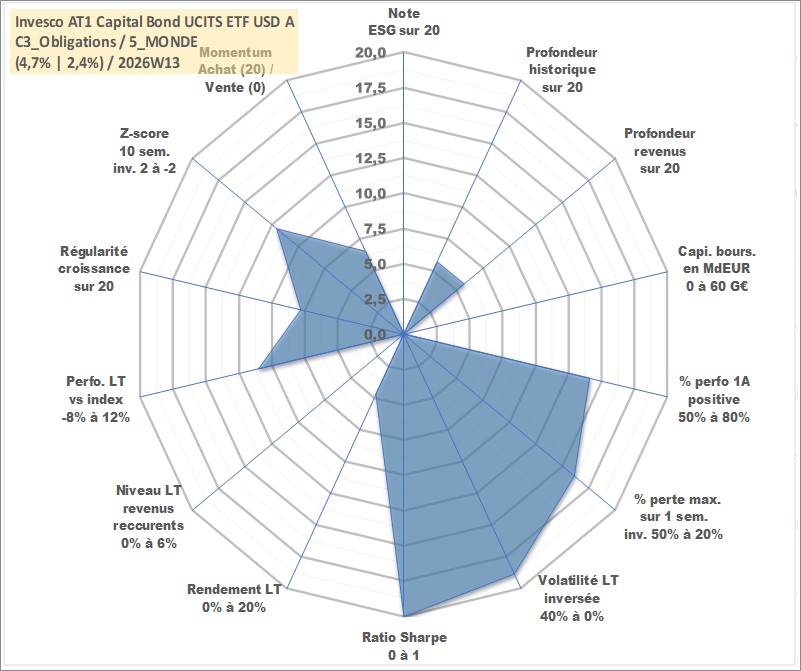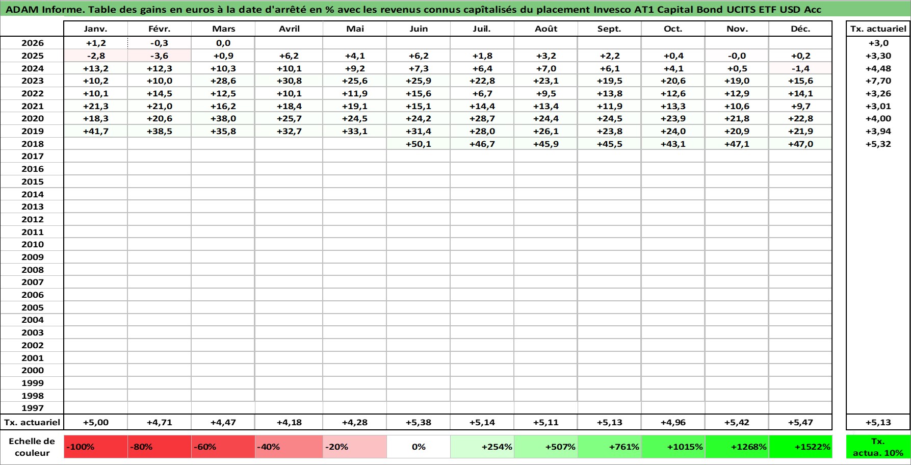 Site dédié aux investisseursPage dédiée sur site financeAnalyse des valorisations hebdomadaires du fonds Invesco AT1 Capital Bond UCITS ETF USD Acc. Cet actif est cote en USD. Les valorisations sont en contrevaleur EURO et couvrent les semaines 2018W25 a 2026W13. Les revenus de cet actif financier sont pris en compte depuis la semaine 2018W25. La note ESG de cet actif n'est pas connue.