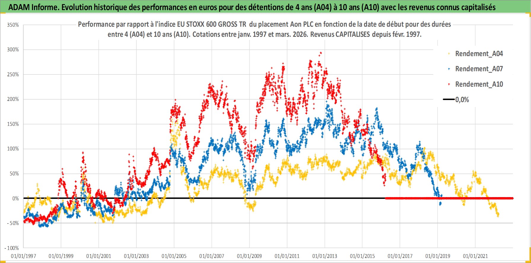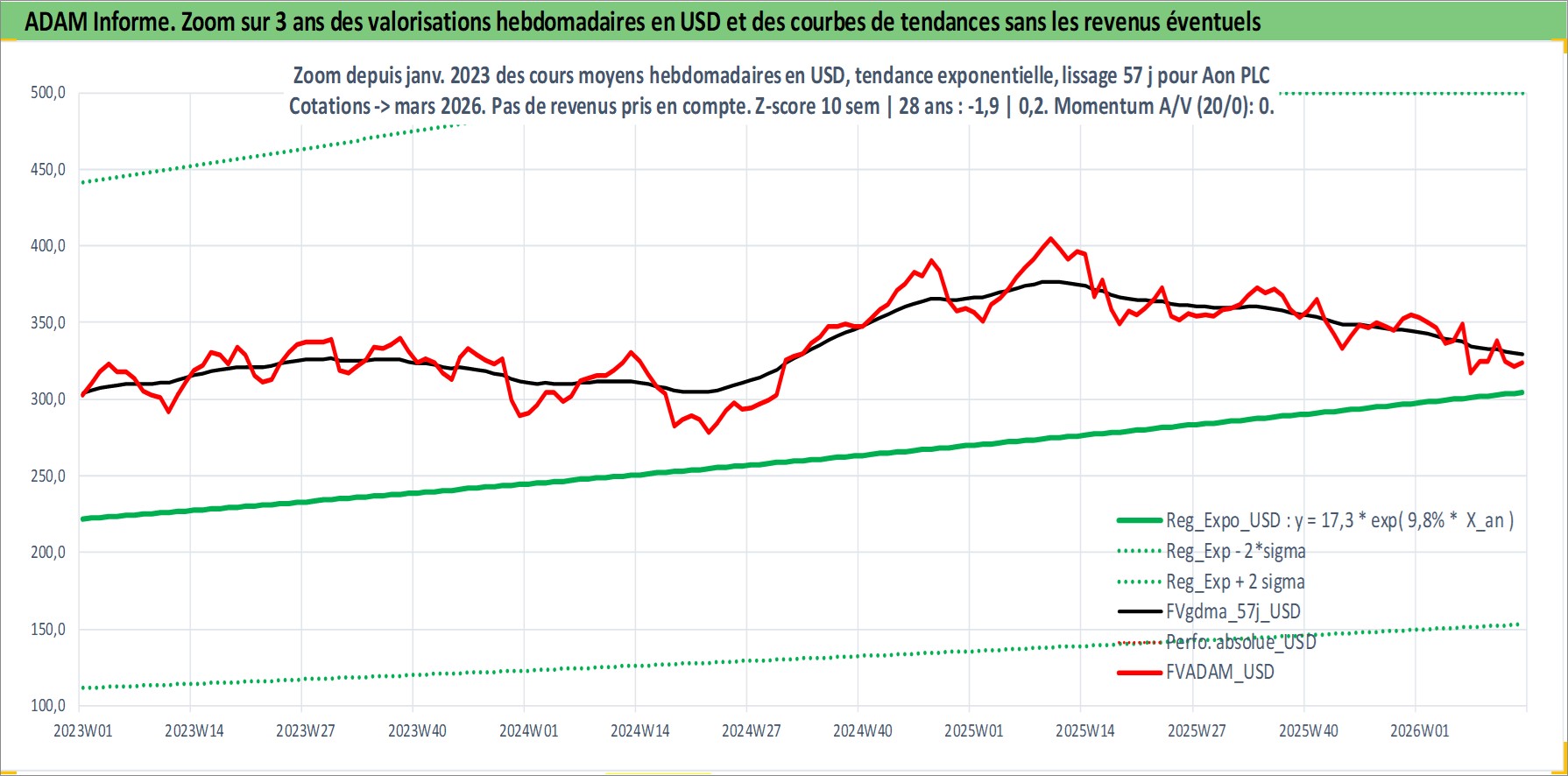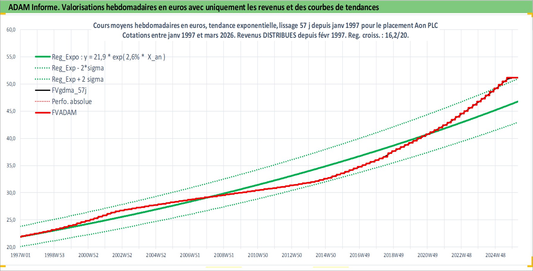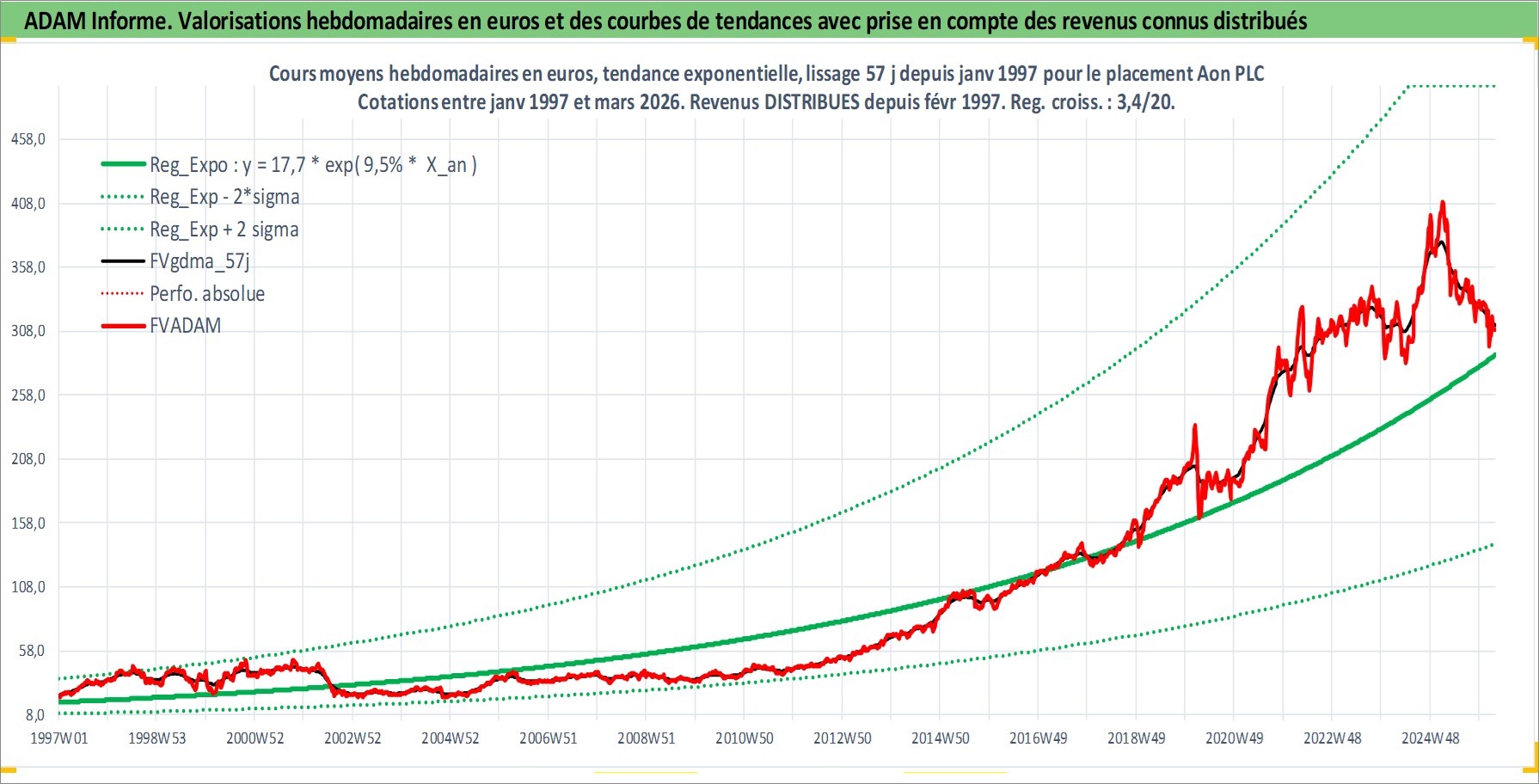 Site dédié aux investisseursPage dédiée sur site financeAnalyse des valorisations hebdomadaires de l'action Aon PLC. Cet actif est cote en USD. Les valorisations sont en contrevaleur EURO et couvrent les semaines 1997W01 a 2026W13. Les revenus de cet actif financier sont pris en compte depuis la semaine 1997W06. La note ESG de cet actif n'est pas connue.