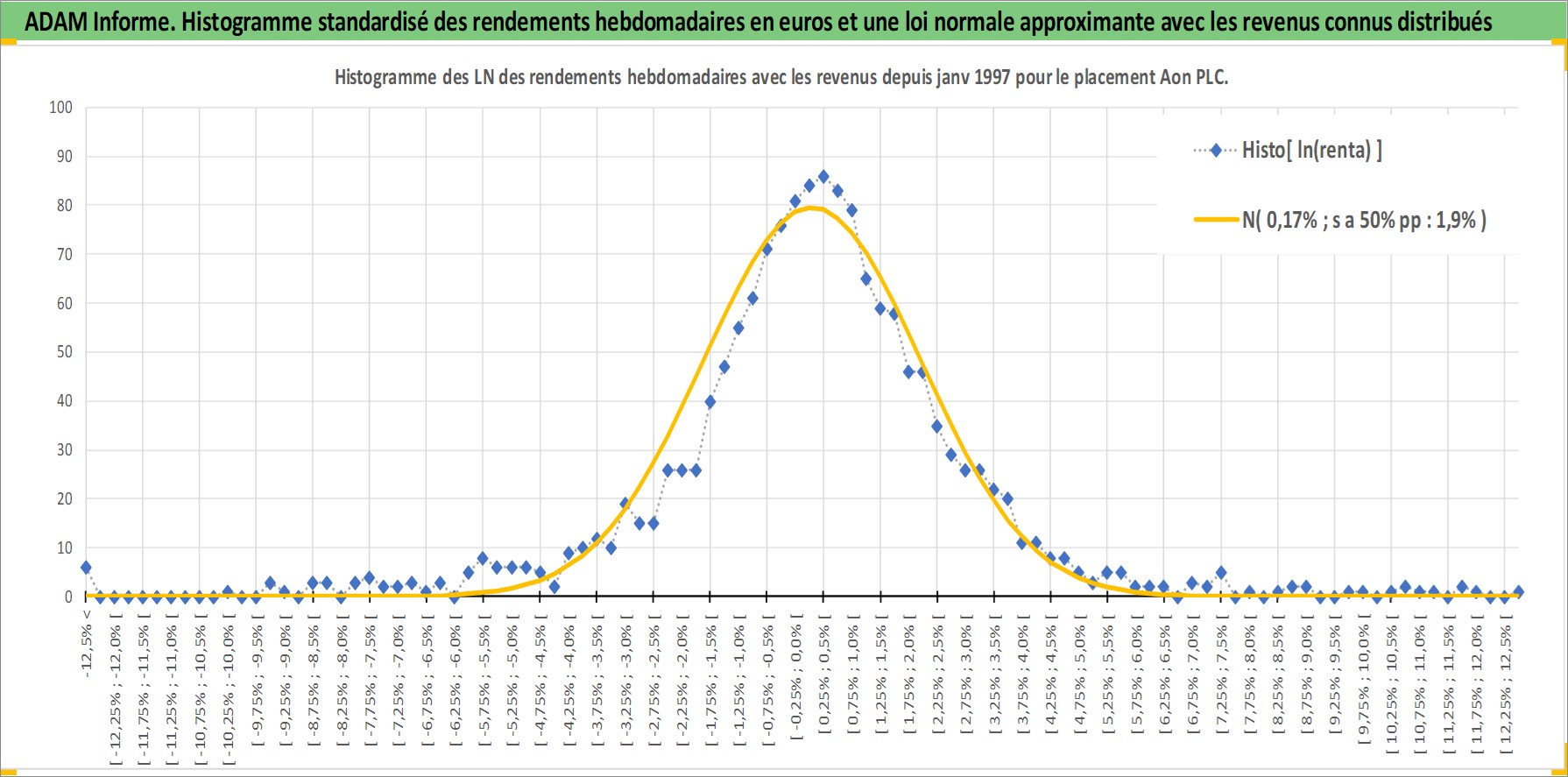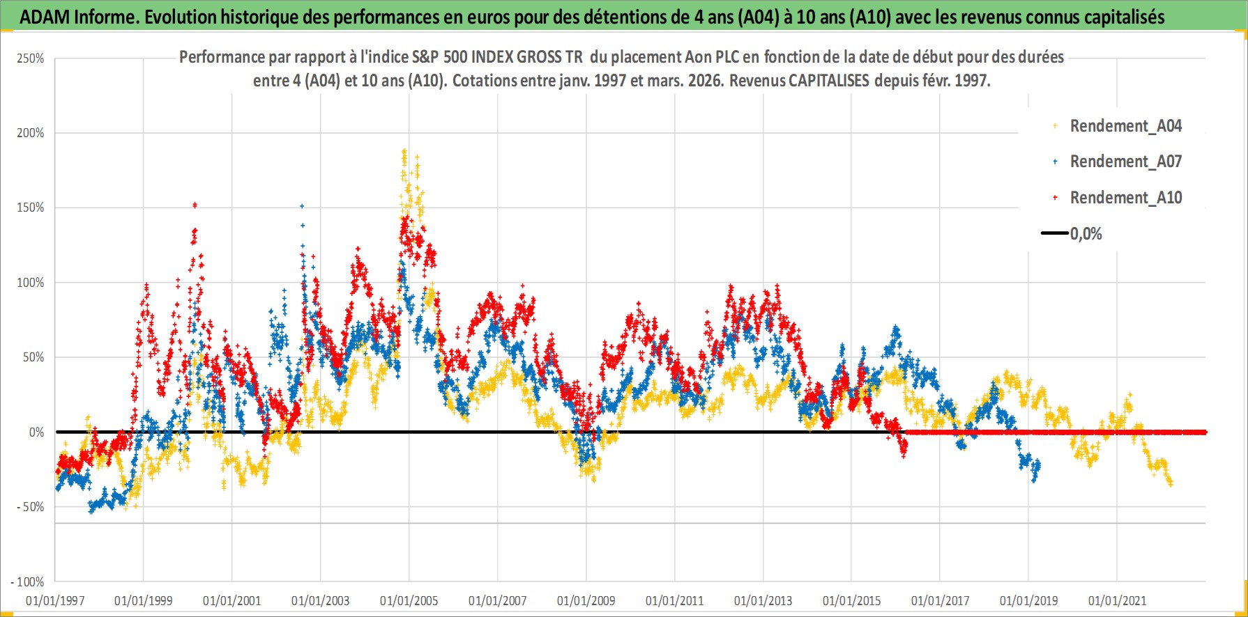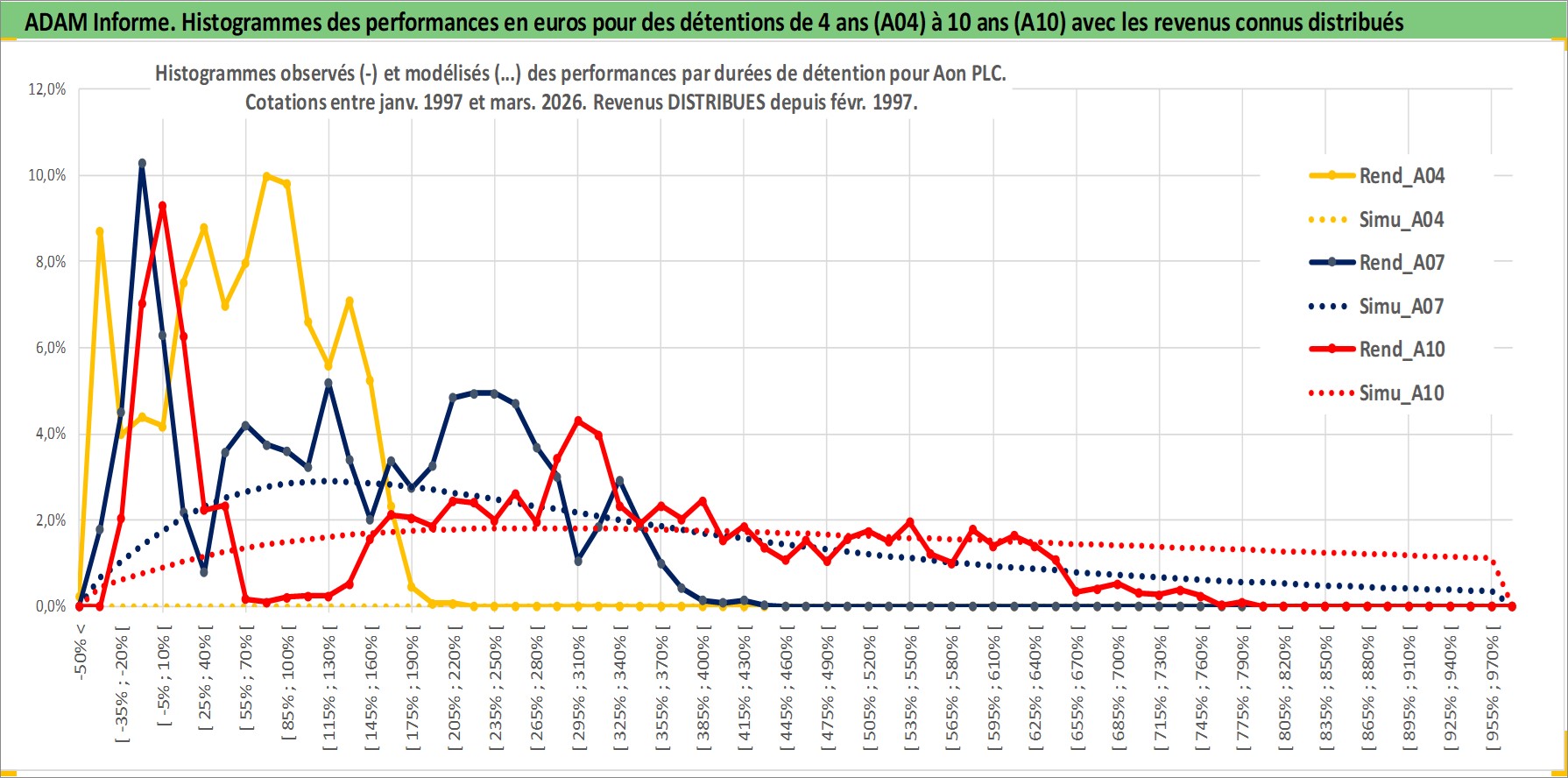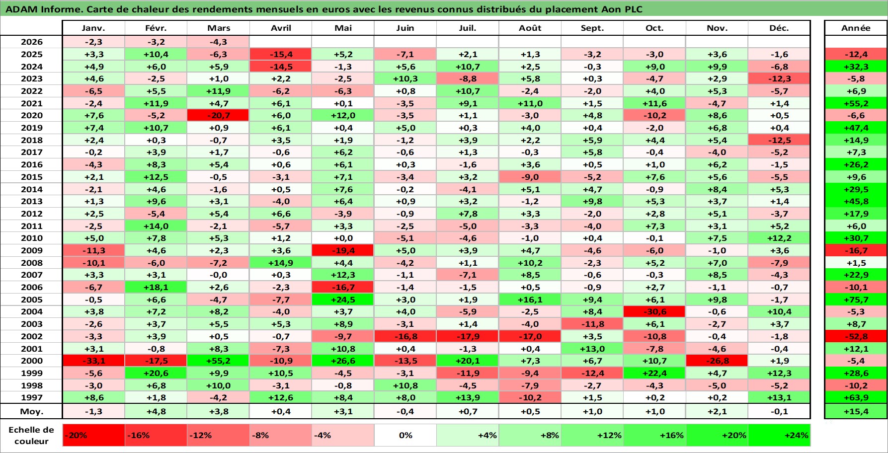 Site dédié aux investisseursPage dédiée sur site financeAnalyse des valorisations hebdomadaires de l'action Aon PLC. Cet actif est cote en USD. Les valorisations sont en contrevaleur EURO et couvrent les semaines 1997W01 a 2026W13. Les revenus de cet actif financier sont pris en compte depuis la semaine 1997W06. La note ESG de cet actif n'est pas connue.