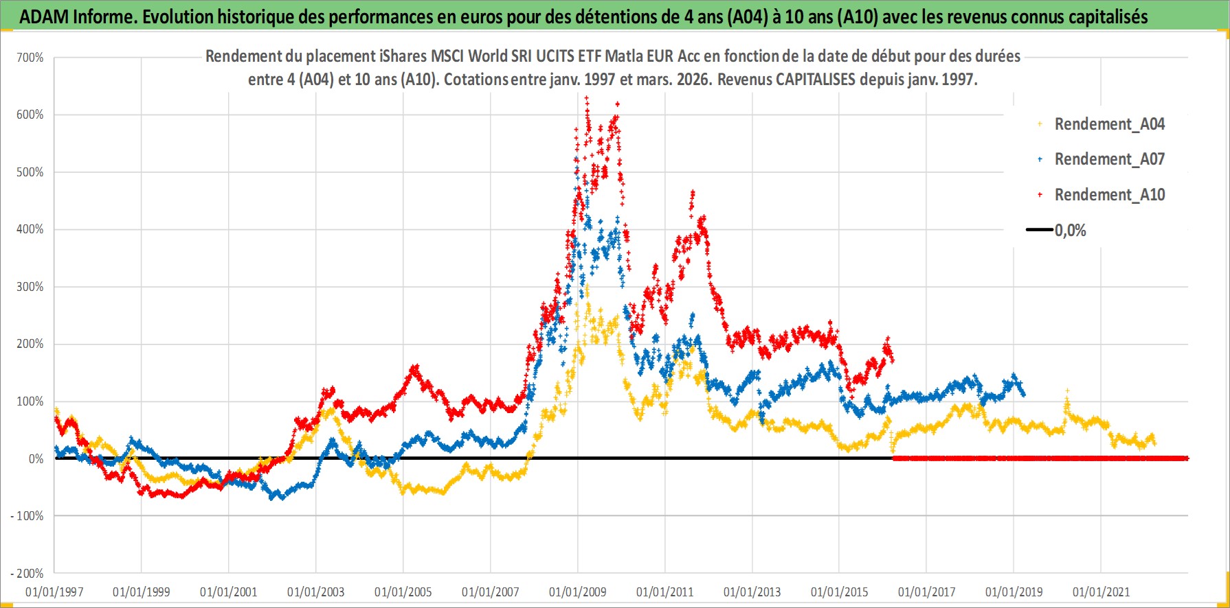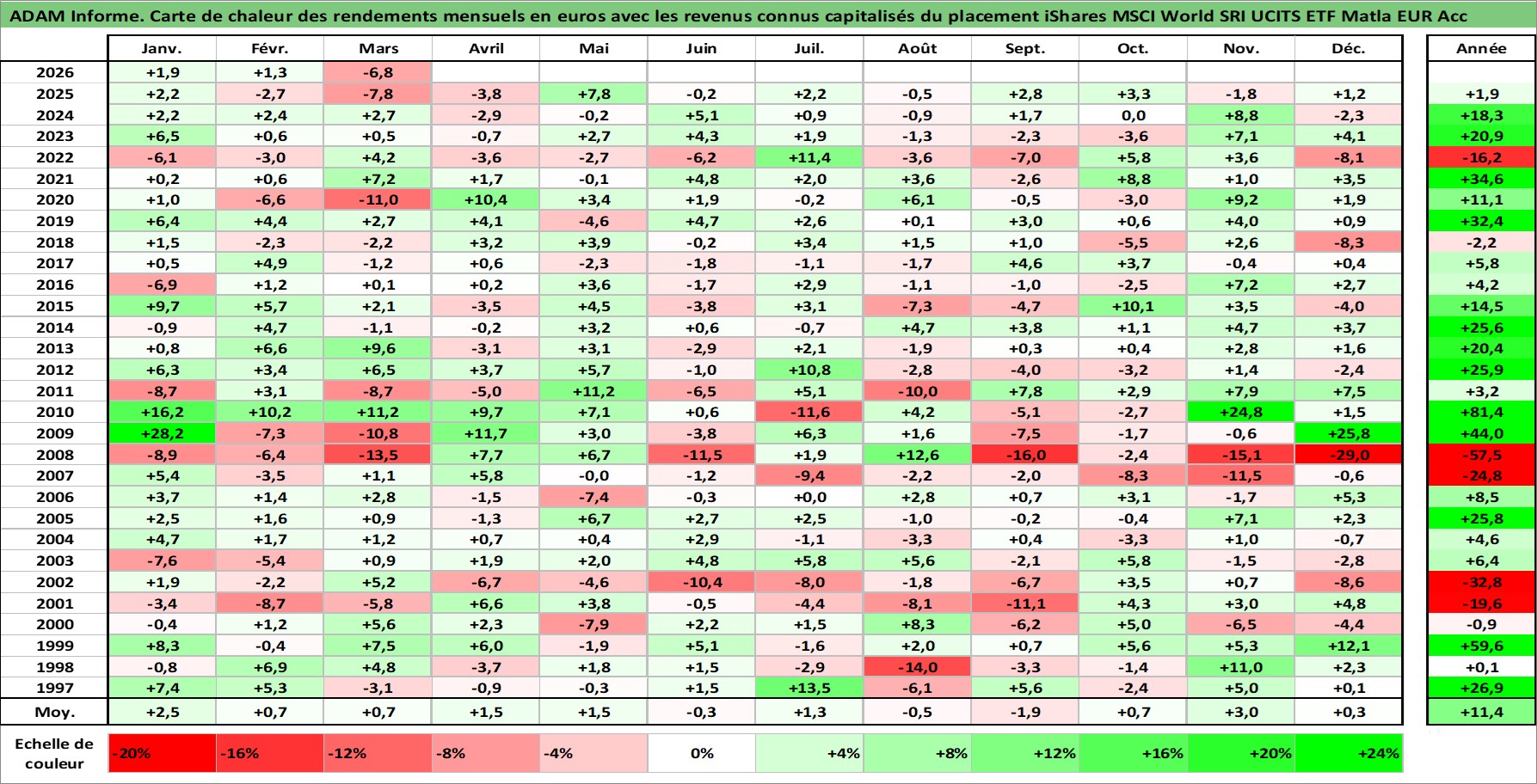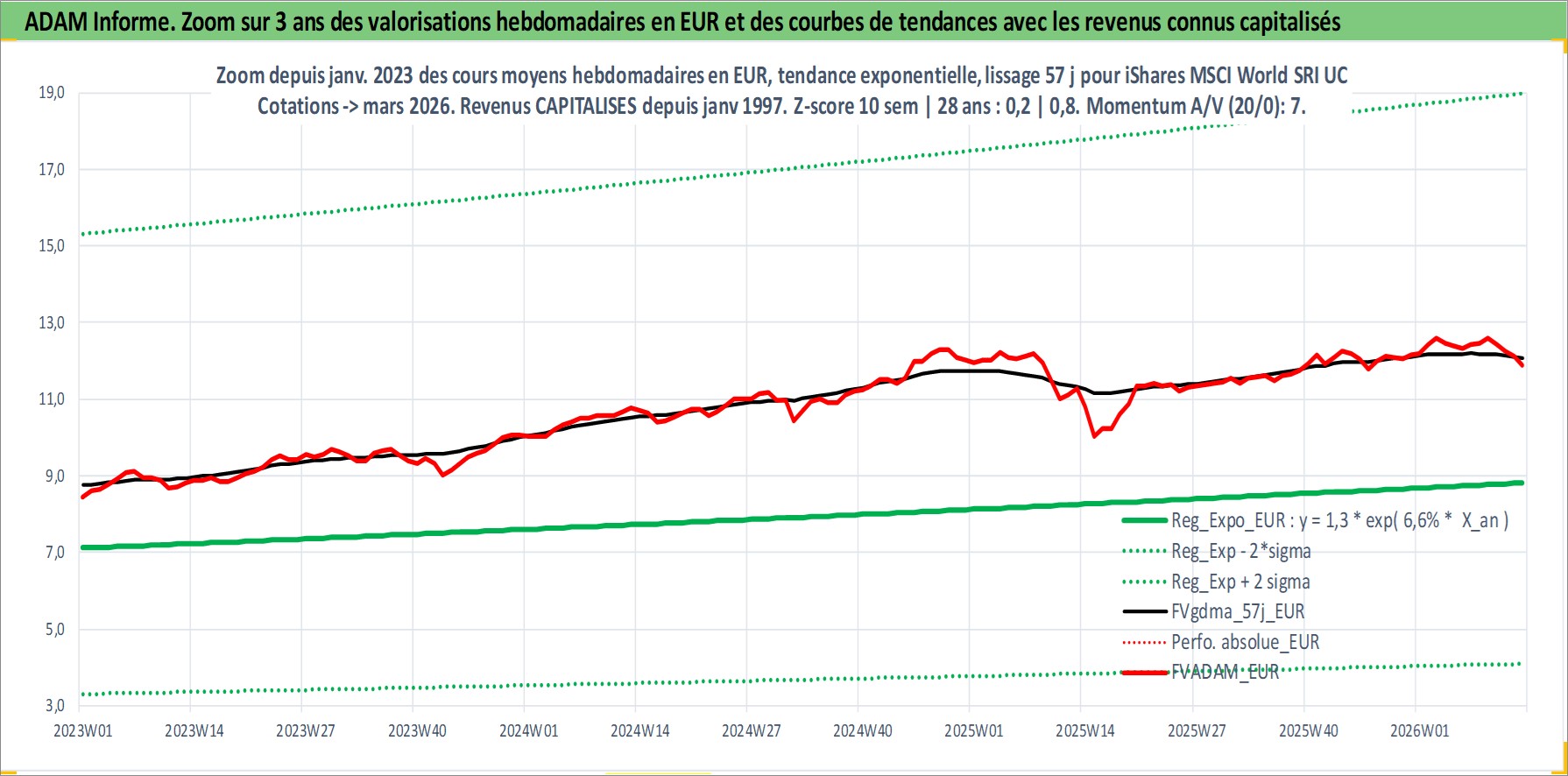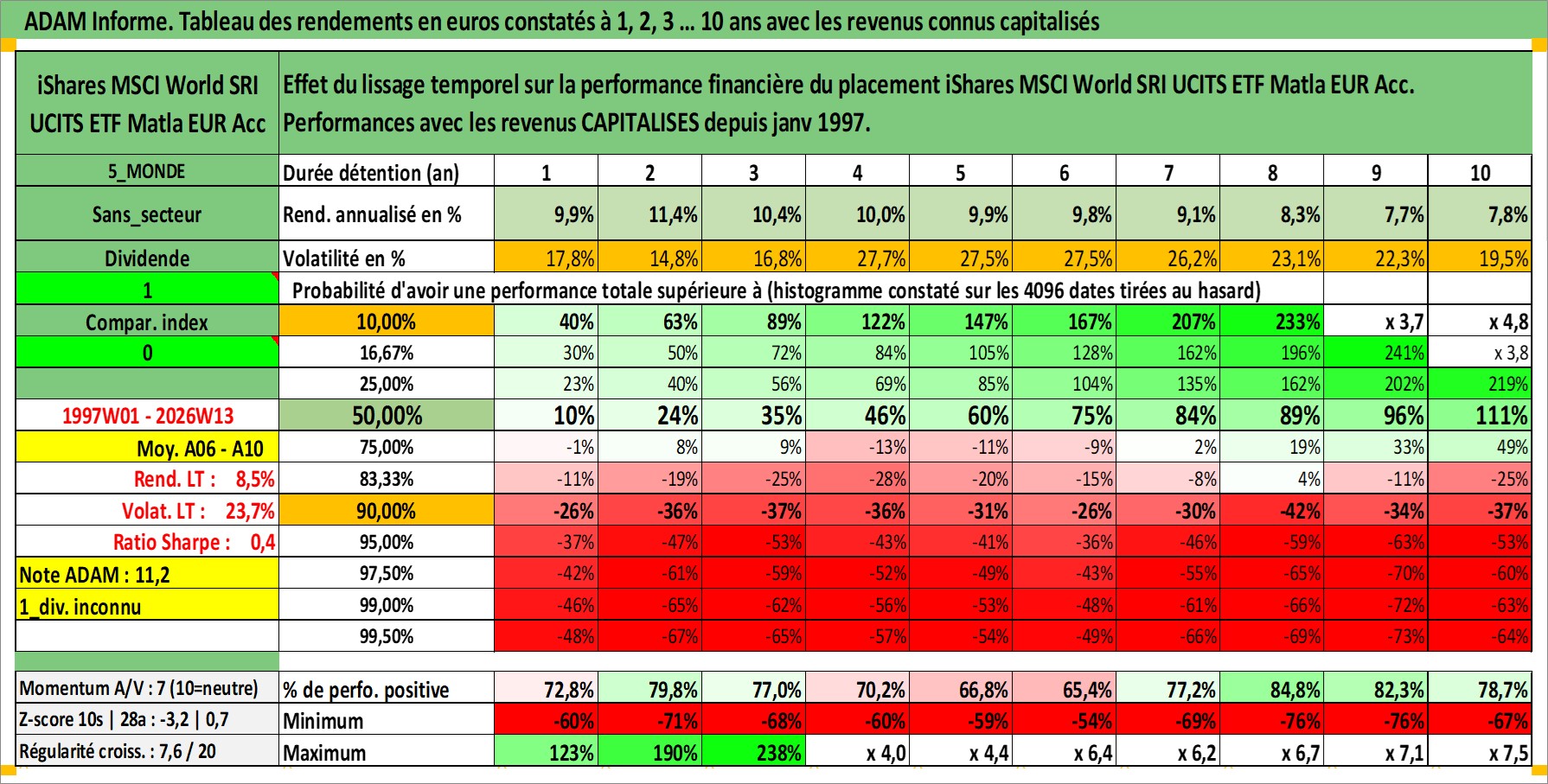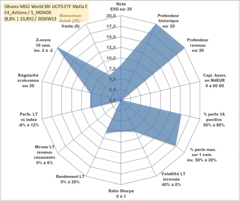 Site dédié aux investisseursPage dédiée sur site financeAnalyse des valorisations hebdomadaires du fonds iShares MSCI World SRI UCITS ETF Matla EUR Acc. Cet actif est cote en EUR. Les valorisations couvrent les semaines 1997W01 a 2026W13. Les revenus de cet actif financier sont pris en compte depuis la semaine 1997W01. La note globale ESG de cet actif est estimee a 8.3 (apres rebasage entre 0 et 20).
