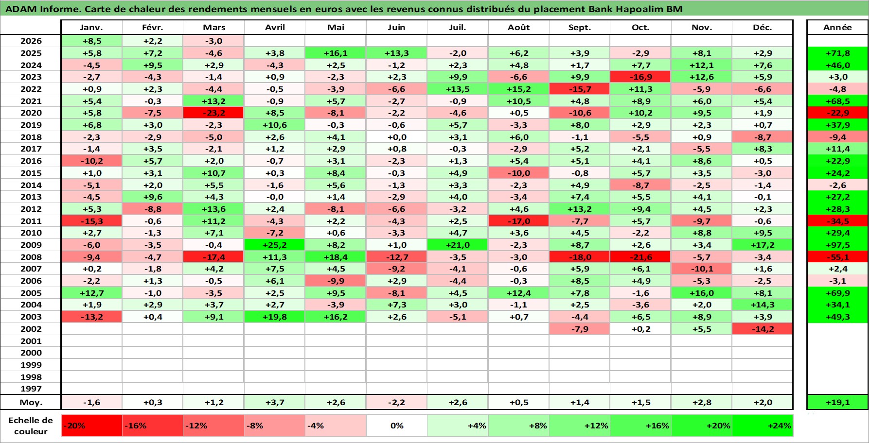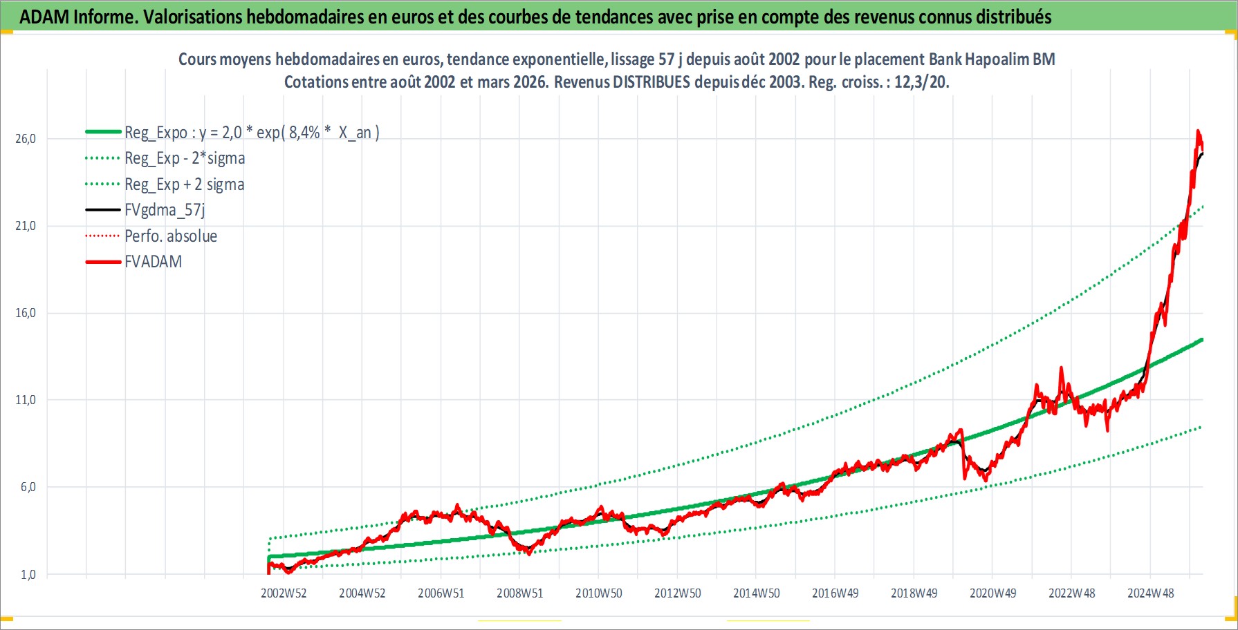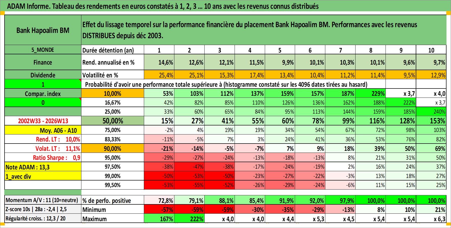 Site dédié aux investisseursPage dédiée sur site financeAnalyse des valorisations hebdomadaires de l'action Bank Hapoalim BM. Cet actif est cote en ILA. Les valorisations sont en contrevaleur EURO et couvrent les semaines 2002W33 a 2026W13. Les revenus de cet actif financier sont pris en compte depuis la semaine 2003W50. La note globale ESG de cet actif est estimee a 13.0 (apres rebasage entre 0 et 20).