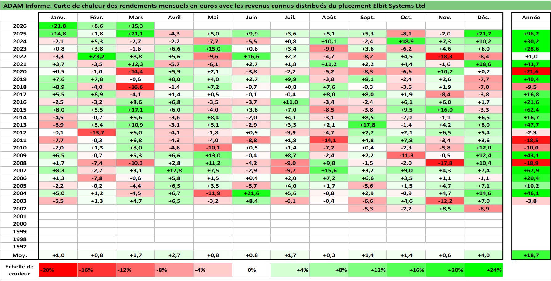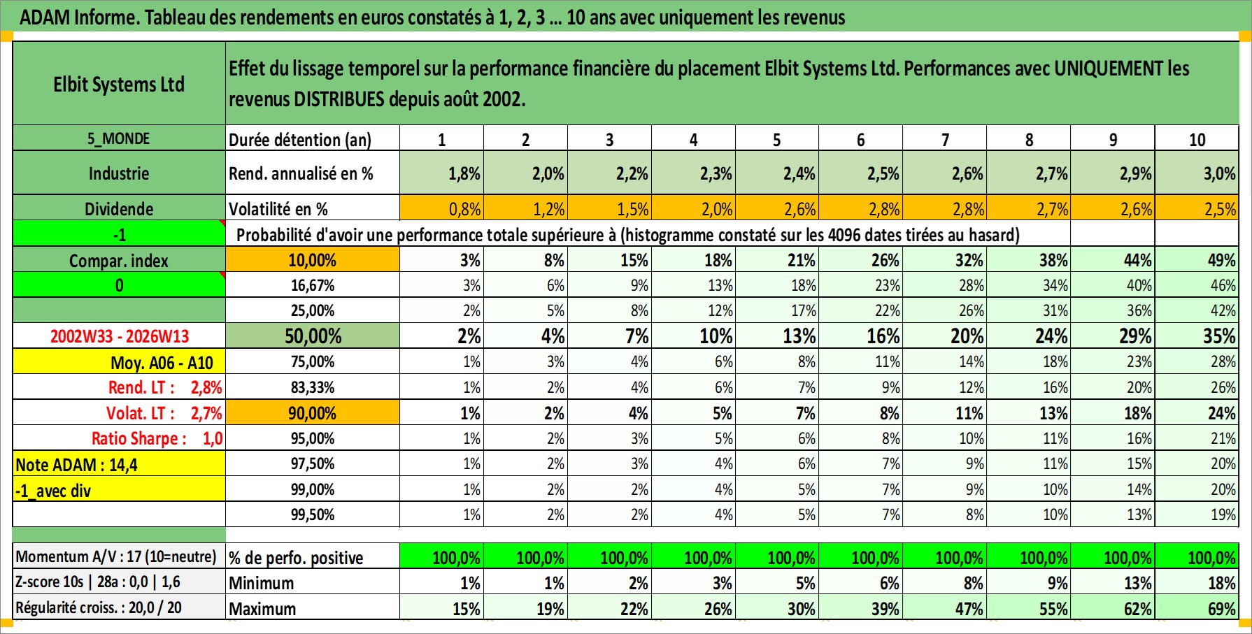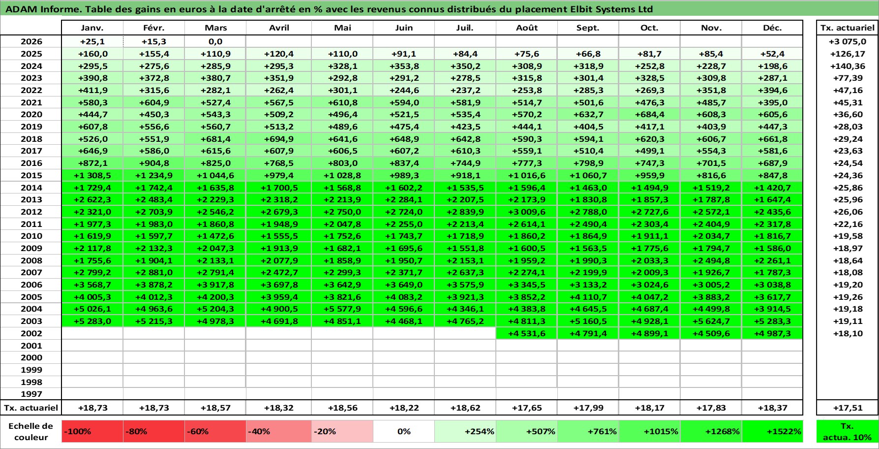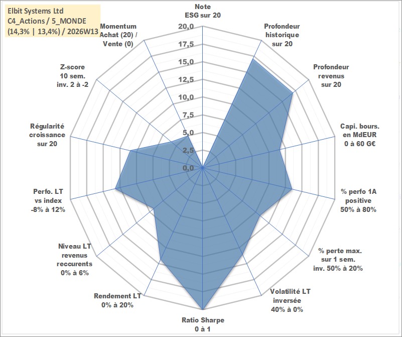 Site dédié aux investisseursPage dédiée sur site financeAnalyse des valorisations hebdomadaires de l'action Elbit Systems Ltd. Cet actif est cote en ILA. Les valorisations sont en contrevaleur EURO et couvrent les semaines 2002W33 a 2026W13. Les revenus de cet actif financier sont pris en compte depuis la semaine 2002W35. La note ESG de cet actif n'est pas connue.