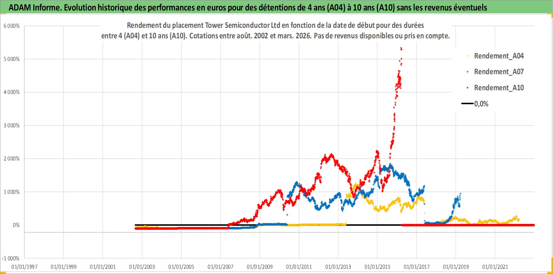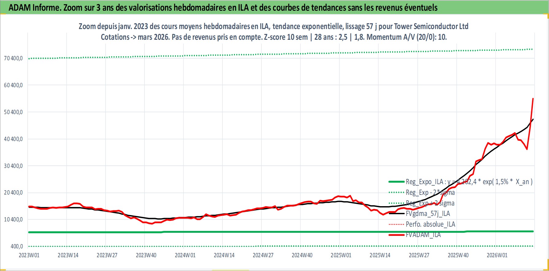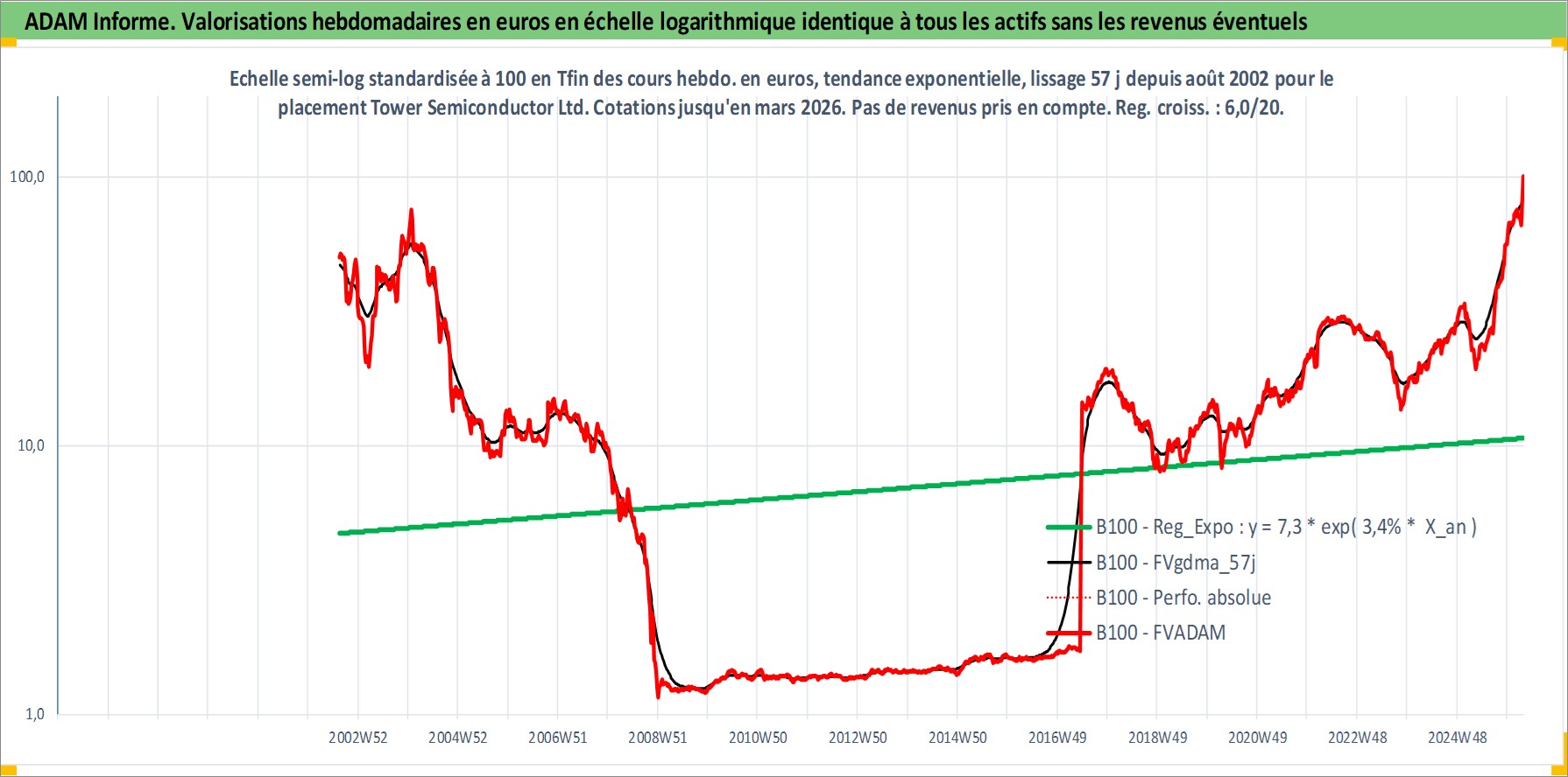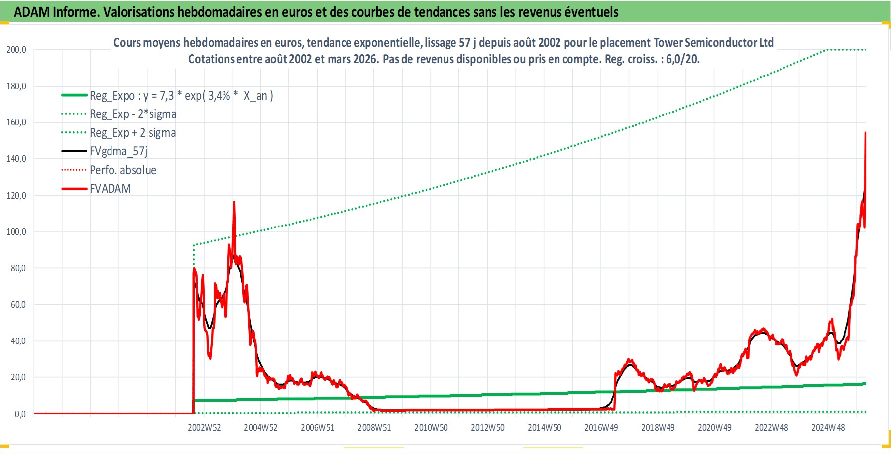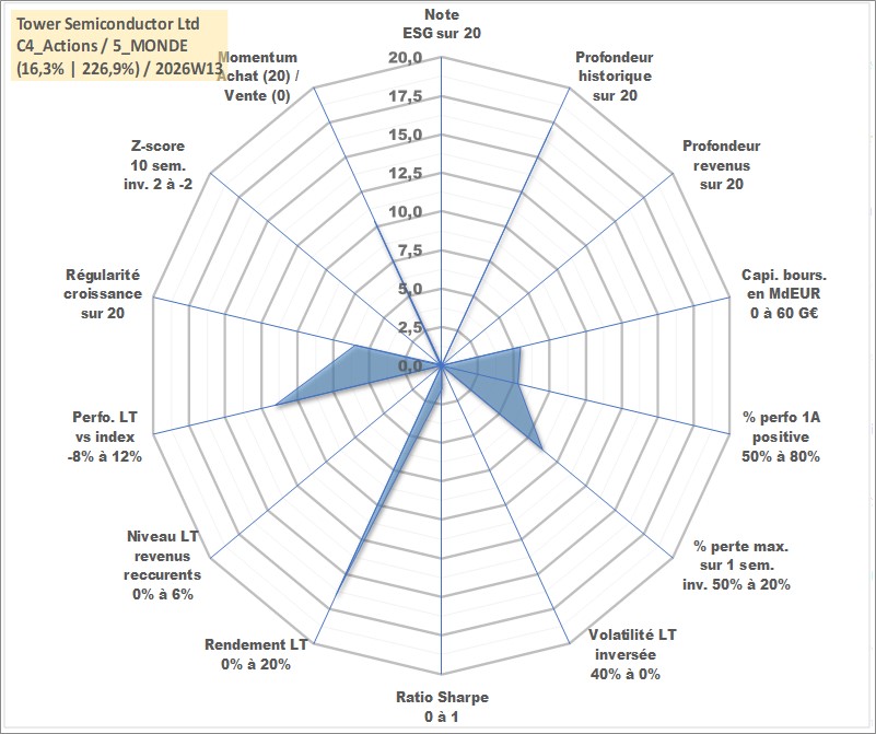 Site dédié aux investisseursPage dédiée sur site financeAnalyse des valorisations hebdomadaires de l'action Tower Semiconductor Ltd. Cet actif est cote en ILA. Les valorisations sont en contrevaleur EURO et couvrent les semaines 2002W33 a 2026W13. Les revenus de cet actif financier ne sont pas connus car non existants ou non disponibles sur le site Yahoo Finance. La note ESG de cet actif n'est pas connue.