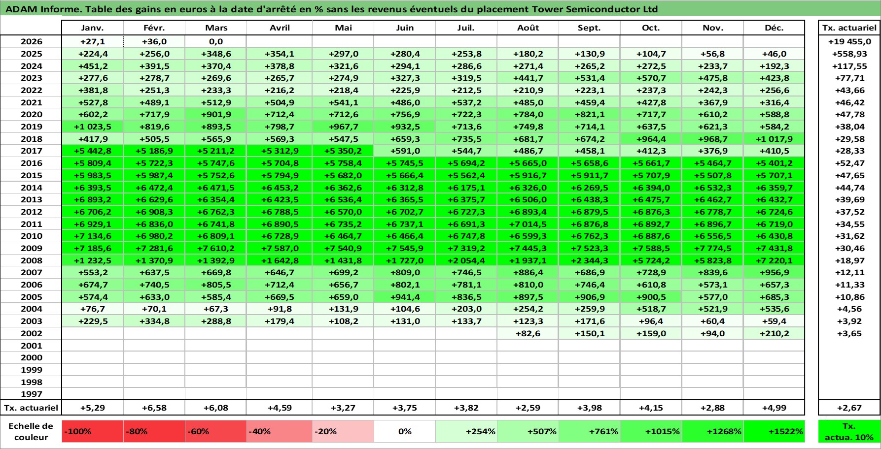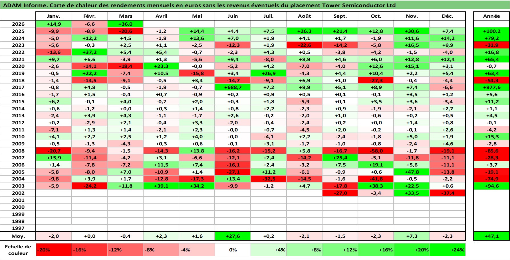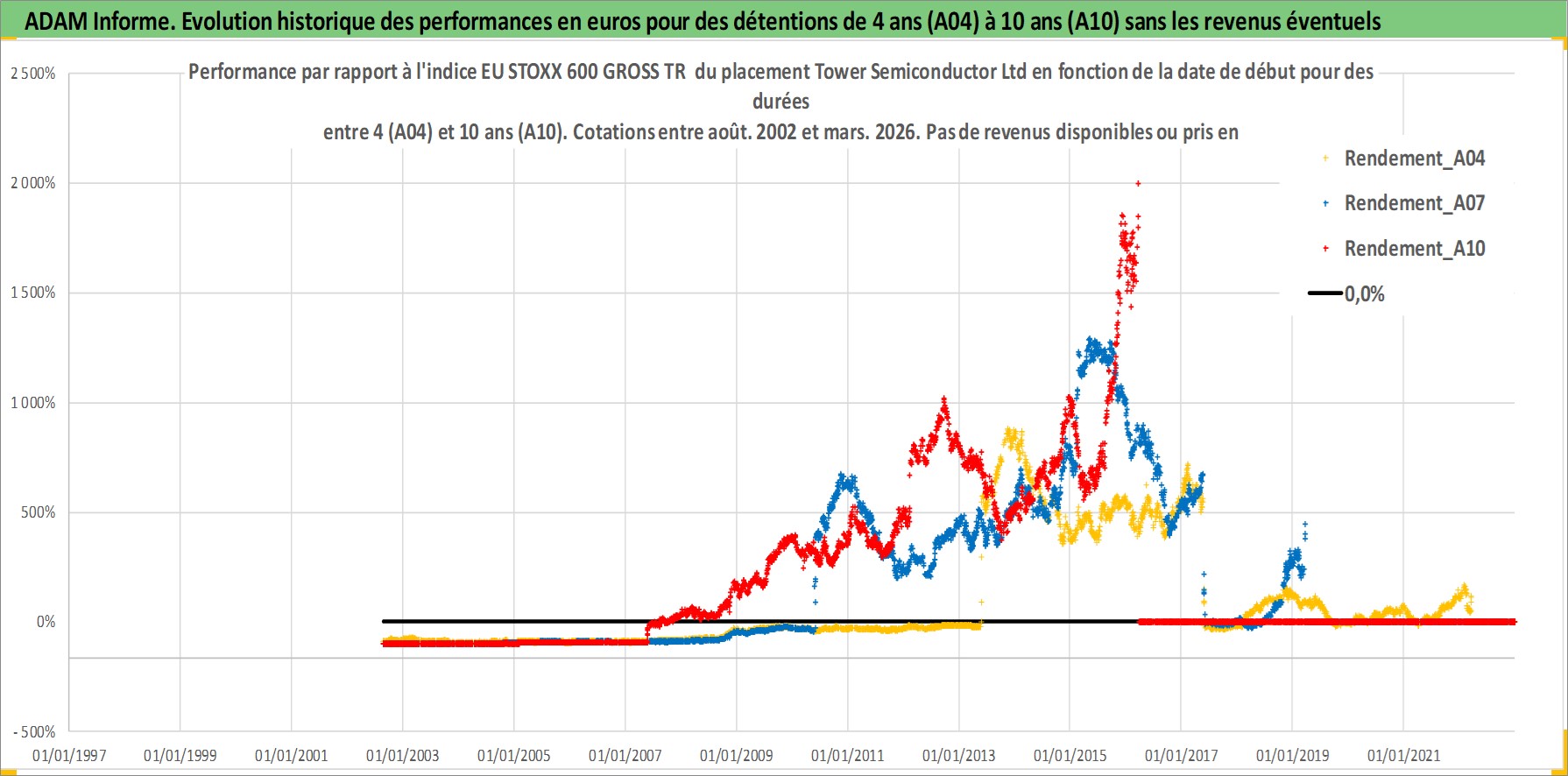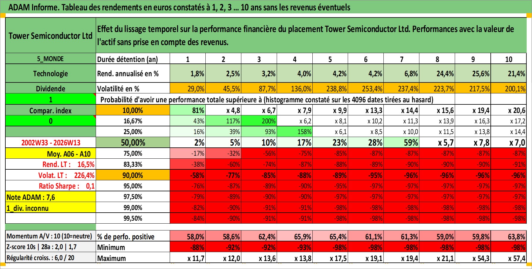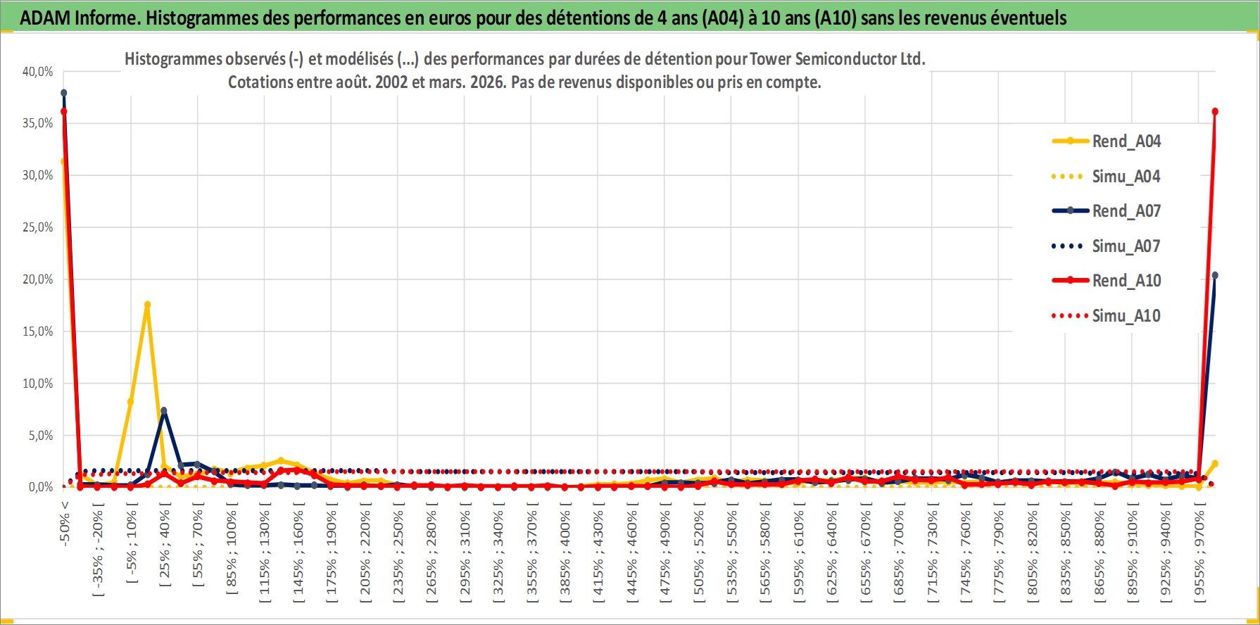 Site dédié aux investisseursPage dédiée sur site financeAnalyse des valorisations hebdomadaires de l'action Tower Semiconductor Ltd. Cet actif est cote en ILA. Les valorisations sont en contrevaleur EURO et couvrent les semaines 2002W33 a 2026W13. Les revenus de cet actif financier ne sont pas connus car non existants ou non disponibles sur le site Yahoo Finance. La note ESG de cet actif n'est pas connue.