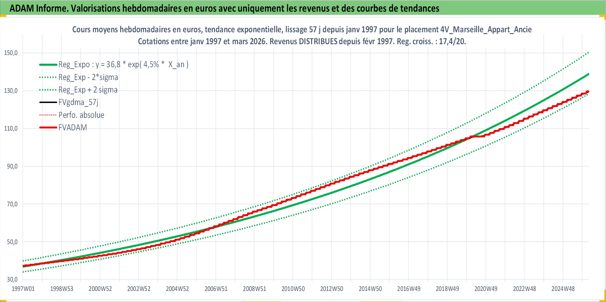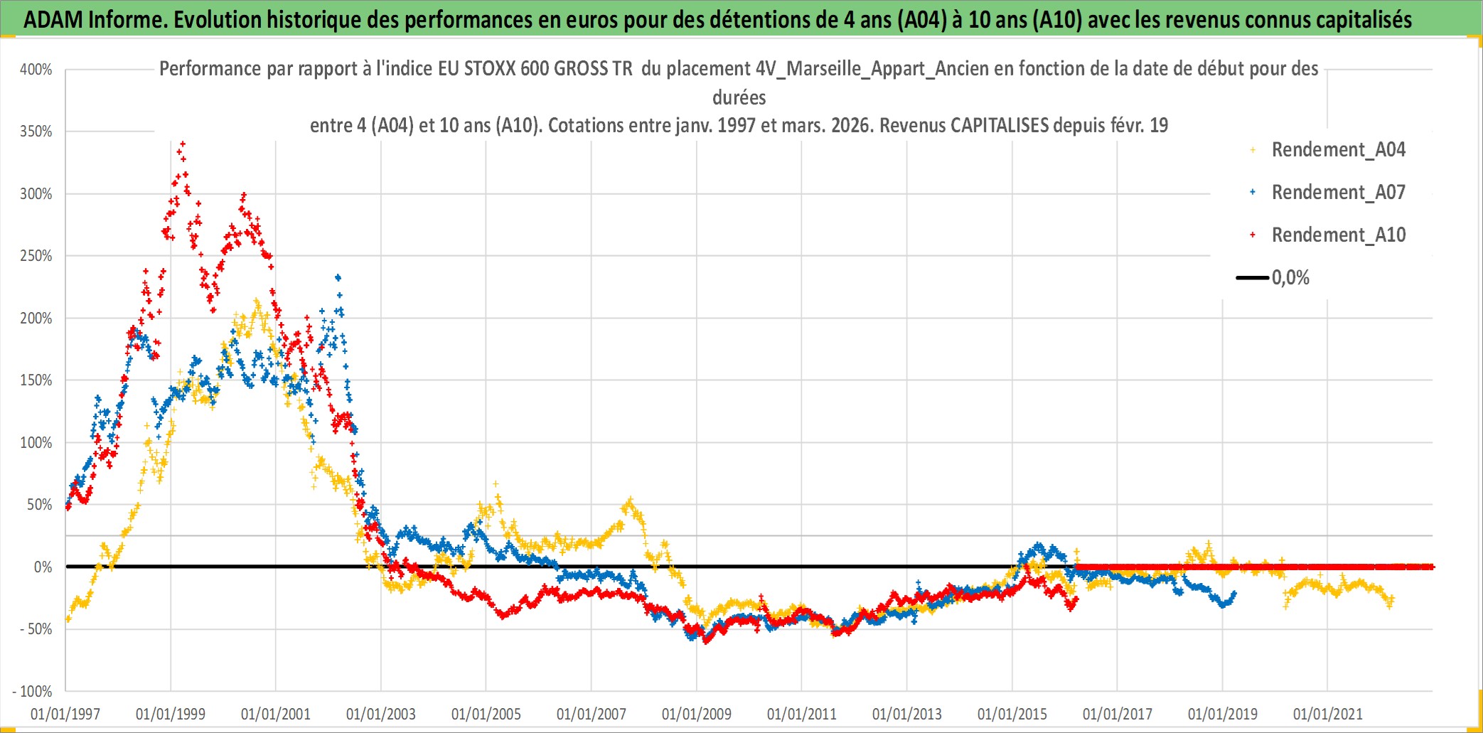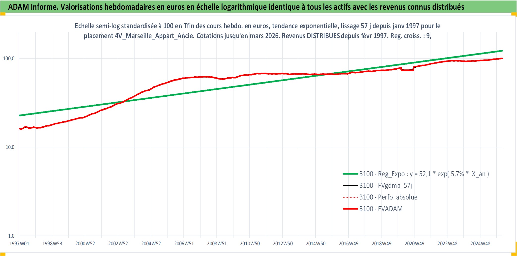 Site dédié aux investisseursPage dédiée sur site financeAnalyse des valorisations hebdomadaires de l'actif 4V_Marseille_Appart_Ancien. Cet actif est cote en EUR. Les valorisations couvrent les semaines 1997W01 a 2026W13. Les loyers de cet actif immobilier sont pris egaux a 3,33% annuels de la valeur venale du logement.