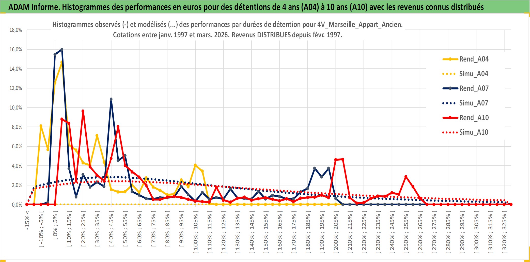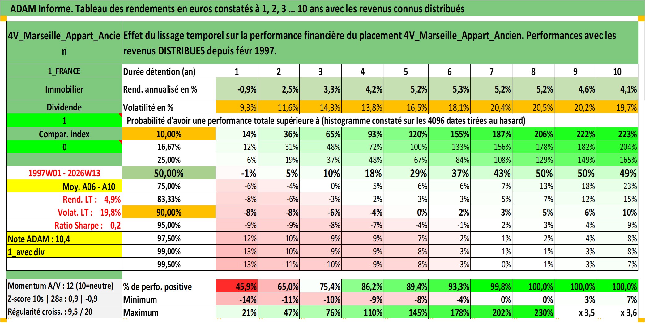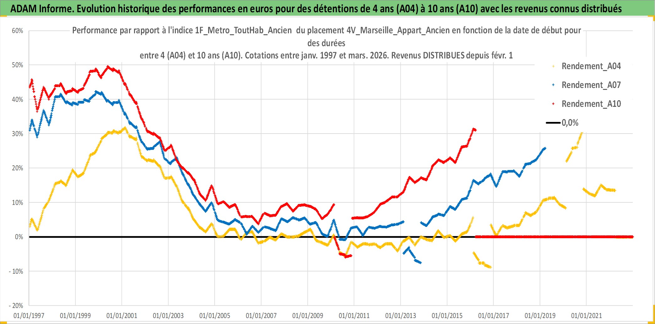 Site dédié aux investisseursPage dédiée sur site financeAnalyse des valorisations hebdomadaires de l'actif 4V_Marseille_Appart_Ancien. Cet actif est cote en EUR. Les valorisations couvrent les semaines 1997W01 a 2026W13. Les loyers de cet actif immobilier sont pris egaux a 3,33% annuels de la valeur venale du logement.