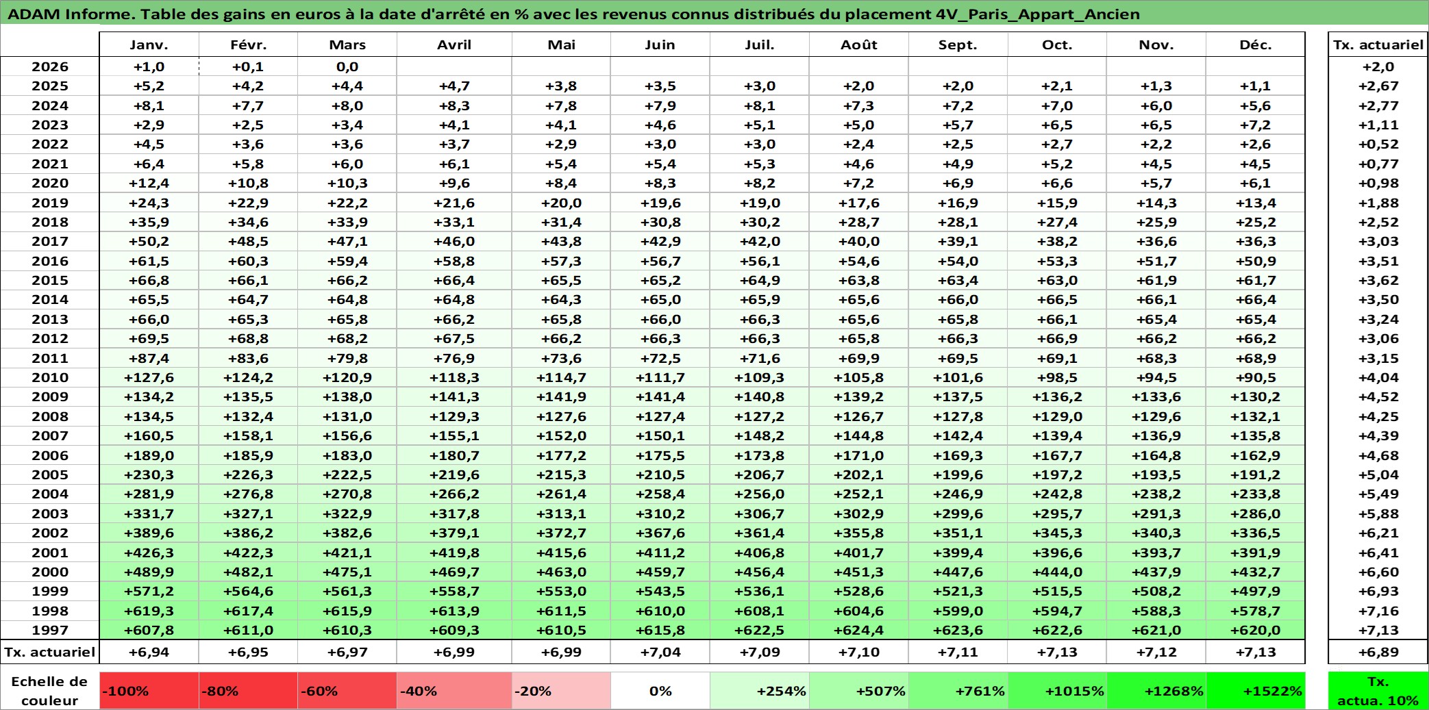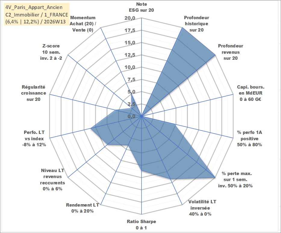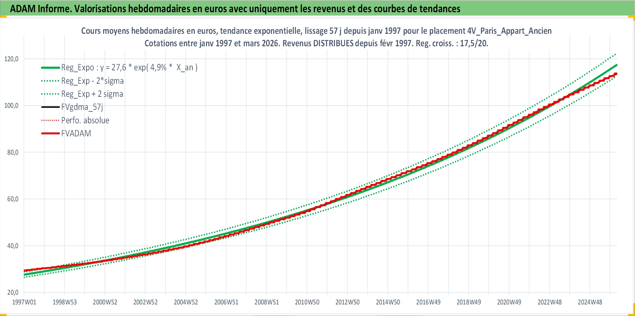 Site dédié aux investisseursPage dédiée sur site financeAnalyse des valorisations hebdomadaires de l'actif 4V_Paris_Appart_Ancien. Cet actif est cote en EUR. Les valorisations couvrent les semaines 1997W01 a 2026W13. Les loyers de cet actif immobilier sont pris egaux a 3,33% annuels de la valeur venale du logement.