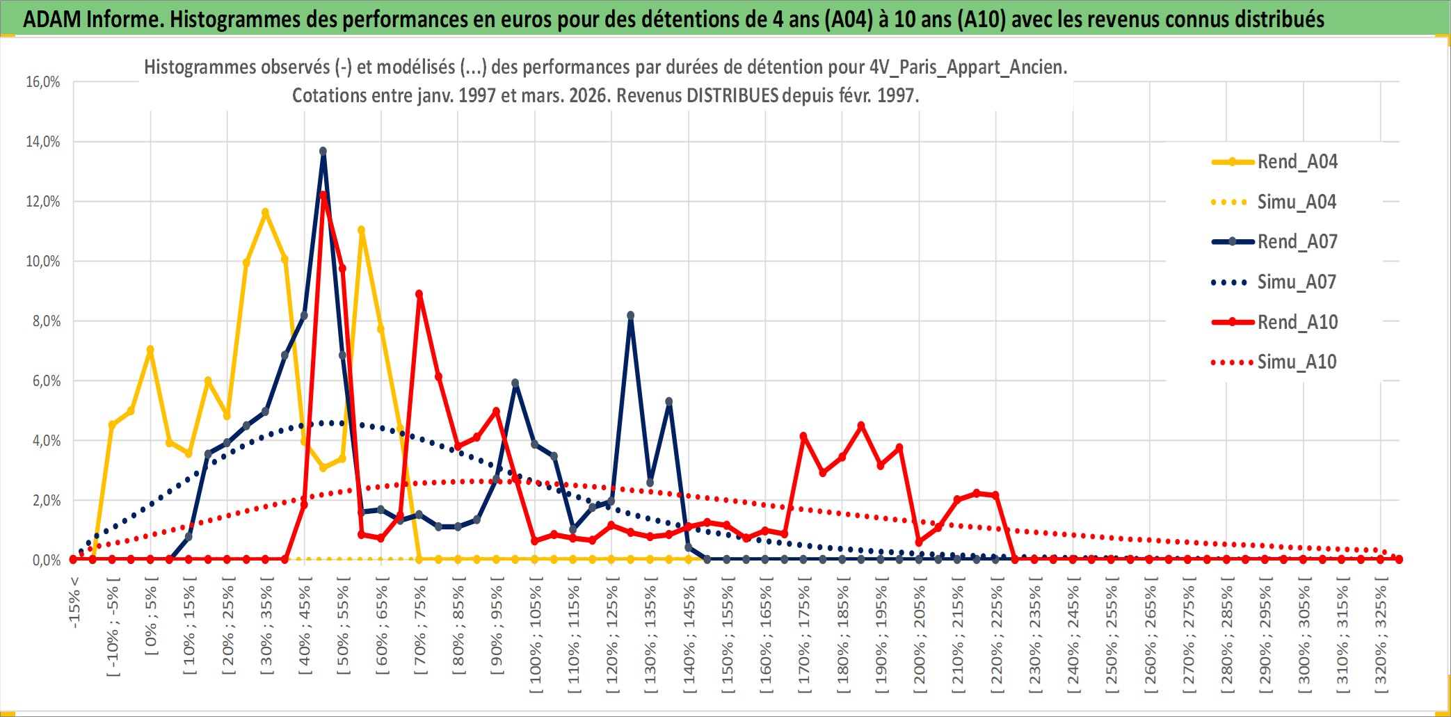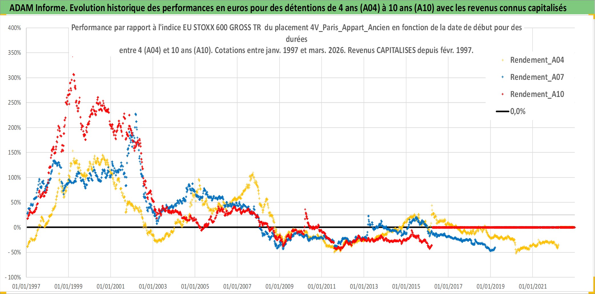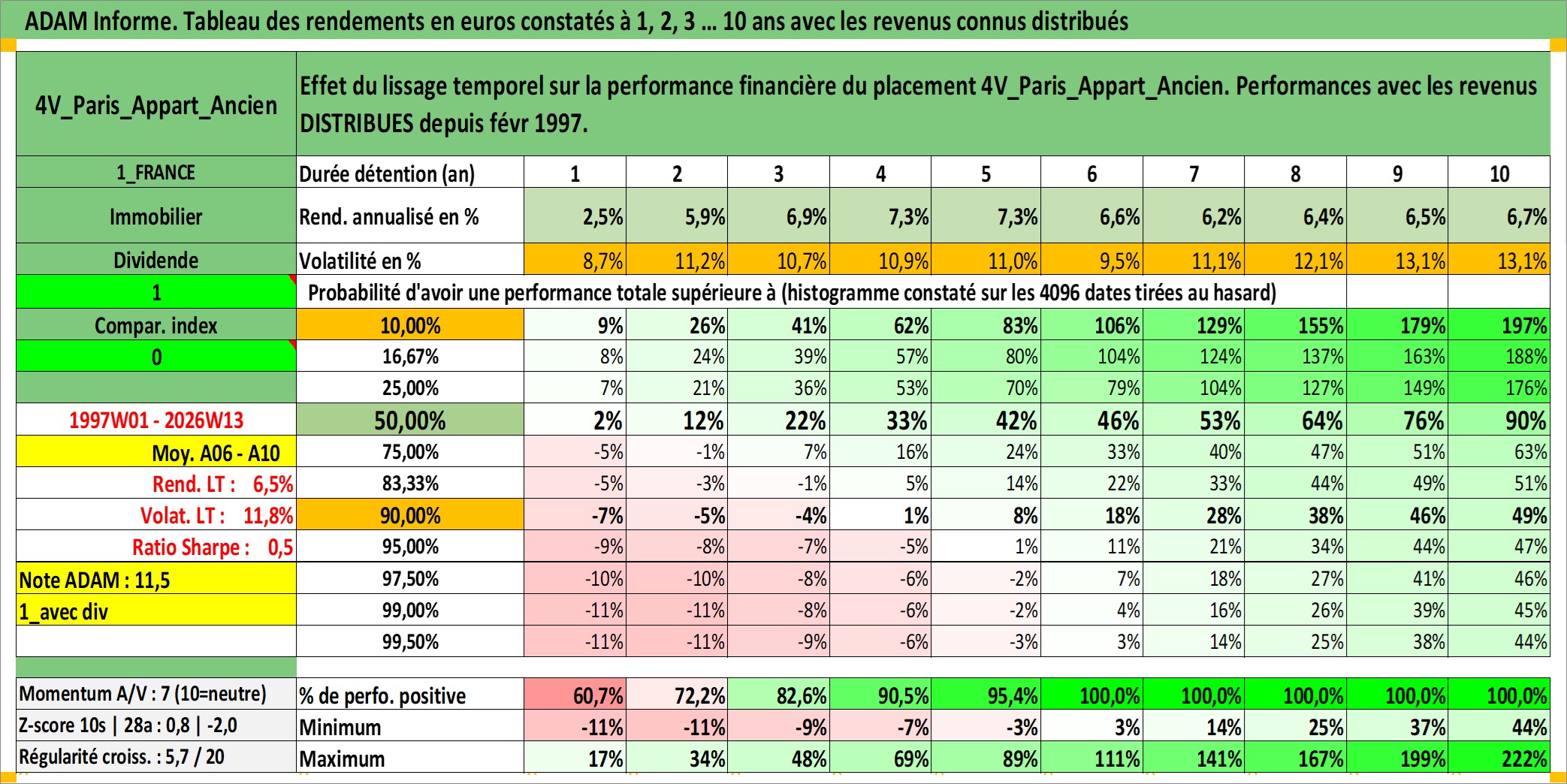 Site dédié aux investisseursPage dédiée sur site financeAnalyse des valorisations hebdomadaires de l'actif 4V_Paris_Appart_Ancien. Cet actif est cote en EUR. Les valorisations couvrent les semaines 1997W01 a 2026W13. Les loyers de cet actif immobilier sont pris egaux a 3,33% annuels de la valeur venale du logement.
