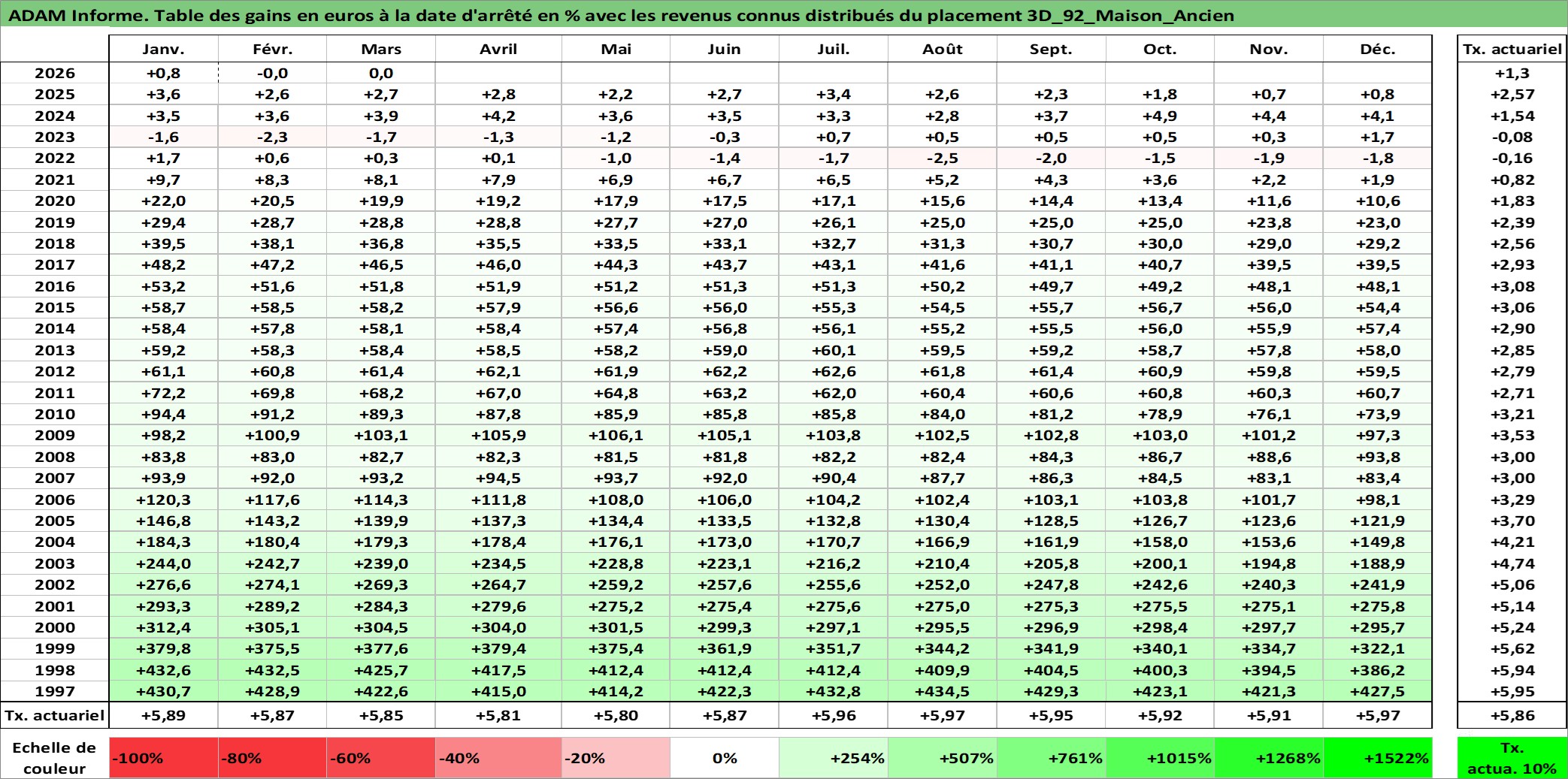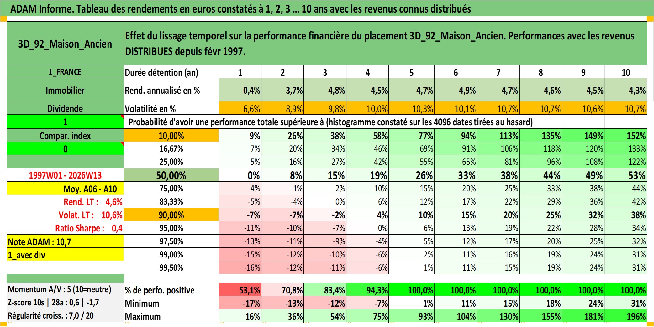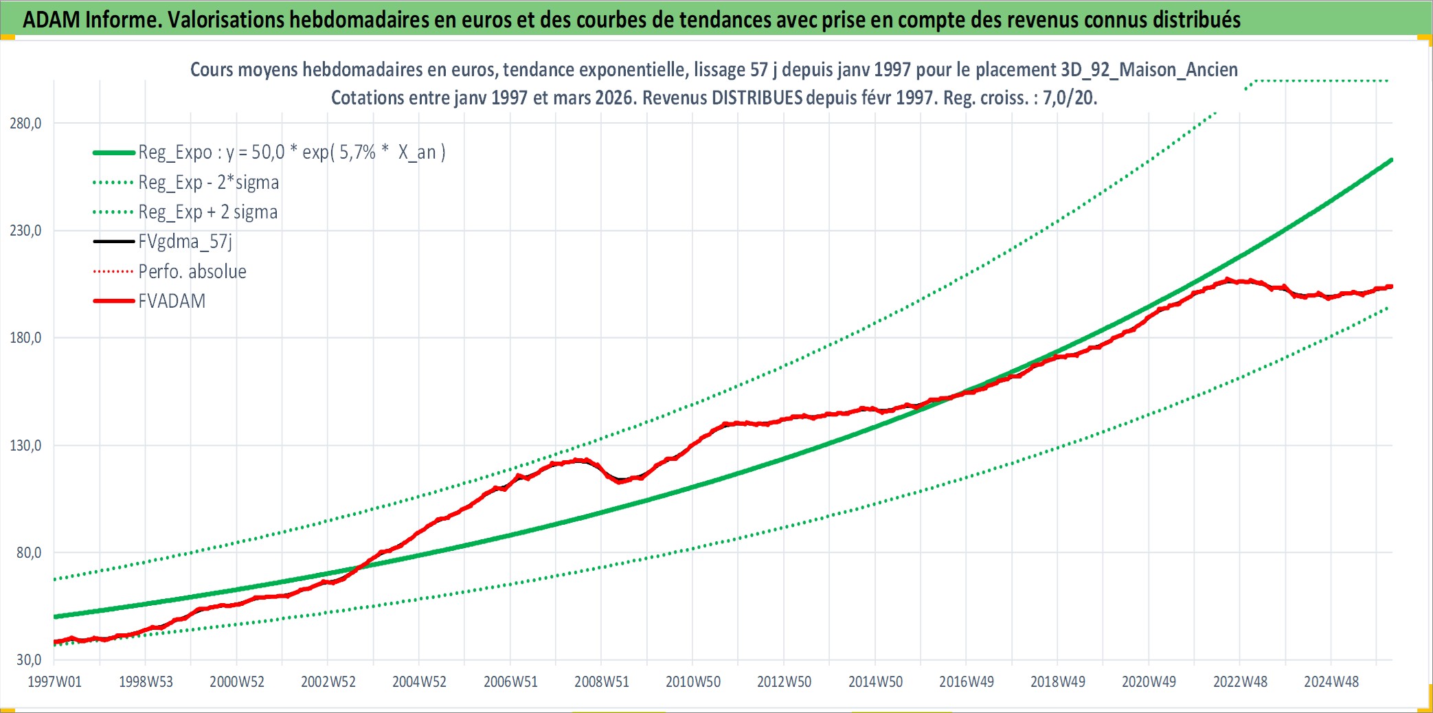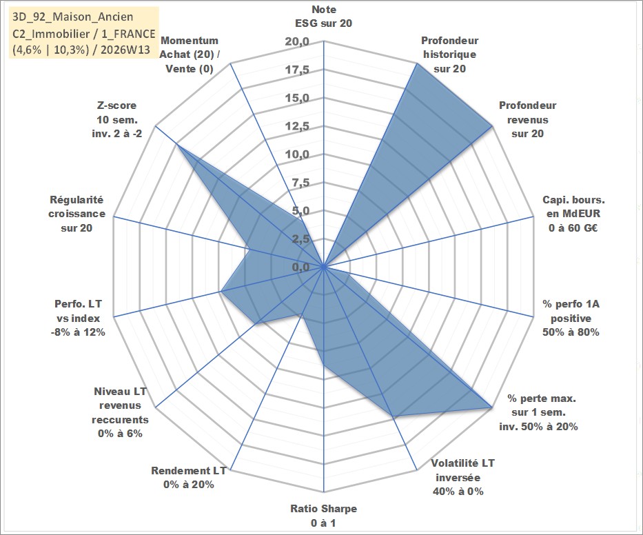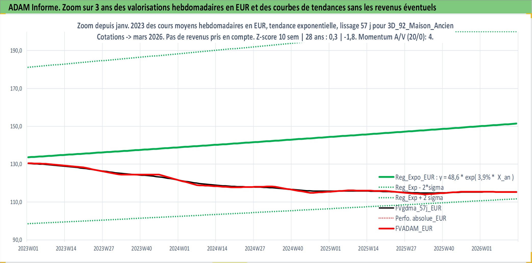 Site dédié aux investisseursPage dédiée sur site financeAnalyse des valorisations hebdomadaires de l'actif 3D_92_Maison_Ancien. Cet actif est cote en EUR. Les valorisations couvrent les semaines 1997W01 a 2026W13. Les loyers de cet actif immobilier sont pris egaux a 3,33% annuels de la valeur venale du logement.