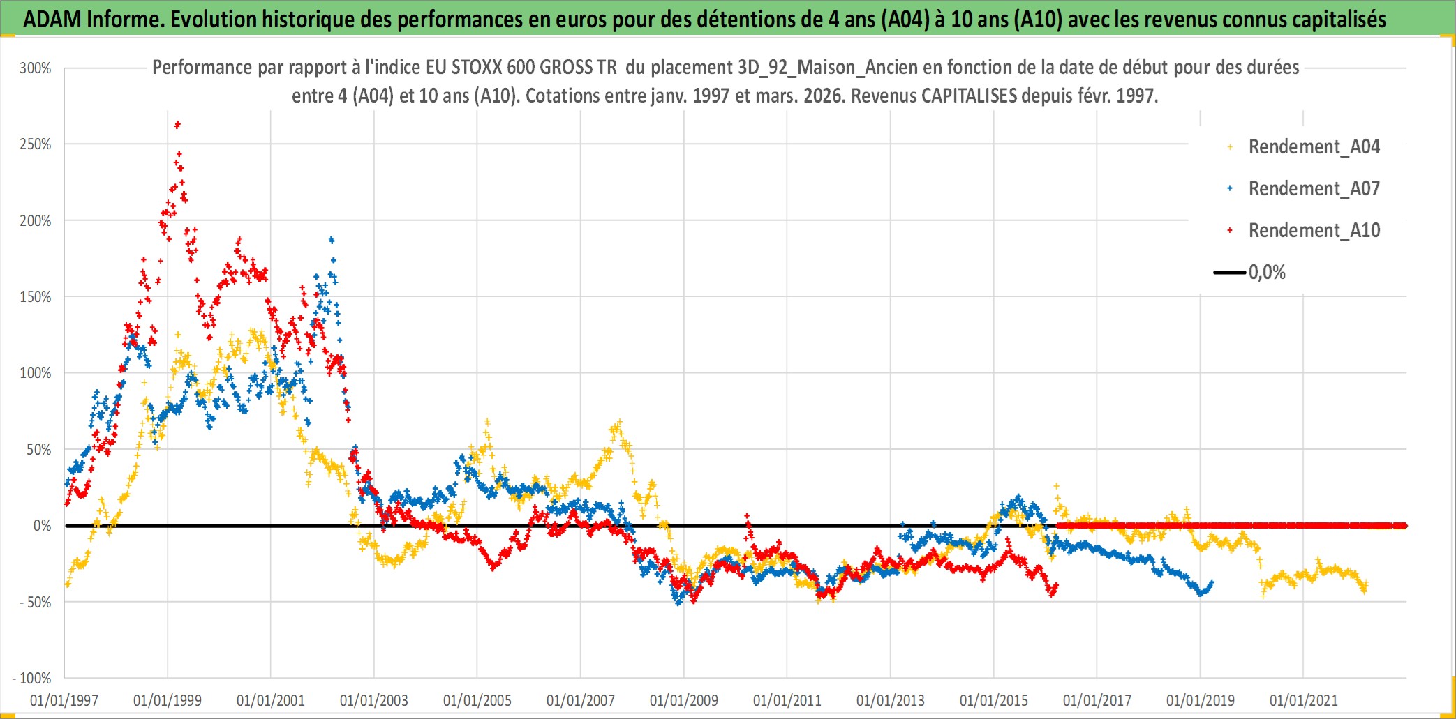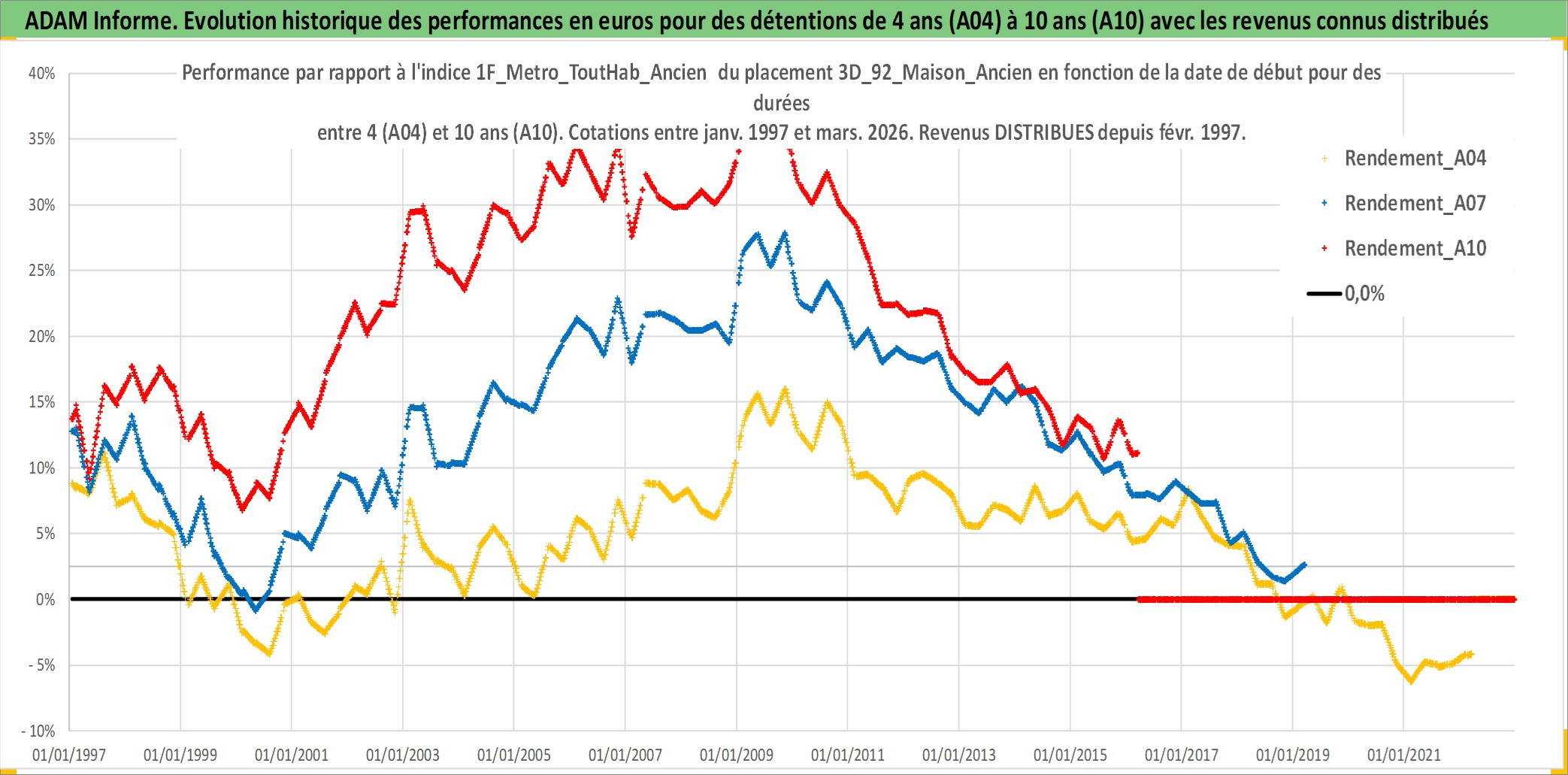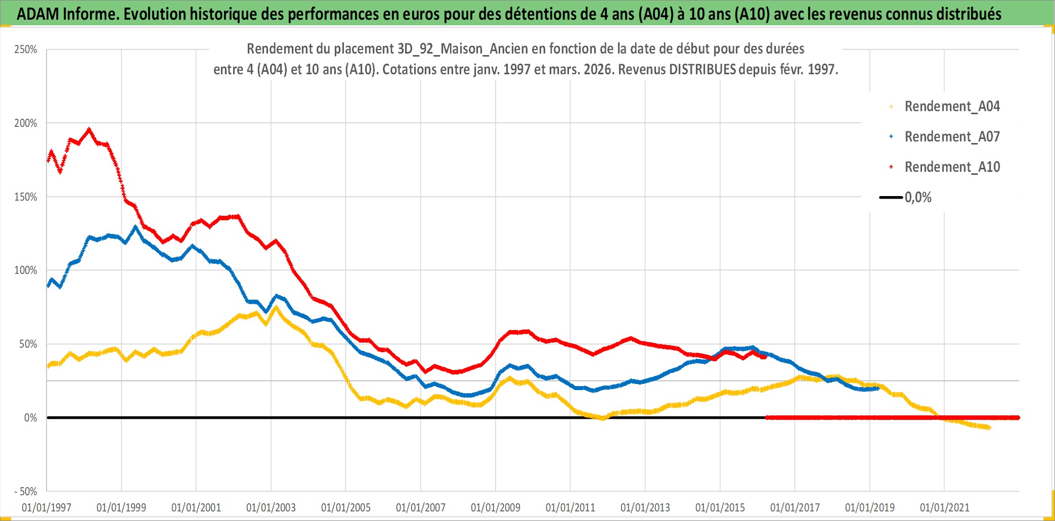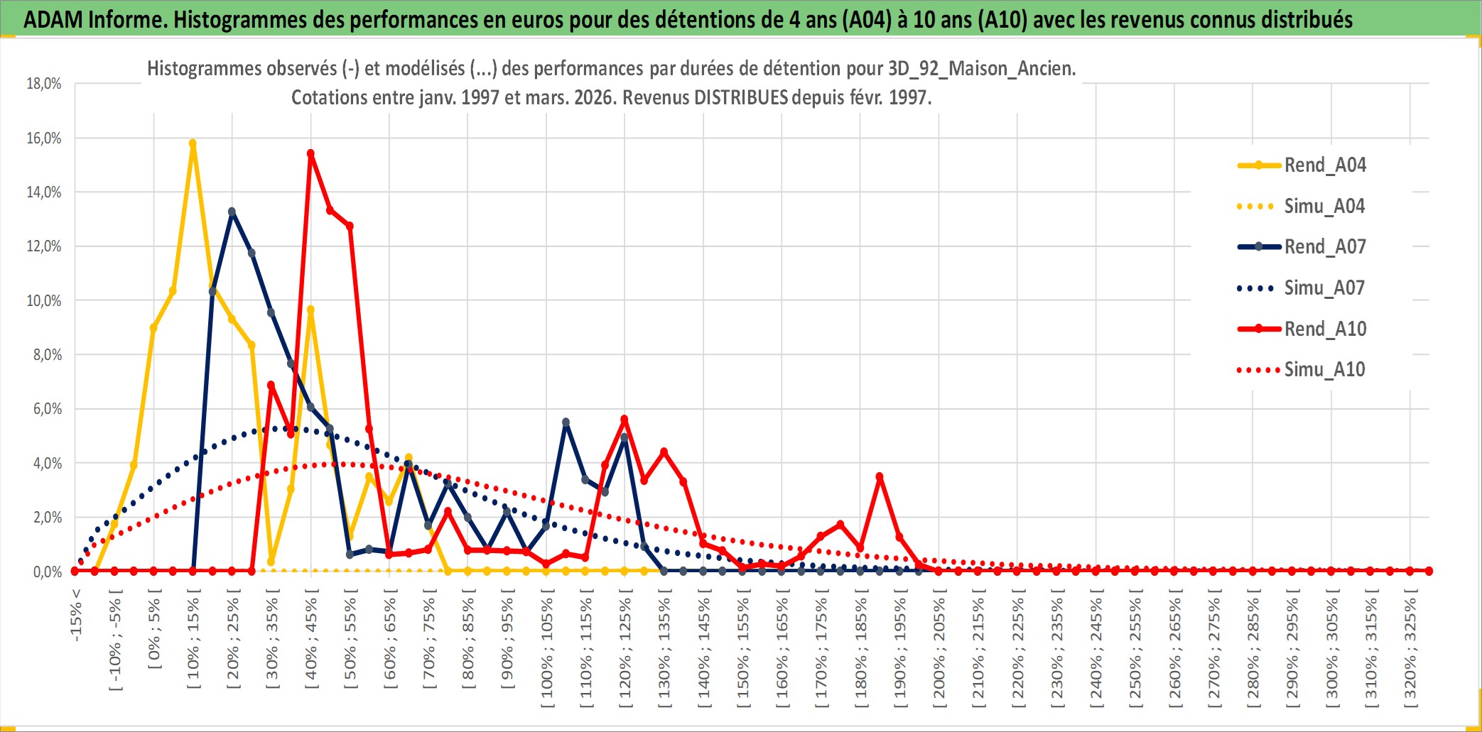 Site dédié aux investisseursPage dédiée sur site financeAnalyse des valorisations hebdomadaires de l'actif 3D_92_Maison_Ancien. Cet actif est cote en EUR. Les valorisations couvrent les semaines 1997W01 a 2026W13. Les loyers de cet actif immobilier sont pris egaux a 3,33% annuels de la valeur venale du logement.