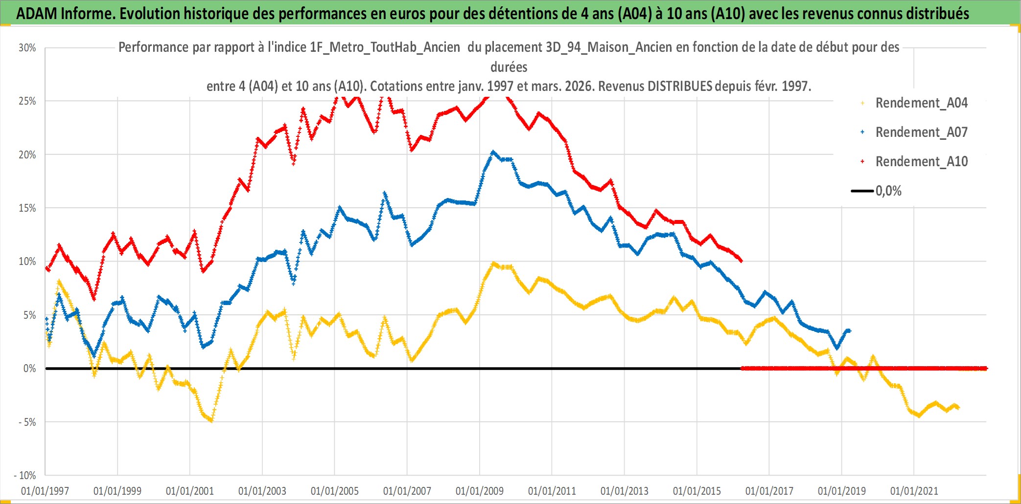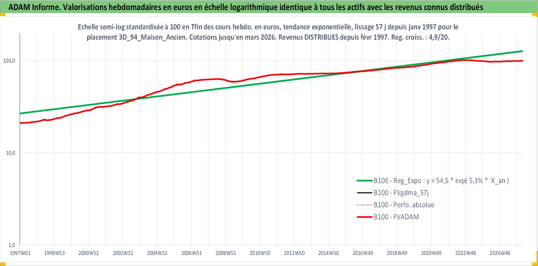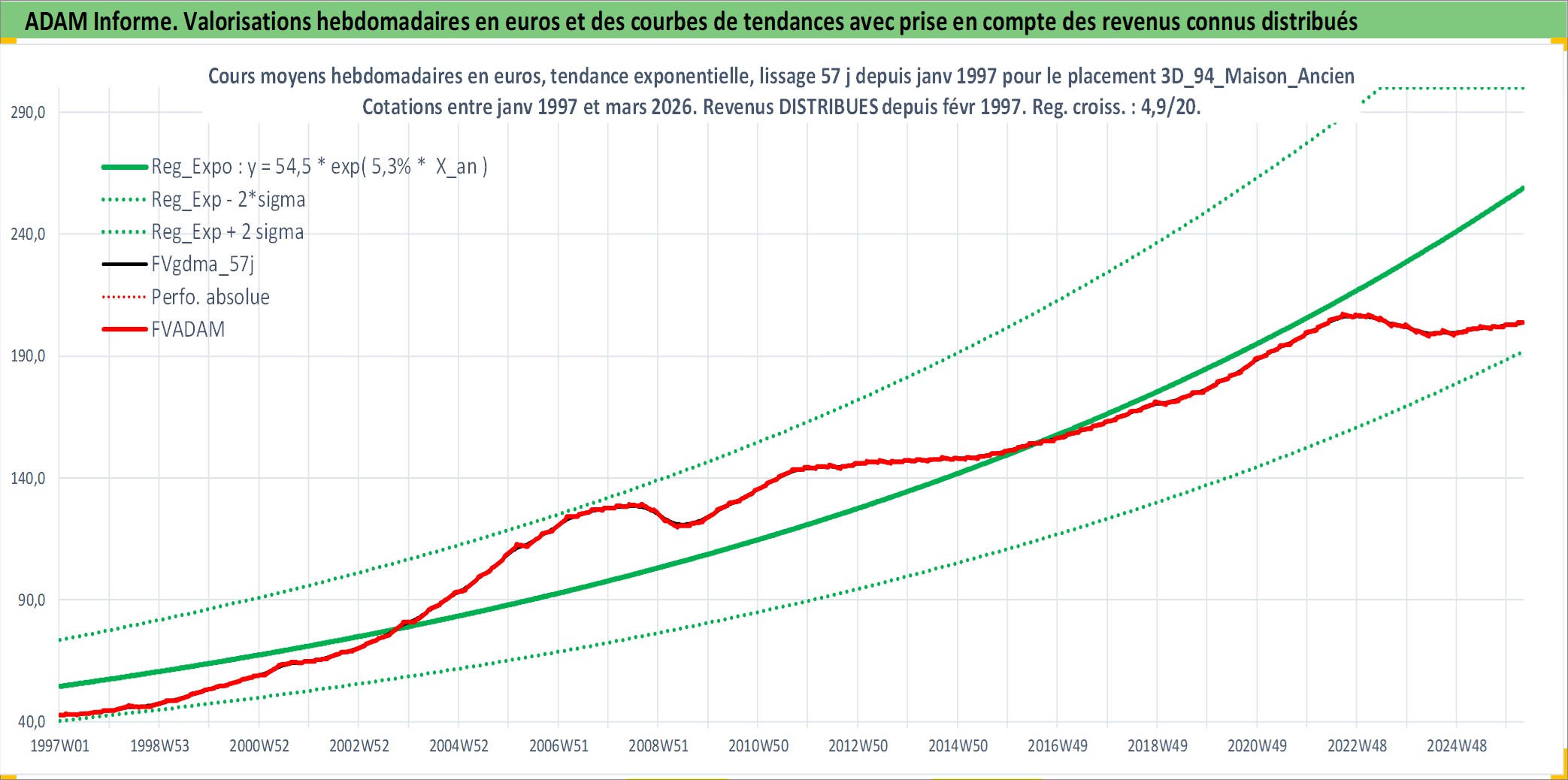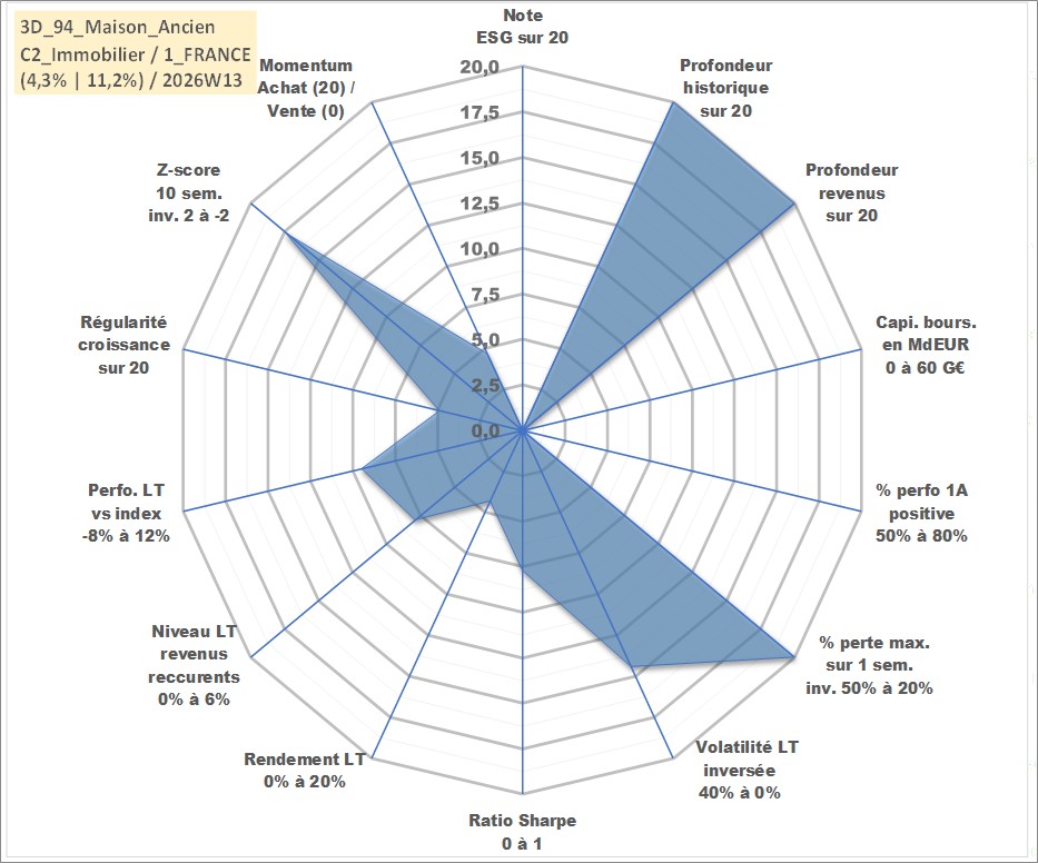 Site dédié aux investisseursPage dédiée sur site financeAnalyse des valorisations hebdomadaires de l'actif 3D_94_Maison_Ancien. Cet actif est cote en EUR. Les valorisations couvrent les semaines 1997W01 a 2026W13. Les loyers de cet actif immobilier sont pris egaux a 3,33% annuels de la valeur venale du logement.